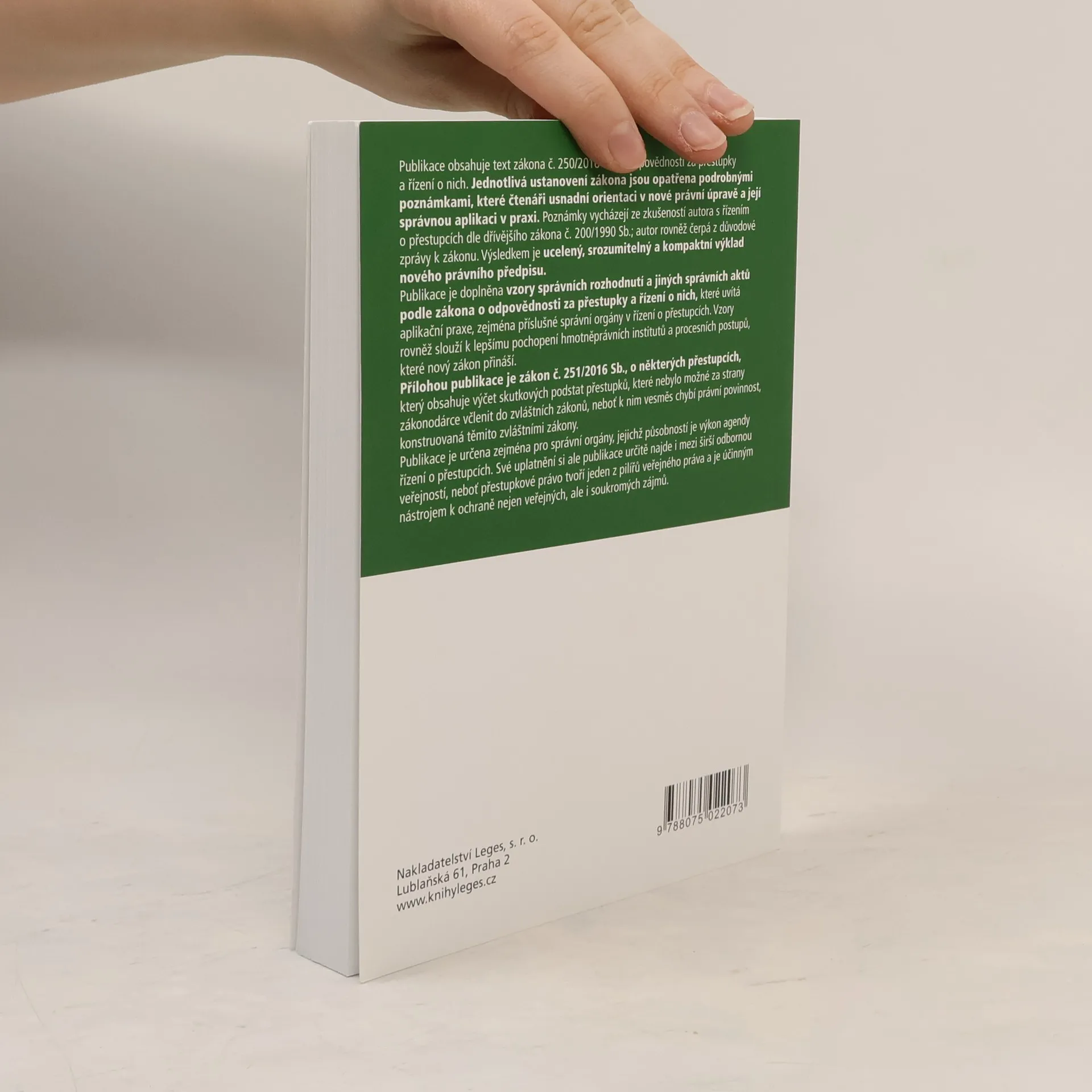 Publikace obsahuje text zákona č. 250/2016 Sb., o odpovědnosti za přestupky a řízení o nich. Jednotlivá ustanovení zákona jsou opatřena podrobnými poznámkami, které čtenáři usnadní orientaci v nové právní úpravě a její správnou aplikaci v praxi. Poznámky vycházejí ze zkušeností autoras řízením o přestupcích dle dřívějšího zákona č. 200/1990 Sb.; autor rovněž čerpá z důvodové zprávy k zákonu. Výsledkem je ucelený, srozumitelný a kompaktní výklad nového právního předpisu. Publikace je doplněna vzory správních rozhodnutí a jiných správních aktů podle zákona o odpovědnosti za přestupky a řízení o nich, které uvítá aplikační praxe, zejména příslušné správní orgány v řízení o přestupcích. Vzory rovněž slouží k lepšímu pochopení hmotněprávních institutů a procesních postupů, které nový zákon přináší. Přílohou publikace je zákon č. 251/2016 Sb., o některých přestupcích, který obsahuje výčet skutkových podstat přestupků, které nebylo možné za strany zákonodárce včlenit do zvláštních zákonů, neboť k nim vesměs chybí právní povinnost, konstruovaná těmito zvláštními zákony. Publikace je určena zejména pro správní orgány, jejichž působností je výkon agendy řízení o přestupcích. Své uplatnění si ale publikace určitě najde i mezi širší odbornou veřejností, neboť přestupkové právo tvoří jeden z pilířů veřejného práva a je účinným nástrojem k ochraně nejen veřejných, ale i soukromých zájmů.