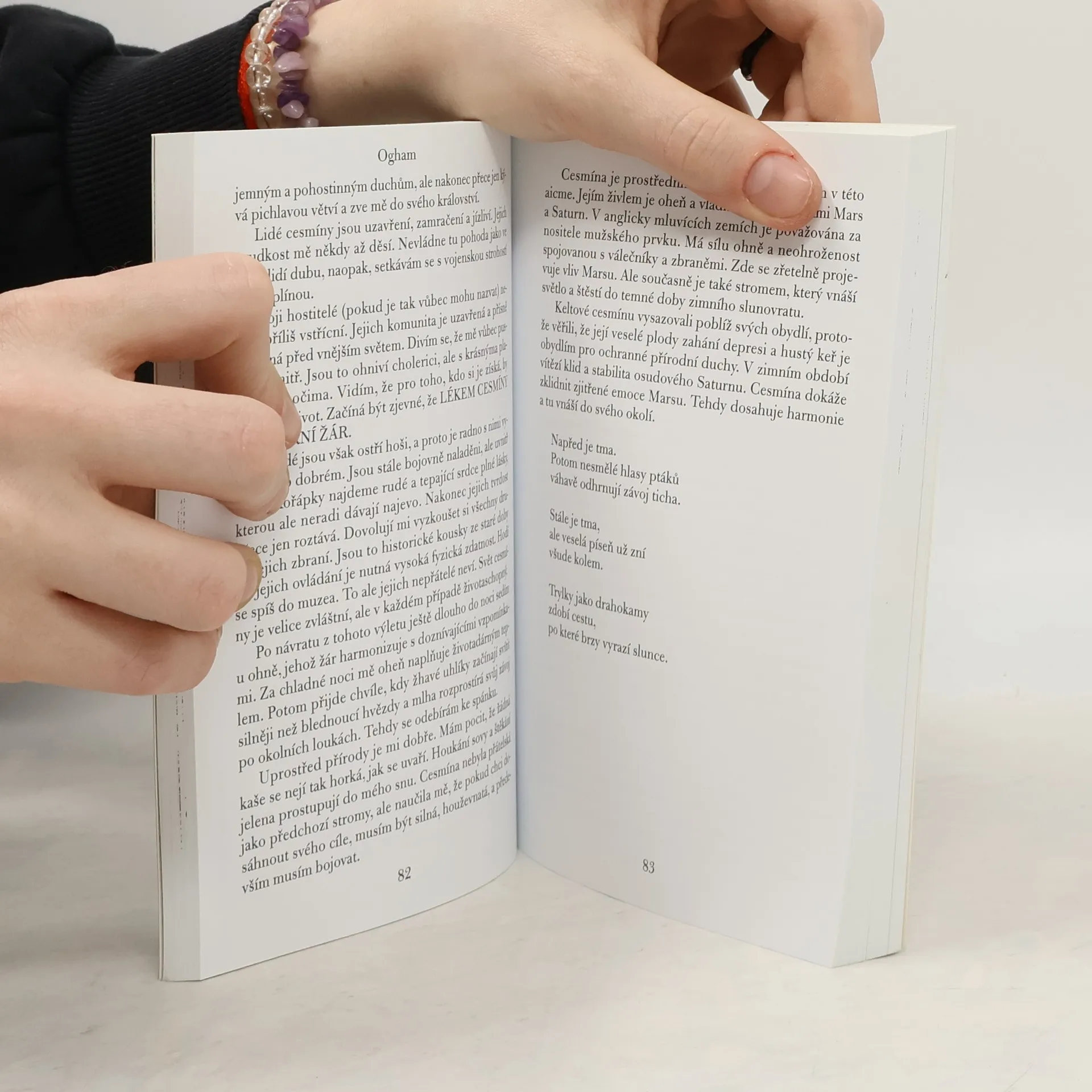 Ogham je dávný dorozumívací systém. Podobně jako písmo starých Mayů, starých Egypťanů nebo severské runy musí být zkoumán v kontextu s místem a s životem společnosti, kde vznikl. Ogham vytvořili dávní druidové, kněžský řád keltské společnosti. Ta žila v těsném sepětí s přírodou a na ní je také založen celý tento sofistikovaný systém. Tajemnou abecedu v této knížce přibližujeme krok za krokem, nebo chcete-li, strom za stromem. Dávný systém se vynořuje z mlhy zapomnění jako cesta, po které putuje mladá druidka. Dávná tajemství vyplouvají na povrch v magických vizích a příbězích vyprávěných duchem lesa a duchem jednotlivých stromů, které vroubí cestu naší krajinou, po které kdysi Keltové mířili na západ.
