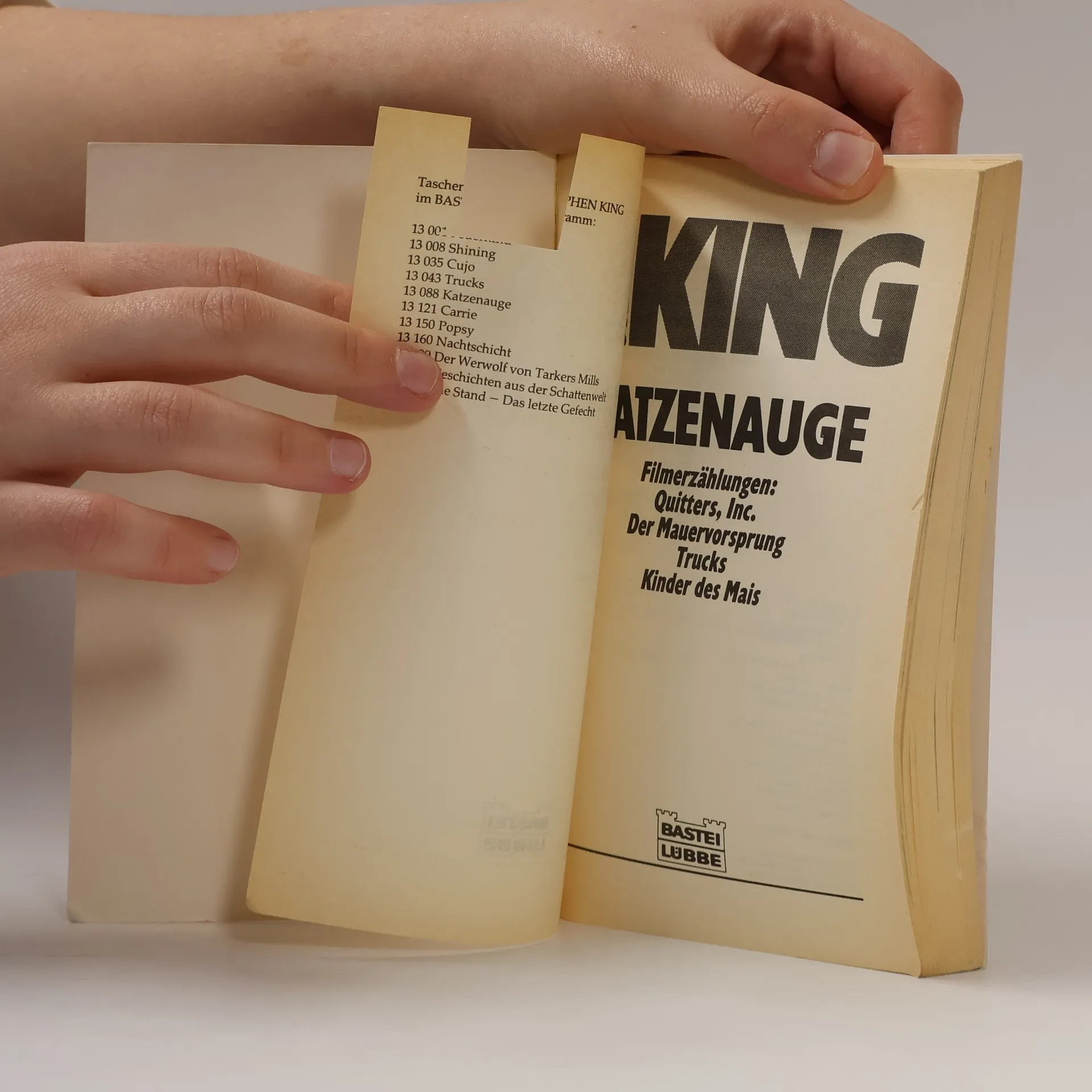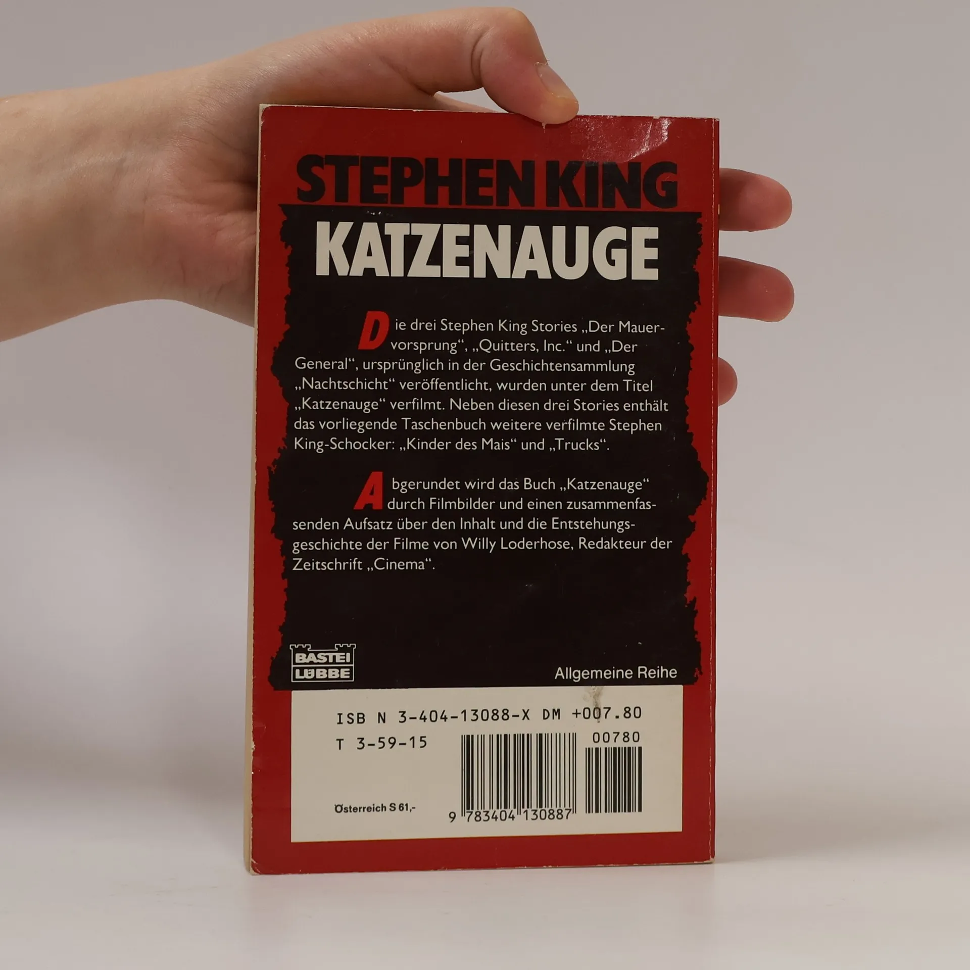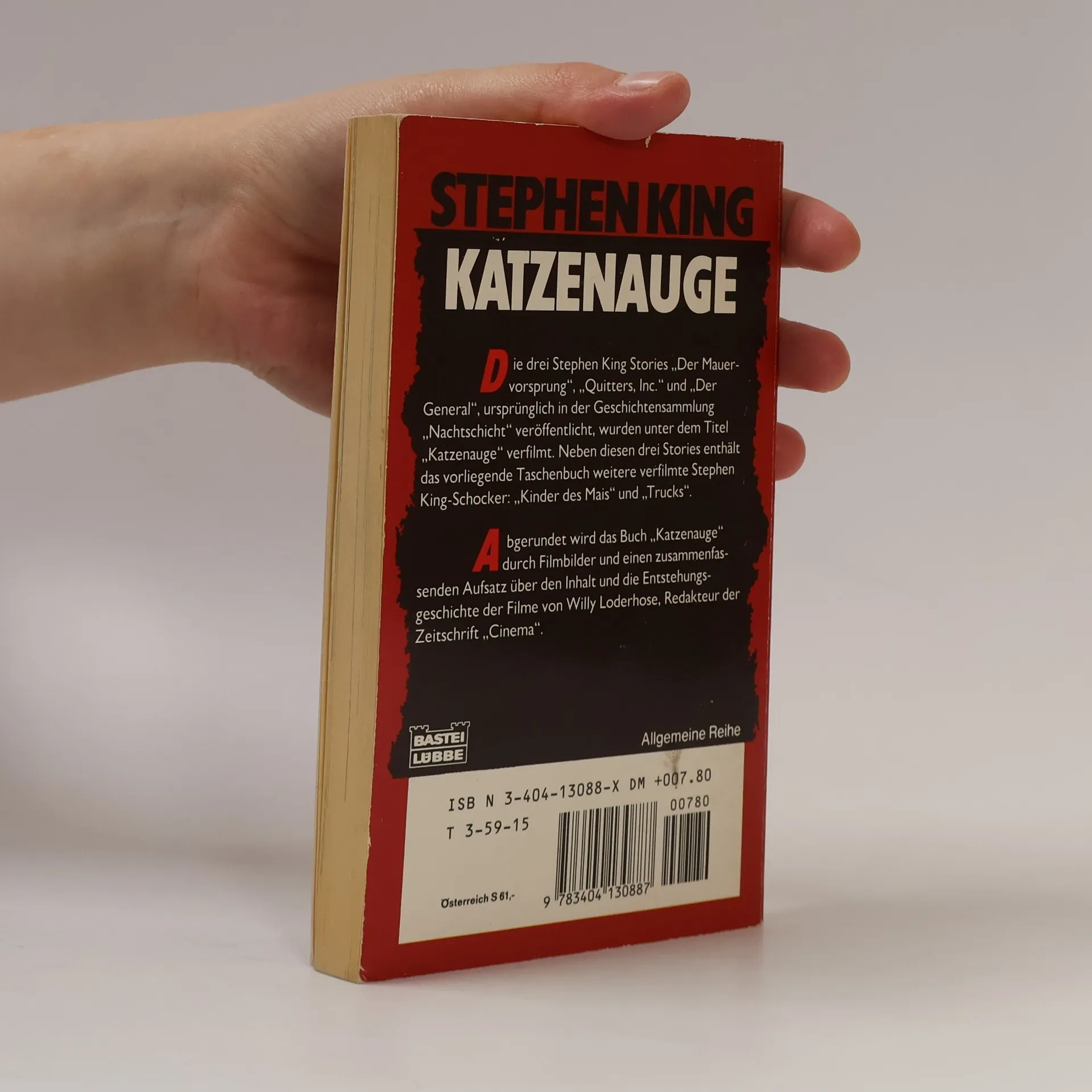 - Quitters, Inc.- Der Mauervorsprung- Trucks- Kinder des MaisNiemand kennt die Abgründe der Seele besser als der amerikanische Bestsellerautor Stephen King. Dies beweisen auch seine Erzählungen. Nicht nur die Leser, auch die Filmregissuere reißen sich um seine Geschichten. Abgerundet wird das vorliegende Buch durch einige Filmbilder und einen zusammenfassenden Aufsatz über den Inhalt und die Entstehungsgeschichte der Filme.