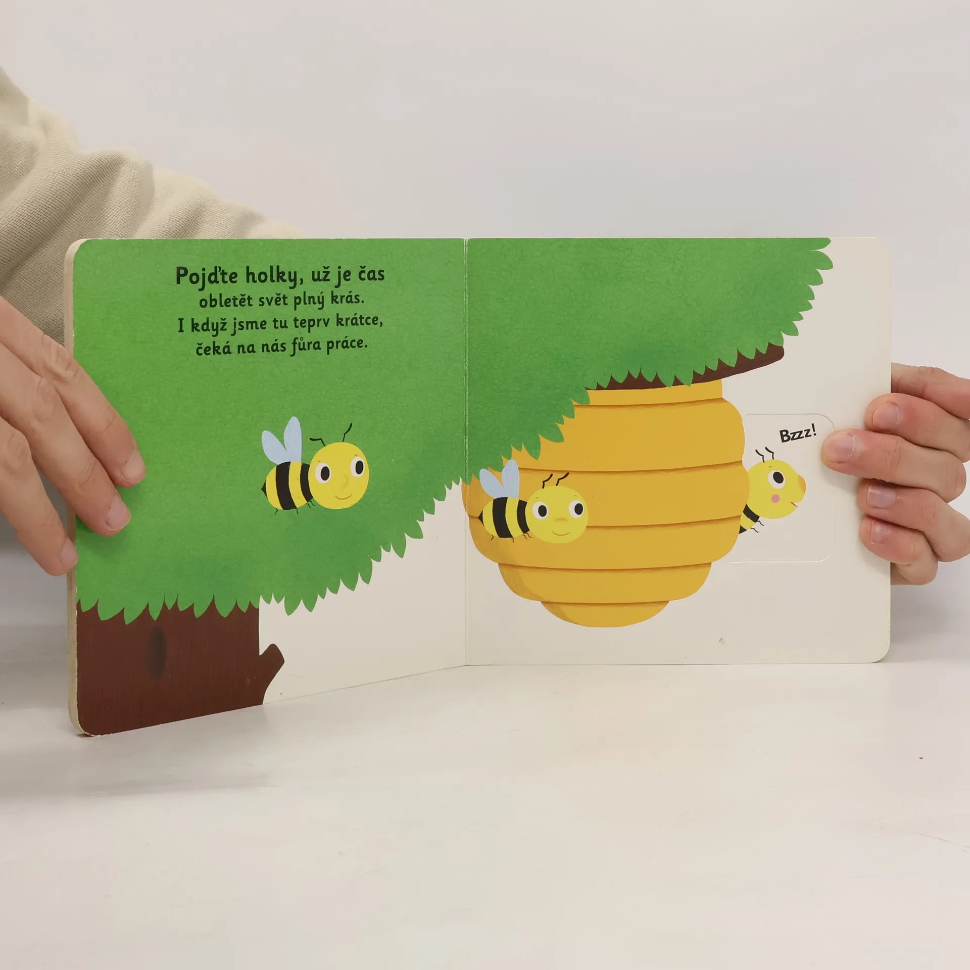 Copak dělá malá včelka, co všechno má dnes na práci? Poleťme s ní, možná bude potřebovat naši pomoc a něco nás naučí. Objevovat svět s tímto leporelem pro nejmenší děti od jednoho roku je tak zábavné! Pevné stránky s pohyblivými prvky procvičí i jemnou motoriku. Stačí vložit prstík do správného otvoru a lehce vysunout, zatáhnout nebo otočit a hned bude váš malý objevitel znát odpovědi. Knížka s prvky Montessori.