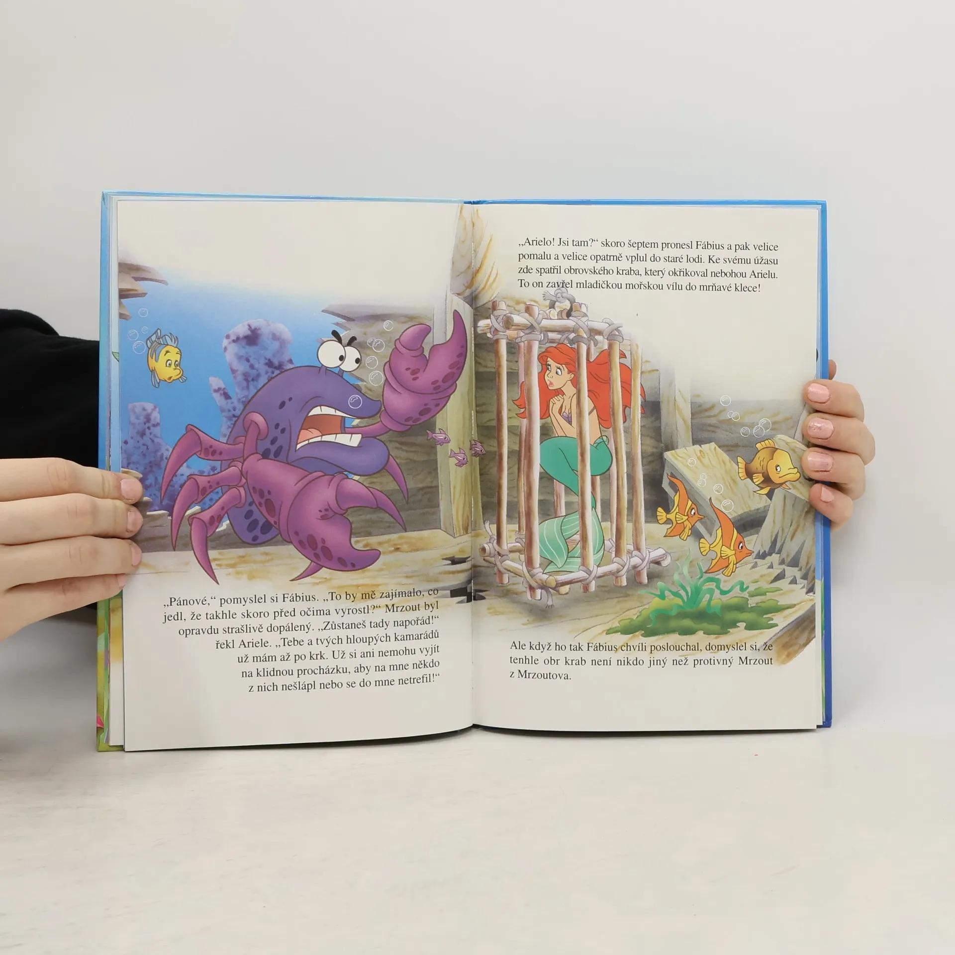 Ariela si hraje s platýsem Fábiem a kosatkou Puntíkem. Přitom trefí míčem kraba Mrzouta. I když se omlouvá, nevrlý krab jí slibuje pomstu. Král Tritón později nešťastnou náhodou kraba magicky zvětší – a obří korýš Arielu unese a uvězní.