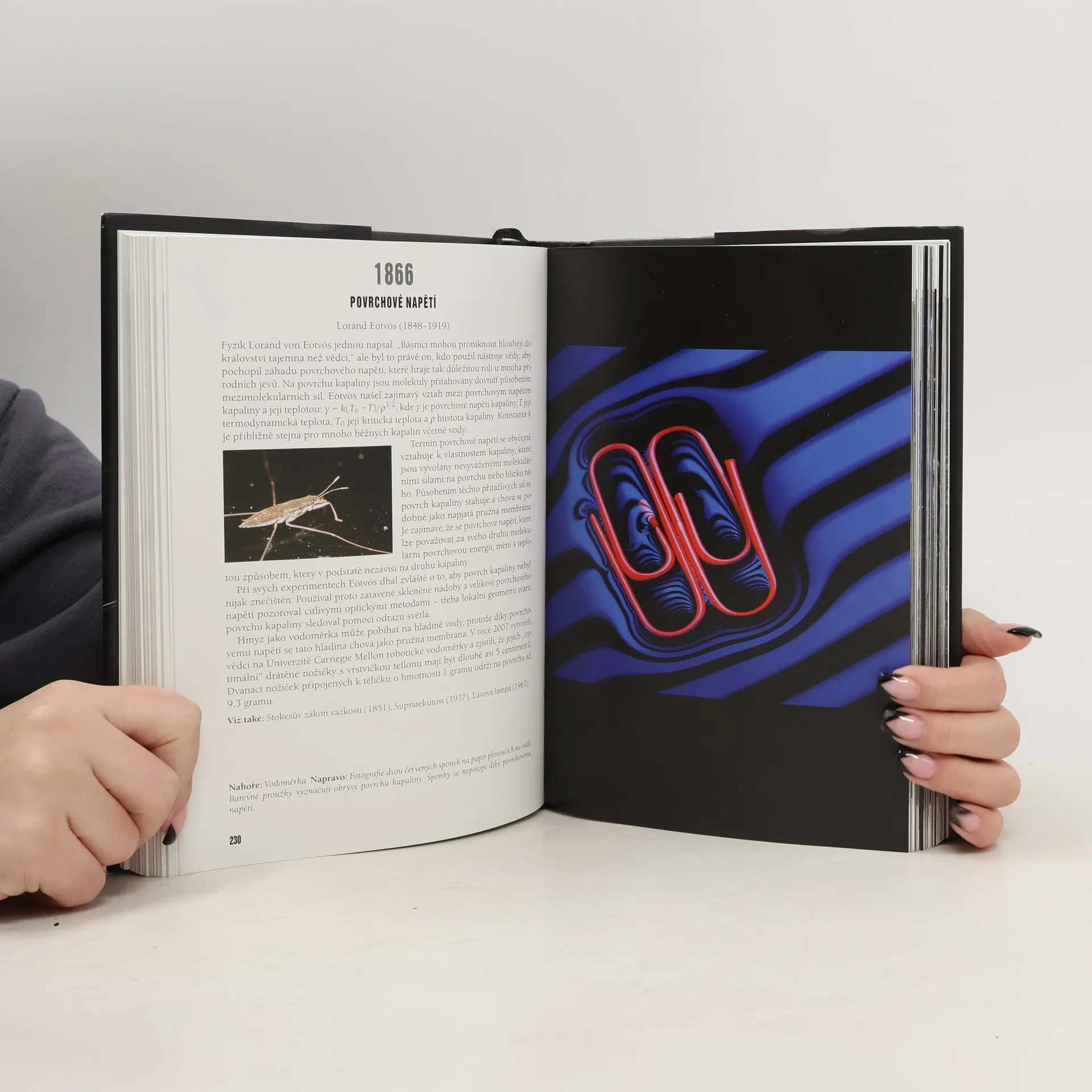 Kniha Clifforda A. Pickovera, autora bestselleru Matematická kniha, představuje velkolepou mozaiku atraktivních témat z historie fyziky a přírody od velkého třesku až po vzdálenou budoucnost ztrácející se kdesi v nekonečnu. Každému tématu je věnován poměrně stručný, ale výstižný text a celostránková barevná ilustrace. Jednotlivá témata se týkají fyzikálních zkušeností a objevů člověka za celou dobu jeho existence a jejich často překvapivému praktickému využití, ale také obecných až filozofických pohledů na přírodu a její tajemství. Dočteme se tu o vynálezu bumerangu, záhadné baterii z Bagdádu, pokusech sestrojit perpetuum mobile, o černých dírách, obřích vlnách na oceánech, podivuhodných solitonech, zjeví se nám Maxwellův démon i Schrödingerova kočka, budeme obdivovat zelený paprsek nebo nejčernější čerň, ale dozvíme se také, co způsobuje práskání bičem, proč se kýve čínská kachna nebo jak se pohybuje golfový míček. Přes zdánlivou roztříštěnost jednotlivých témat je spojuje vnitřní logika a systém vzájemných odkazů.
