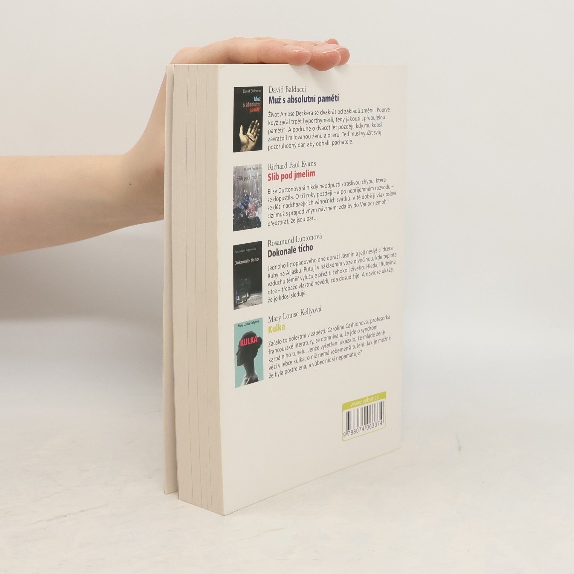 Svazek obsahuje zkrácené verze čtyř úspěšných románů oddychových žánrů od současných angloamerických autorů. Jednotlivé tituly jsou doplněny stručnými informacemi o jejich tvůrcích. Hrdinou thrilleru „Muž s absolutní pamětí“ Davida baldacciho je Amos Decker, jenž dostal do života danajský dar - hypertrofovanou paměť, schopnou uchovat neuvěřitelné množství informací. Když ho neznámý vrah připraví o ženu a dceru, možná se Amosova anomálie bude hodit. Romantický žánr zastupuje Richard Paul Evans románem „Slib pod jmelím“. Čerstvě rozvedená, osamělá hrdinka je v něm překvapena návrhem neznámého muže předstírat v předvánoční době, že je jeho partnerkou. Kdo ví, k čemu takové předstírání může nakonec vést... „Dokonalé ticho“ anglické autorky Rosamund Luptonové je thriller o putování matky s hluchou dcerou polární krajinou za otcem, který se ztratil při požáru inuitské vesnice na severu Aljašky. Detektivní thriller „Kulka“ od Mary Louise Kellyové pracuje s motivem postupného odhalování doposud skryté záhadné minulosti hlavní hrdinky Caroline Cashionové, ve které se skrývá nevyřešený zločin.