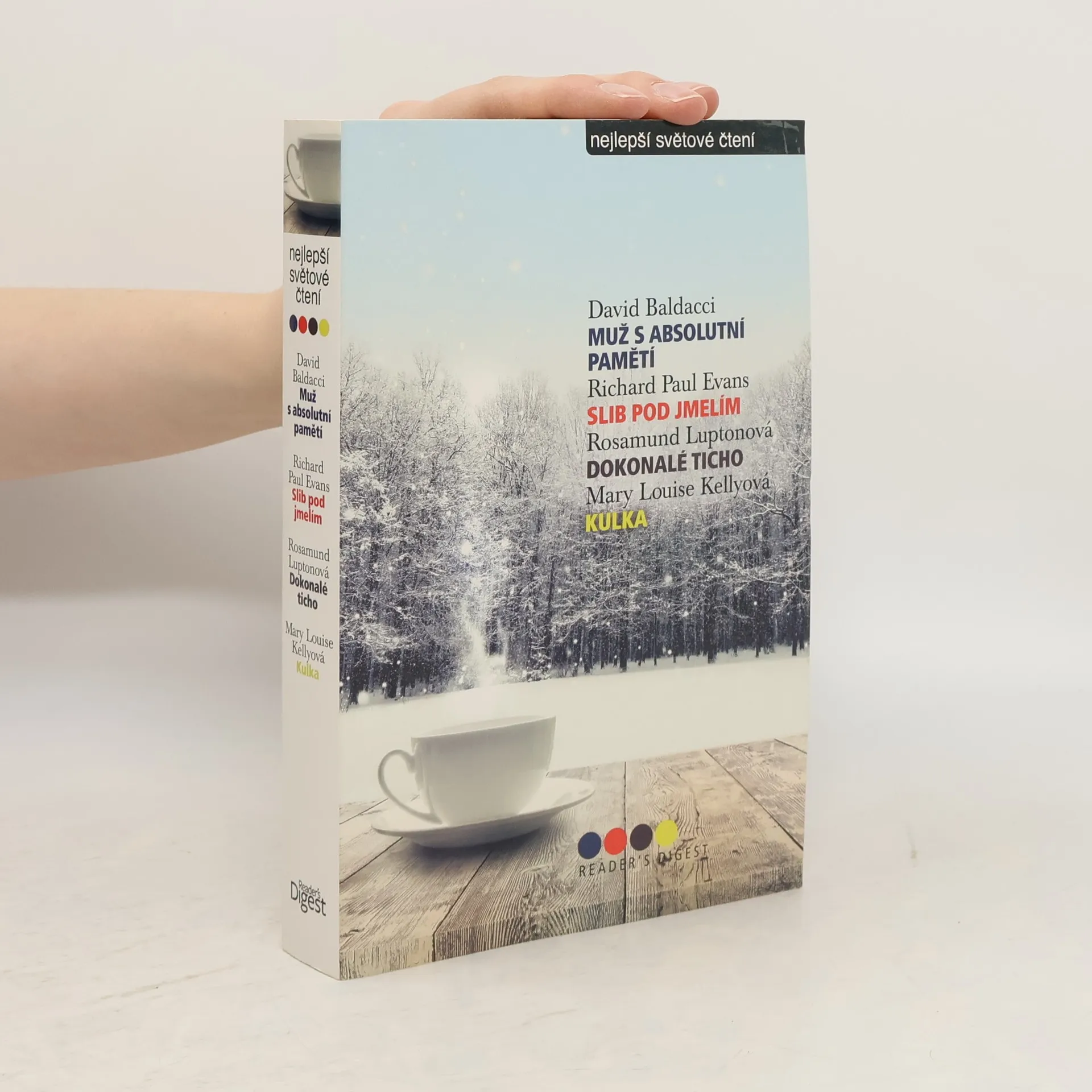 Svazek obsahuje zkrácené verze čtyř úspěšných románů oddychových žánrů od současných angloamerických autorů. Jednotlivé tituly jsou doplněny stručnými informacemi o jejich tvůrcích. Hrdinou thrilleru „Muž s absolutní pamětí“ Davida baldacciho je Amos Decker, jenž dostal do života danajský dar - hypertrofovanou paměť, schopnou uchovat neuvěřitelné množství informací. Když ho neznámý vrah připraví o ženu a dceru, možná se Amosova anomálie bude hodit. Romantický žánr zastupuje Richard Paul Evans románem „Slib pod jmelím“. Čerstvě rozvedená, osamělá hrdinka je v něm překvapena návrhem neznámého muže předstírat v předvánoční době, že je jeho partnerkou. Kdo ví, k čemu takové předstírání může nakonec vést... „Dokonalé ticho“ anglické autorky Rosamund Luptonové je thriller o putování matky s hluchou dcerou polární krajinou za otcem, který se ztratil při požáru inuitské vesnice na severu Aljašky. Detektivní thriller „Kulka“ od Mary Louise Kellyové pracuje s motivem postupného odhalování doposud skryté záhadné minulosti hlavní hrdinky Caroline Cashionové, ve které se skrývá nevyřešený zločin.