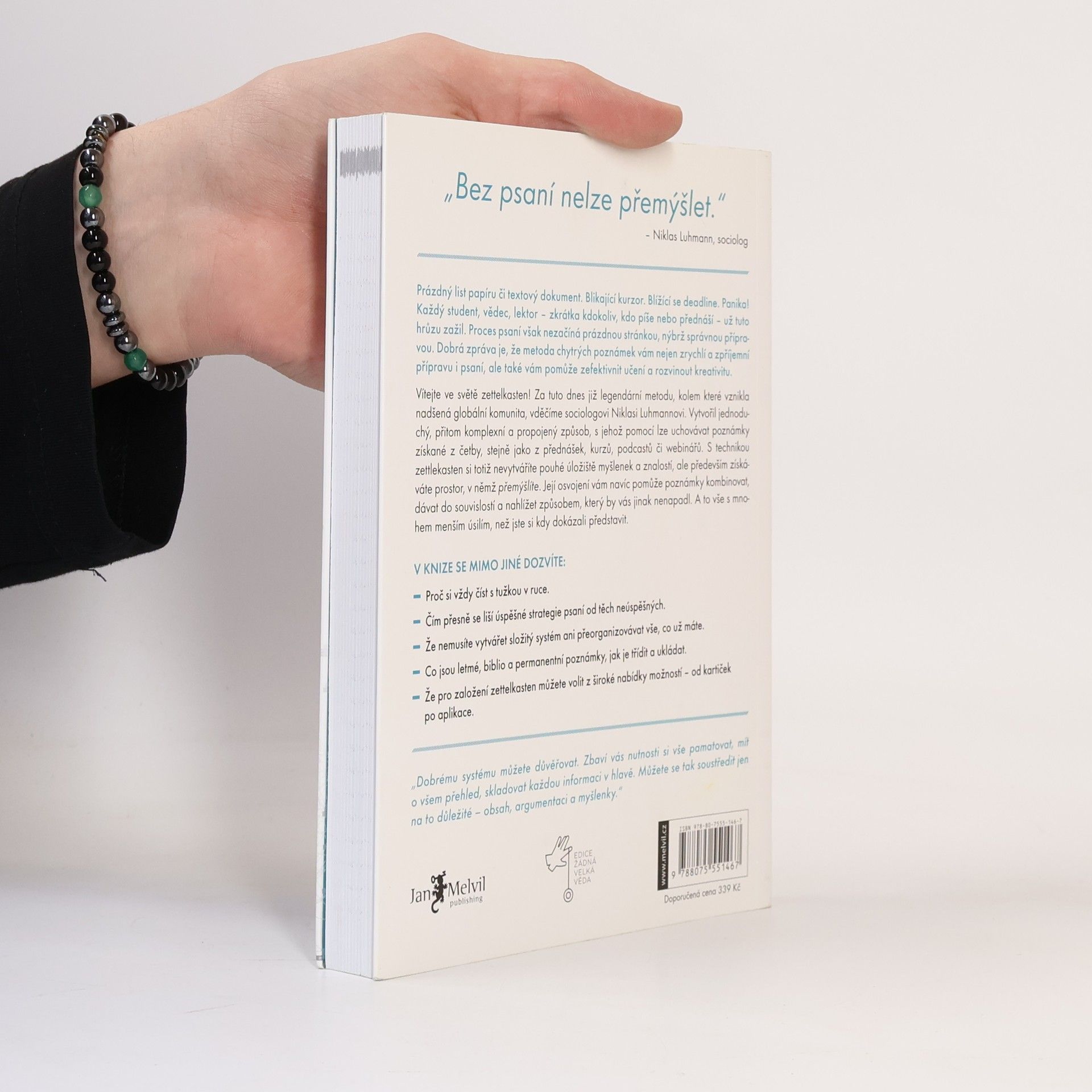 Ze všech stran se na nás valí informace a snažíme se v nich najít smysl. Zajímavé knihy, články, videa, podcasty a workshopy nás zahlcují, a my zrychlujeme a kloužeme po povrchu. Ukládáme podněty „na později“, ale často se k nim nevracíme. Po pár týdnech si pamatujeme málo a v praxi nevyužijeme skoro nic. Existuje však způsob, jak informace efektivně ukládat a proměnit je v něco užitečného – metoda zettelkasten. Tuto techniku vymyslel sociolog Niklas Luhmann v 70. letech, aby efektivně a kreativně myslel. Díky svým návykům a kartotéce přinesl desítky knih a stovky článků, které jsou dodnes průlomové. Sönke Ahrens v knize popisuje Luhmannův systém v kontextu dnešního světa a ukazuje, jak jej uplatnit při čtení, myšlení a psaní. Odkazuje na neurovědu a vysvětluje, proč je zettelkasten tak efektivní. Od vydání knihy v roce 2017 se metoda stala populární, což ovlivnilo vývoj softwarových nástrojů jako Notion či Obsidian. Kniha nabízí nejen inspiraci Luhmannovým příběhem, ale i praktické rady pro osobní zpracování informací. Ať už čtete, učíte se, blogujete, nebo píšete, tato kniha je pro vás. Nechcete také umět efektivně pracovat s informacemi?