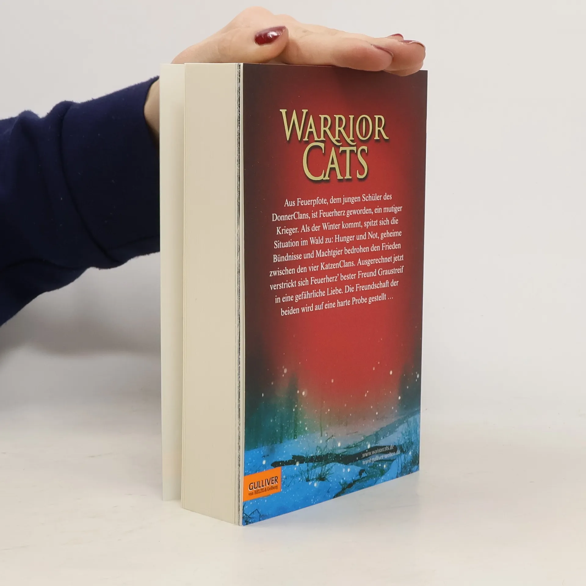 „Plötzlich ertönte vom Waldrand her ein schrilles, hohes Kreischen. Das Blut in Feuerherz’ Adern erstarrte – es war derselbe Schrei, den er in seinem Traum gehört hatte.“ Feuerherz, das ehemalige ‚Hauskätzchen’, ist ein mutiger Krieger des DonnerClans geworden. Als der Winter kommt, spitzt sich die Situation im Wald zu: Nachdem der WindClan von Katzen des SchattenClans vertrieben wurde, ist das Gleichgewicht der Clans gestört. Hunger und Not, geheime Bündnisse und die Machtgier einzelner Katzen bedrohen den Frieden im Wald. Ausgerechnet jetzt verstrickt sich Feuerherz’ bester Freund Graustreif in eine gefährliche Liebe. Als die beiden Freunde aufbrechen, um den WindClan zurückzuholen, kommt es zu einem schrecklichen Unfall …