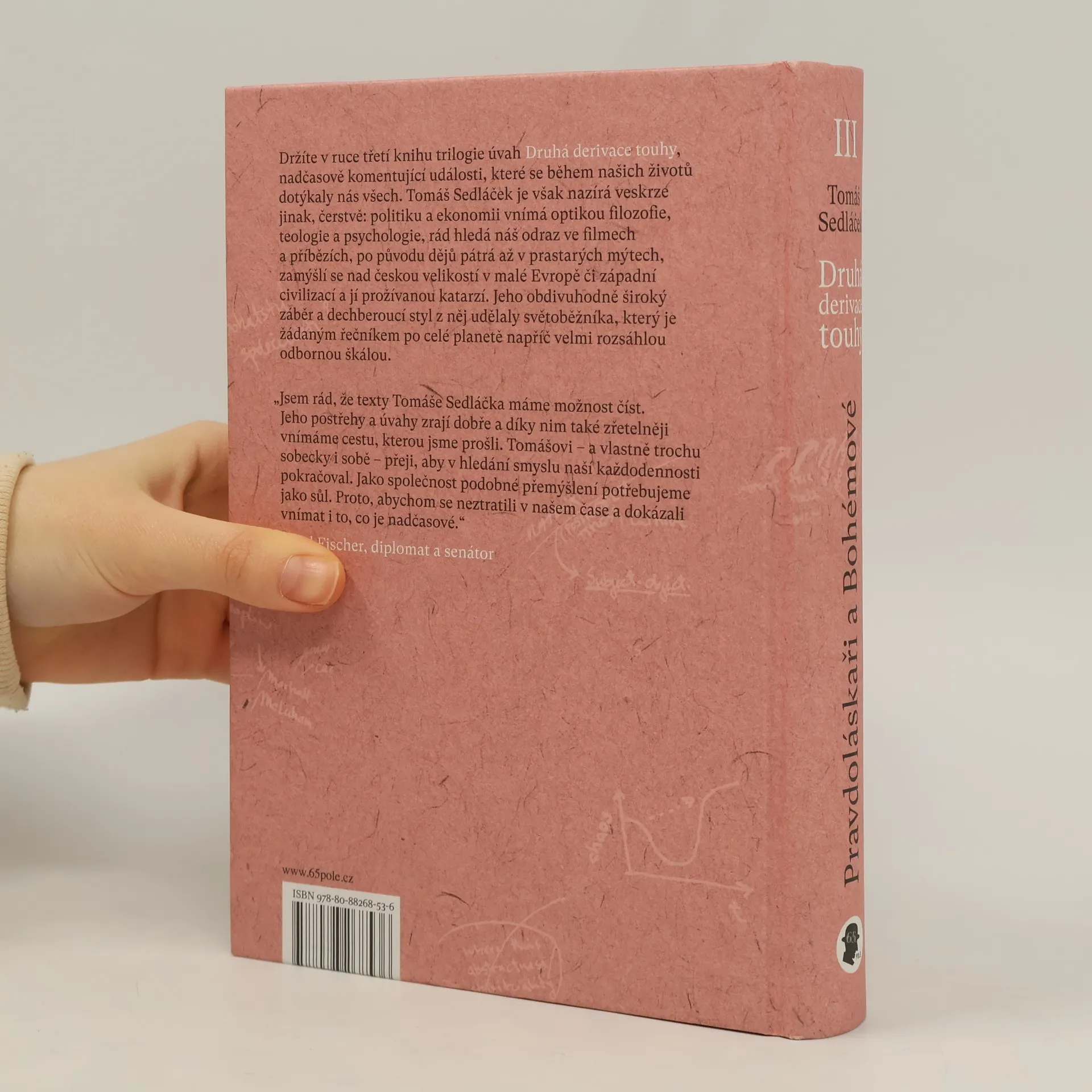 Třetí kniha trilogie úvah Druhá derivace touhy nadčasově komentuje události, které se během našich životů dotýkaly nás všech. Tomáš Sedláček je však nazírá veskrze jinak, čerstvě: politiku a ekonomii vnímá optikou filozofie, teologie a psychologie, rád hledá náš odraz ve filmech a příbězích, po původu dějů pátrá až v prastarých mýtech, zamýšlí se nad českou velikostí v malé Evropě či západní civilizací a jí prožívanou katarzí. Jeho obdivuhodně široký záběr a dechberoucí styl z něj udělaly světoběžníka, který je žádaným řečníkem po celé planetě napříč velmi rozsáhlou odbornou škálou. Tématické okruhy třetího svazku: hospodářská politika a růst / u EU / krizí k ekomomice ryzí / my Češi / lidská práva / cizinci v Evropě / cykli(sti)cká společnost / NERV(y) a reformy.