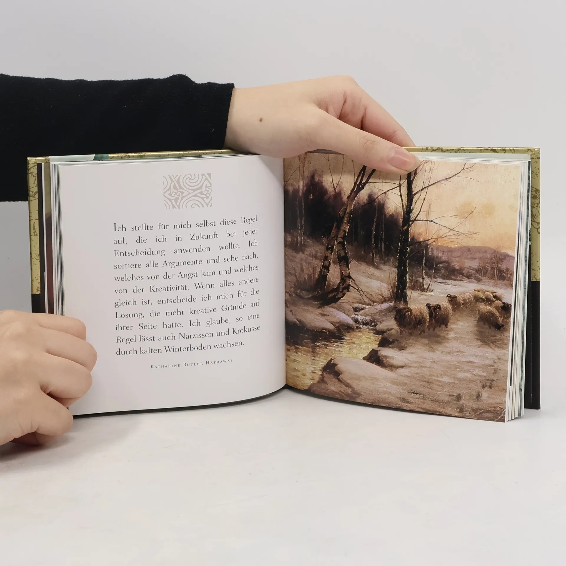 Antik wirkende Goldfolie ziert den Einband. 144 Seiten, liebevoll und elegant gestaltet, versammeln Großes und Wahres, das in den Tiefen menschlichen Lebens führt: unvergängliche Weisheiten über Hoffnung und Mut, Zärtlichkeit und Bewahrung illustriert mit poetischen Kunstwerken. Edler wurde Weisheit selten in einem Buch vereint.