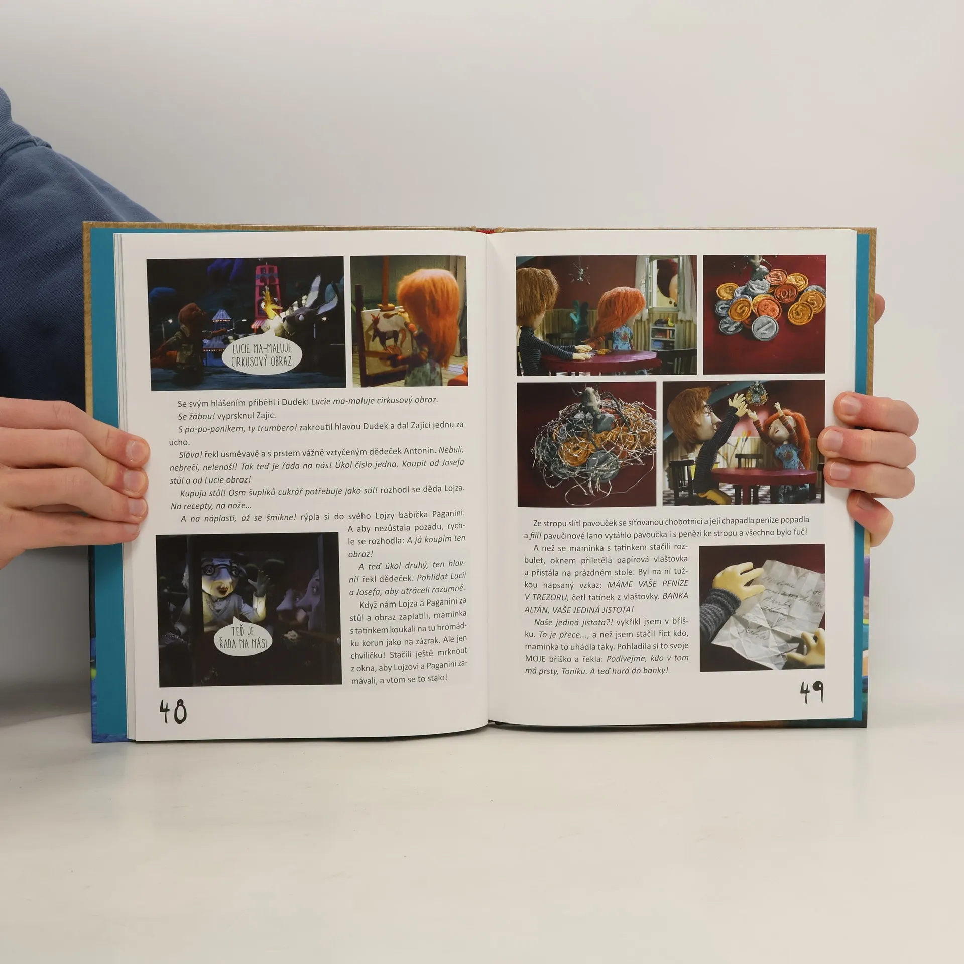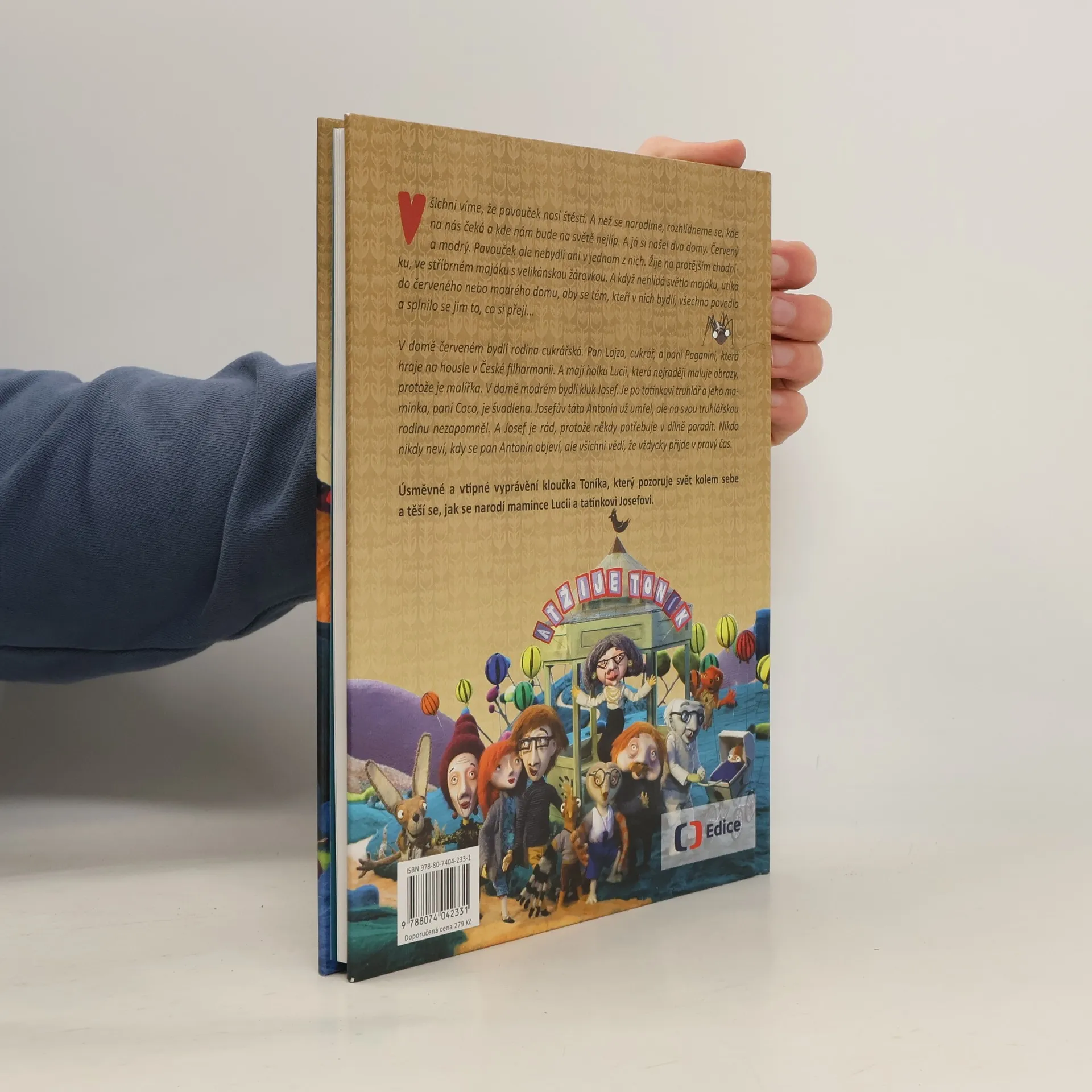 Než se narodíme, rozhlédneme se, kde na nás čeká štěstí a kde nám bude na světě nejlíp. Toník si našel dva domy. Červený a modrý. V domě červeném bydlí rodina cukrářská. Pan Lojza, cukrář, a paní Paganini, která hraje na housle v České filharmonii. A mají holku Lucii, která nejraději maluje obrazy, protože je malířka. V domě modrém bydlí kluk Josef. Je po tatínkovi truhlář a jeho maminka, paní Coco, je švadlena. Josefův táta Antonín už umřel, ale na svou truhlářskou rodinu nezapomněl. A Josef je rád, protože někdy potřebuje v dílně poradit. Nikdo nikdy neví, kdy se pan Antonín objeví, ale všichni vědí, že vždycky přijde v pravý čas. Úsměvné a vtipné vyprávění kloučka Toníka, který pozoruje svět kolem sebe a těší se, jak se narodí mamince Lucii a tatínkovi Josefovi. Bohatě ilustrovaná kniha podle stejnojmenného večerníčku je vhodná pro nejmenší čtenáře a zejména ke čtení dětem.
