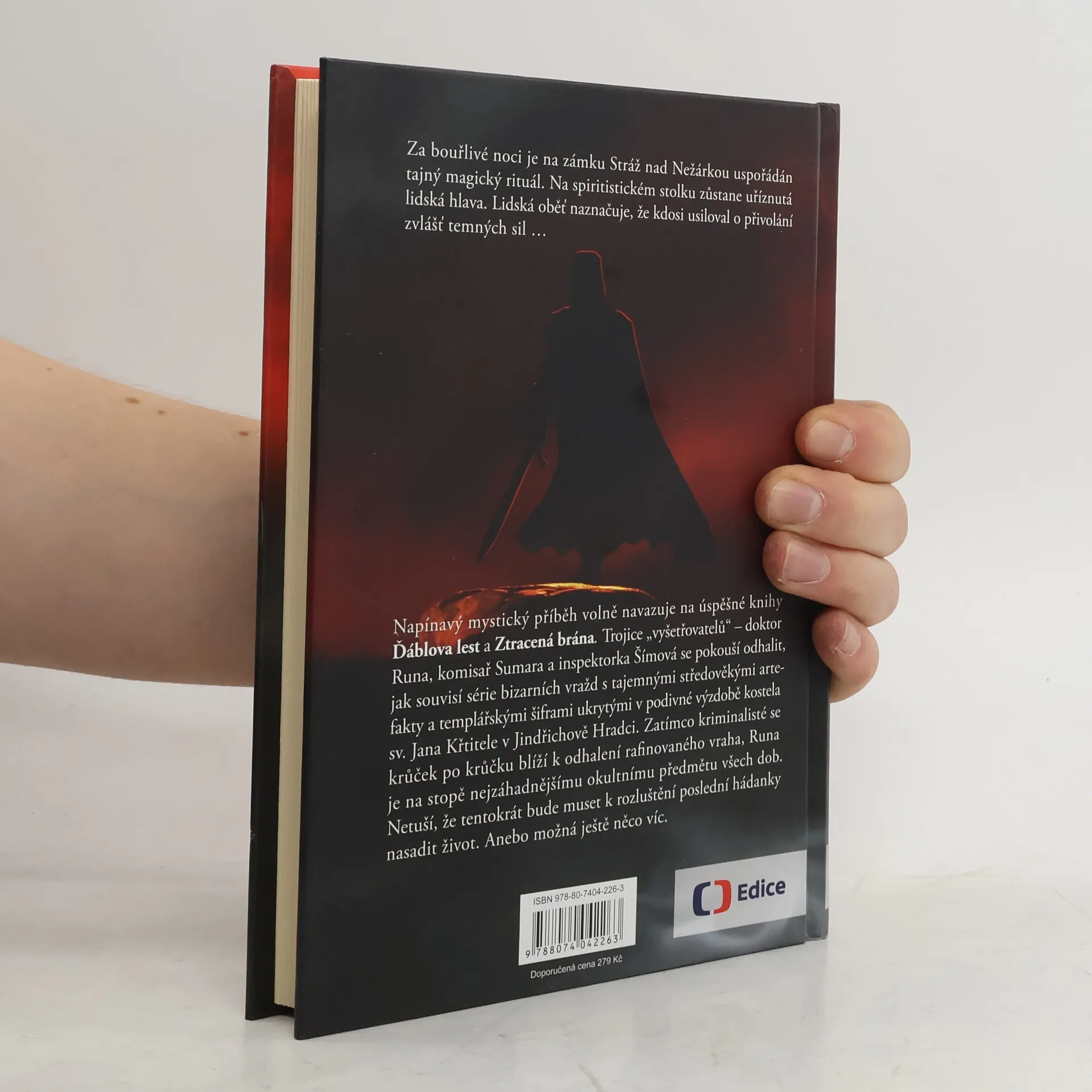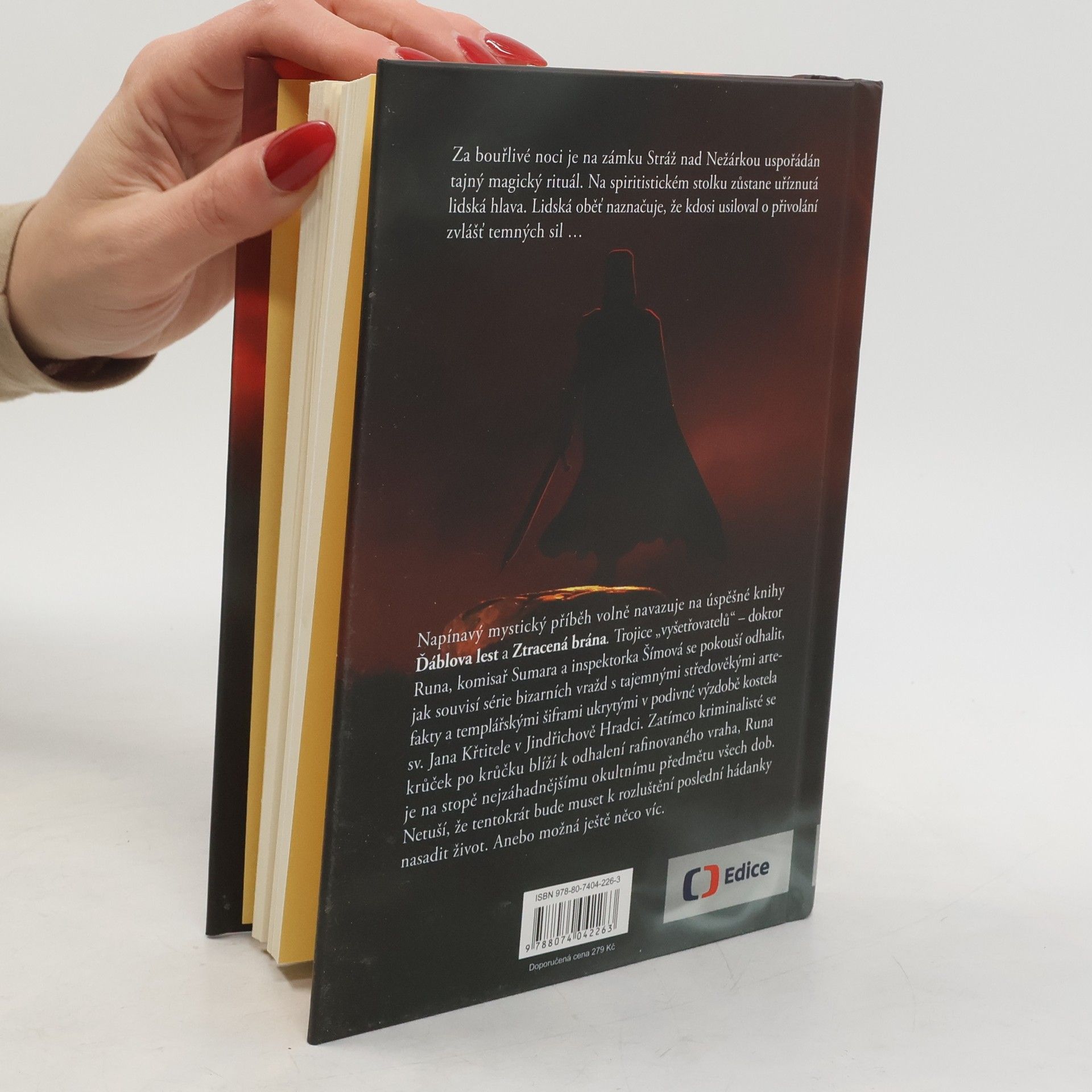 Za bouřlivé noci je na zámku Stráž nad Nežárkou uspořádán tajný magický rituál. Na spiritistickém stolku v Komnatě duchů zůstane uříznutá lidská hlava. Tělo je nalezeno na starém pohanském obětišti v lese. Kromě hlavy mu chybí i pravá ruka. Lidská oběť naznačuje, že kdosi usiloval o přivolání zvlášť temných sil… Napínavý mystický příběh volně navazuje na úspěšné knihy Ďáblova lest a Ztracená brána. Trojice „vyšetřovatelů“ – doktor Runa, komisař Sumara a inspektorka Šímová se pokouší odhalit, jak souvisí série bizarních vražd s tajemnými středověkými artefakty a templářskými šiframi ukrytými v podivné výzdobě kostela sv. Jana Křtitele v Jindřichově Hradci. Zatímco kriminalisté se krůček po krůčku blíží k odhalení rafinovaného vraha, Runa je na stopě nejzáhadnějšímu okultnímu předmětu všech dob. Netuší, že tentokrát bude muset k rozluštění poslední hádanky nasadit život. Anebo možná ještě něco víc.