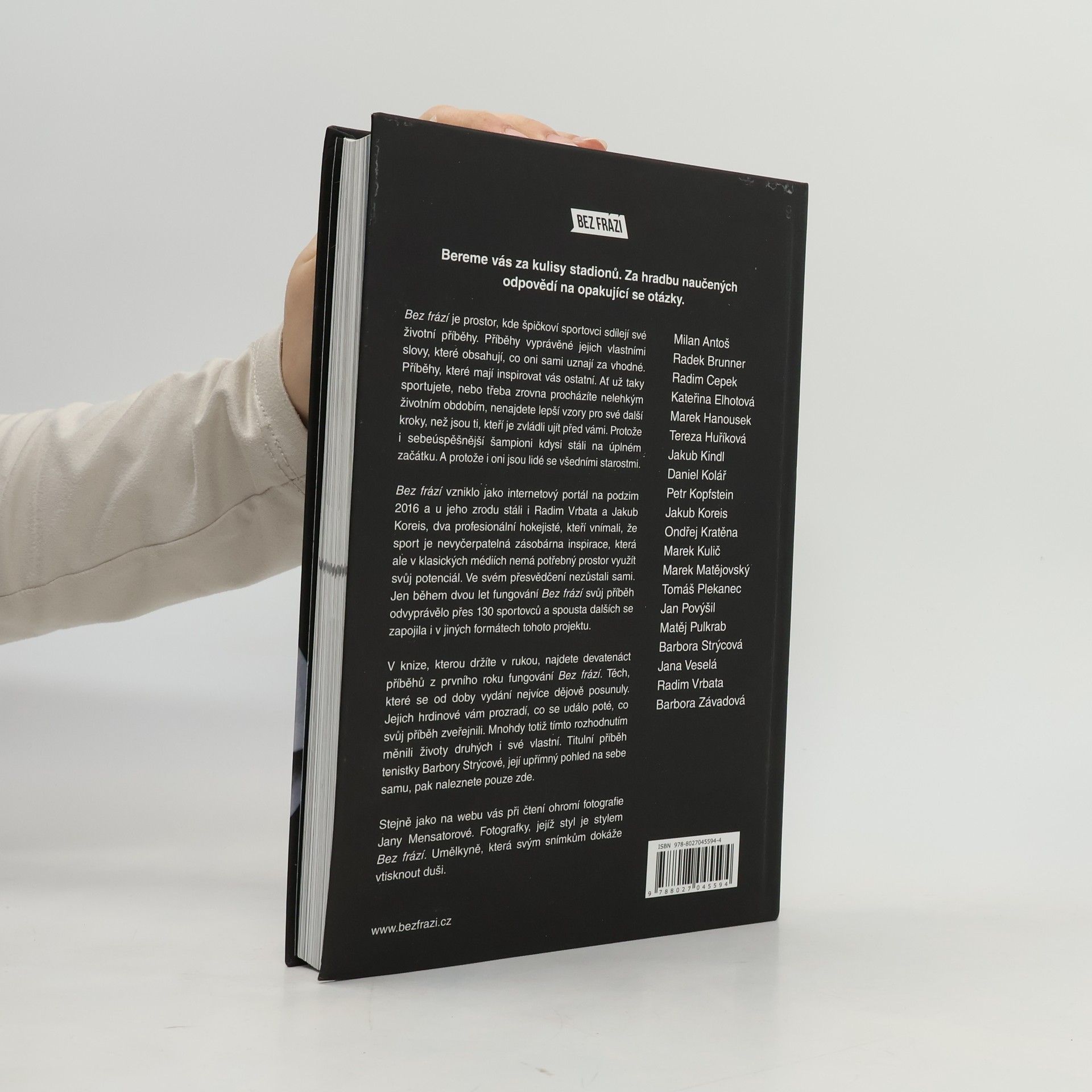 Bereme vás za kulisy stadionů, za hradbu naučených odpovědí na opakující se otázky. Bez frází je prostor, kde špičkoví sportovci sdílejí své životní příběhy vlastními slovy. Tyto příběhy mají inspirovat ostatní, ať už sportujete nebo procházíte těžkým obdobím. I ti nejúspěšnější šampioni kdysi stáli na začátku a mají běžné starosti. Bez frází vzniklo jako internetový portál na podzim 2016, kdy Radim Vrbata a Jakub Koreis, profesionální hokejisté, cítili, že sport nabízí nevyčerpatelnou inspiraci, která v tradičních médiích nemá dostatečný prostor. Během dvou let se připojilo přes 130 sportovců, kteří sdíleli své příběhy a zapojili se do různých formátů projektu. V knize najdete devatenáct příběhů z prvního roku fungování, které se od doby vydání výrazně posunuly. Hrdinové vám prozradí, co se stalo po zveřejnění jejich příběhů, často měnících životy druhých i jejich vlastní. Titulní příběh tenistky Barbory Strýcové nabízí její upřímný pohled na sebe samu. Čtení doprovázejí fotografie Jany Mensatorové, jejíž styl dokonale vystihuje podstatu Bez frází.