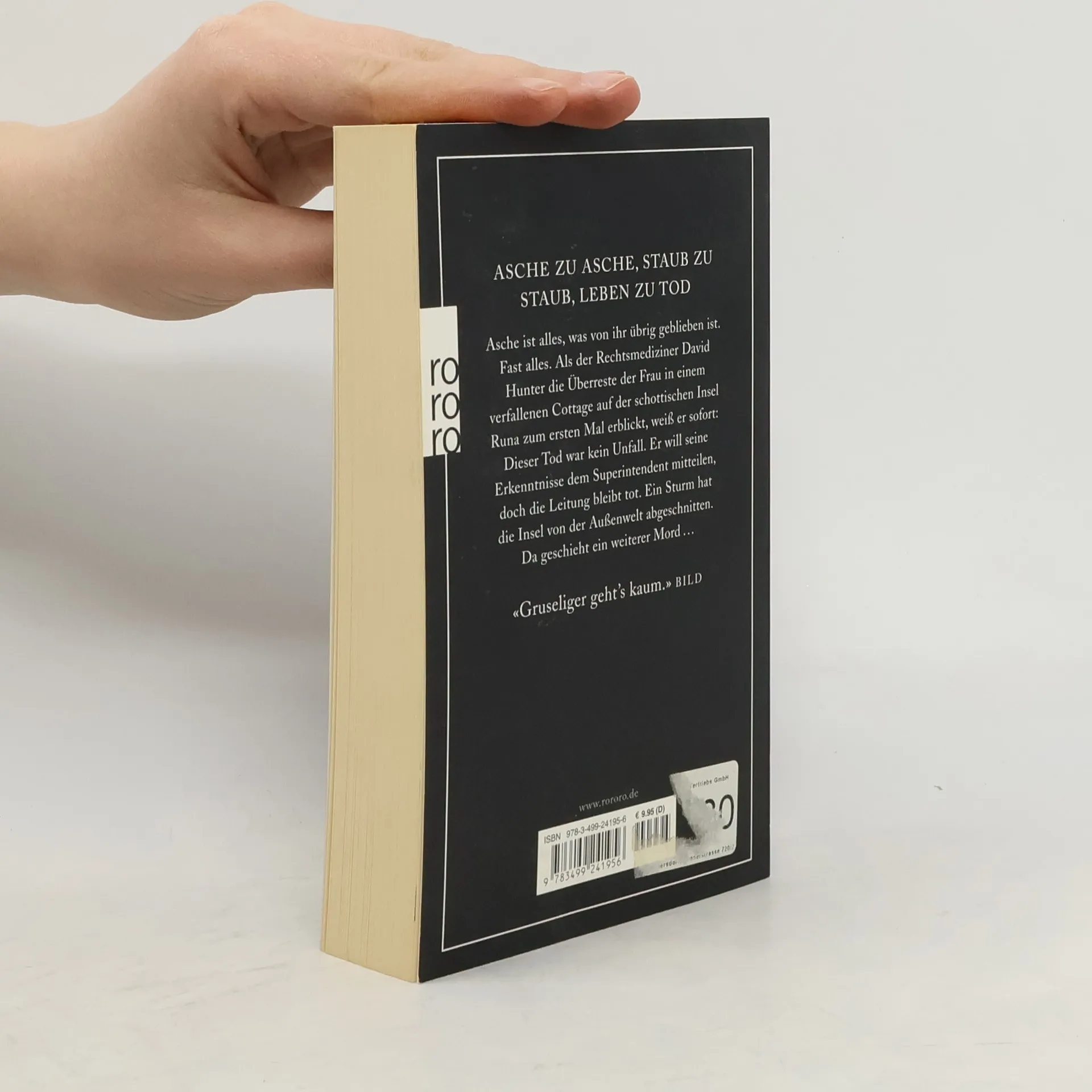 Asche zu Asche, Staub zu Staub, Leben zu Tod. Asche ist alles, was von ihr übrig geblieben ist. Fast alles. Als der Rechtsmediziner David Hunter die Überreste der Frau in einem verfallenen Cottage auf der schottischen Insel Runa zum ersten Mal erblickt, weiß er sofort: Dieser Tod war kein Unfall. Er will seine Erkenntnisse dem Superintendenten mitteilen, doch die Leitung bleibt tot. Ein Sturm hat die Insel von der Außenwelt abgeschnitten. Da geschieht ein weiterer Mord. «Gruseliger geht’s kaum.» (Bild)