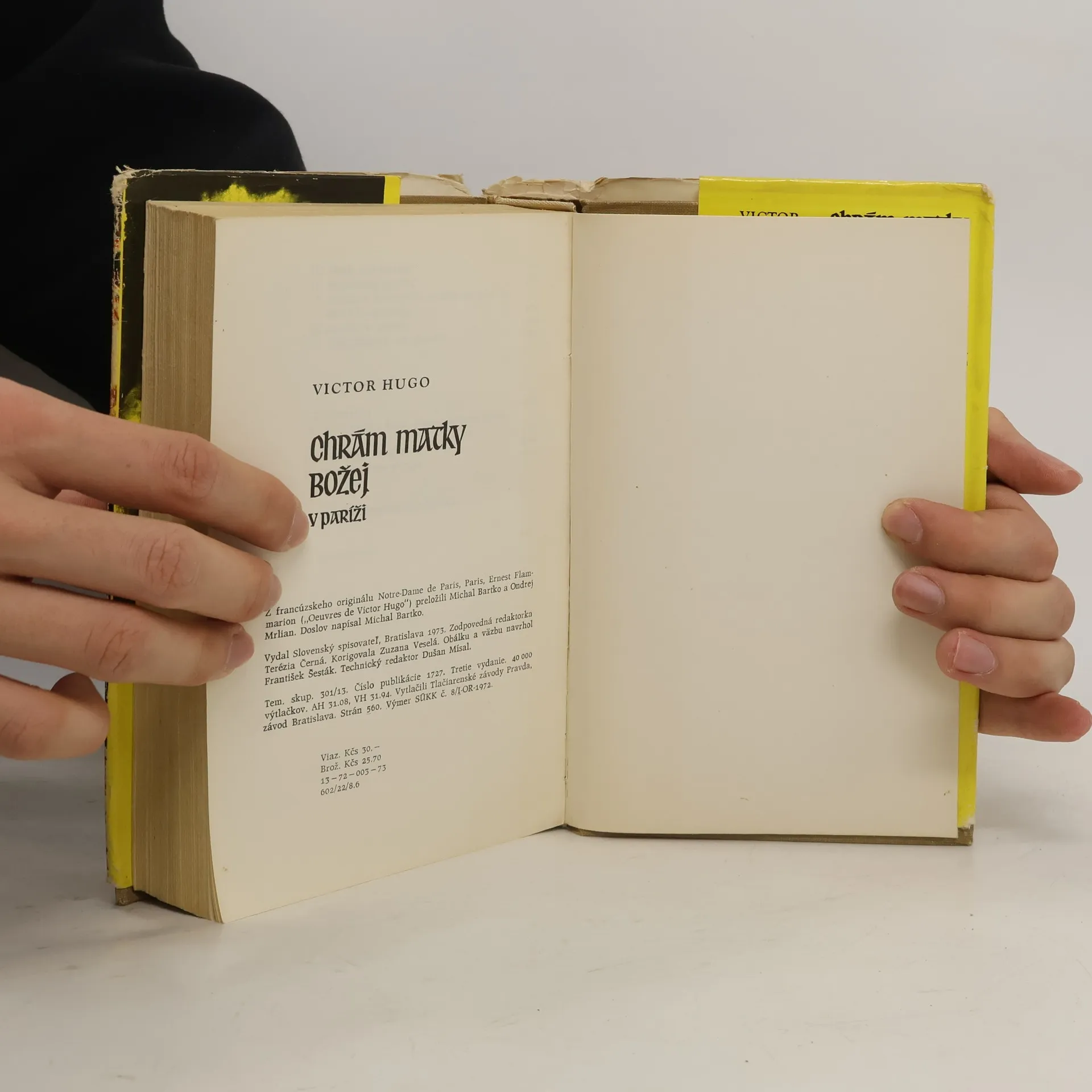 "Victor Hugo, jeden z najslávnejších predstaviteľov svetovej literatúry, sa do sŕdc miliónov čitateľov zapísal ako autor mnohých vynikajúcich prozaických, básnických i dramatických diel. Azda najznámejšie z nich je jeho historický román Chrám Matky Božej v Paríži (1831), ktorý po rokoch ponúkame slovenským čitateľom v novom vydaní. V monumentálnej románovej freske ožíva pred našimi očami nielen tragický príbeh znetvoreného zvonára Quasimoda a krásnej Cigánky Esmeraldy, ale aj sám Paríž pätnásteho storočia – stredoveké mesto so svojou magickou atmosférou, úzkymi uličkami a námestiami, nespočetnými vežami a kostolmi, medzi ktorými dominuje Chrám Matky Božej, nádherná majestátna katedrála, s ktorou sú nerozlučne späté osudy hlavných hrdinov. Ich príbeh dotvára množstvo epizód, kde sa vystrieda veľa postáv z najrozličnejších spoločenských vrstiev vrátane tých najvyšších. Do centra románu sa však postupne dostáva ľud – parížska chudoba, živelne sa búriaca proti cirkevnej tyranii a objavujúca svoje ušľachtilé jadro, lásku a ľudskosť uprostred stredovekej krutosti a tmy. Hugov nesmrteľný román nepochybne upúta i dnešného čitateľa svojou dramatickosťou, dejom plným neočakávaných zvratov a najrozmanitejších prekvapení." (Anotácia vydavateľstva) Siedme (hoci uvedené ako prvé - pravdepodobne prvé v danom vydavateľstve) slovenské vydanie v tomto preklade.... celý text