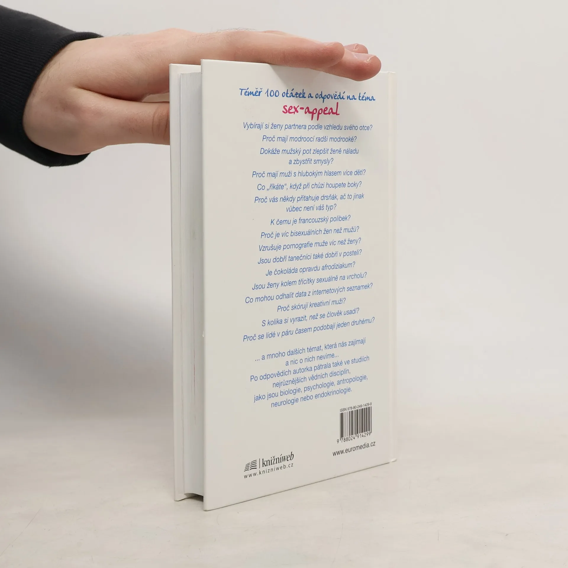 Téměř 100 otázek na téma sex-appeal. Po odpovědích autorka pátrala v nejrůznějších vědních disciplínách, jako jsou biologie, psychologie, antropologie, neurologie nebo endokrinologie. Konečně se dozvíme, zda si například ženy vybírají partnera podle vzhledu svého otce, proč mají modroocí radši modrooké, zda dokáže mužský pot zlepšit ženě náladu a zbystřit smysly, proč je víc bisexuálních žen než mužů, proč skórují kreativní muži nebo jak roční doba ovlivňuje sexuální život.