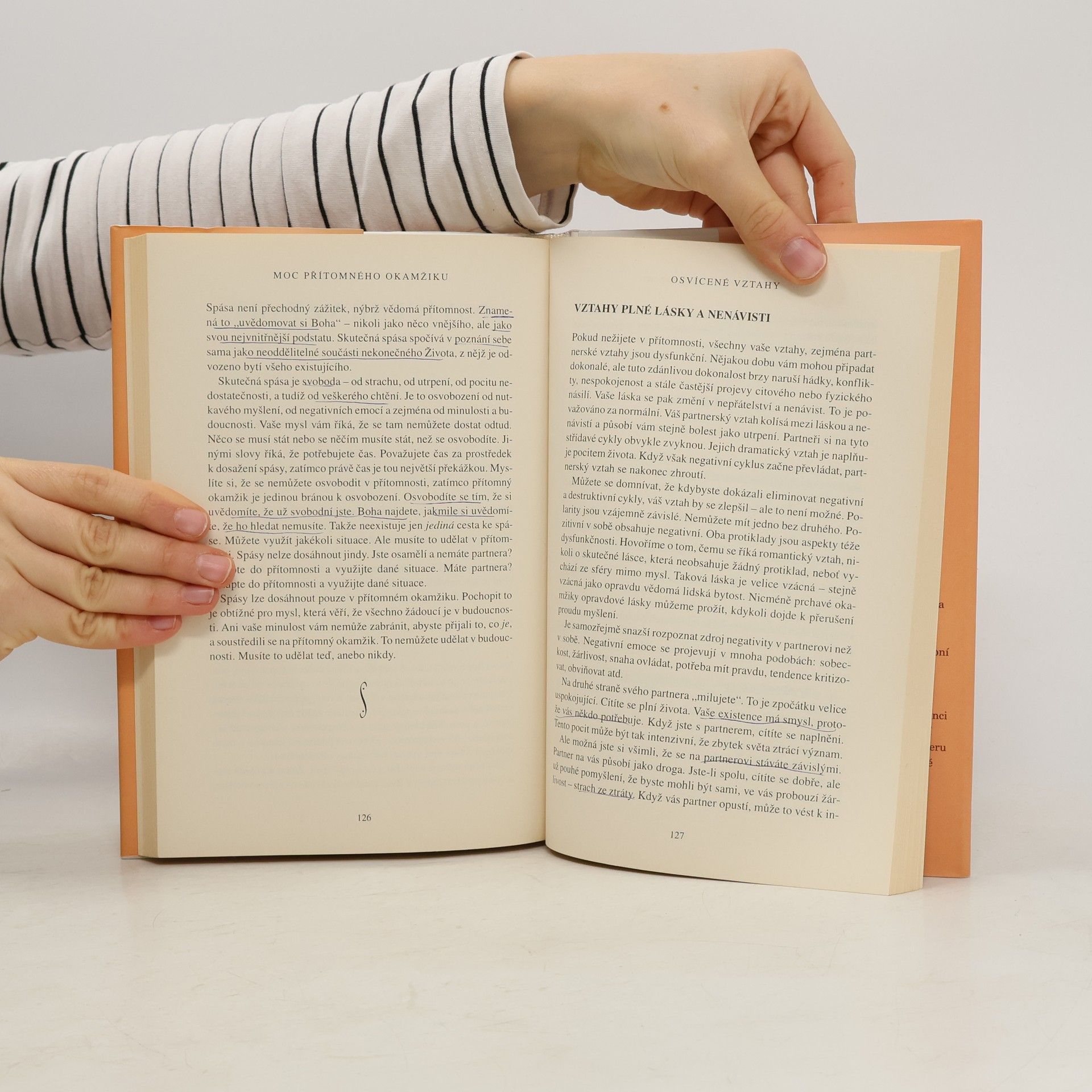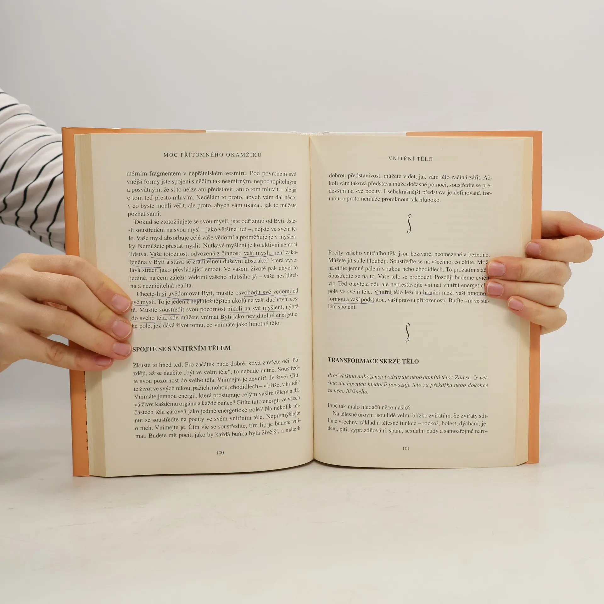 Při čtení této knihy mnoho z nás učiní nové objevy: nejsme svou myslí; můžeme se zbavit duševní bolesti; najdeme, jakmile se vzdáme přítomnému okamžiku. Dovíme se také, že jedním z klíčů k dosažení vnitřního klidu je naše tělo, stejně jako ticho a prostor kolem nás. To jsou brány, jimiž můžeme vstoupit do přítomnosti, kde neexistují žádné problémy. V přítomném okamžiku najdeme své skutečné já a hlubokou vnitřní radost. Pouze v přítomném okamžiku si uvědomíme, že už jsme úplní a dokonalí. Mnoho z nás zjistí, že naší největší překážkou na cestě k tomuto poznání jsou naše partnerské vztahy. Vstupujeme do ,,nového teritoria" a nic není takové, jak se nám to dosud jevilo. Pochopíme, že naše partnerské vztahy mohou být další branou k duchovnímu osvícení, pokud jich budeme užívat moudře, to jest k tomu, abychom se stali víc milujícími. Výsledek? Skutečné spojení mezi naším já a druhými lidmi. Naučíme-li se žít v přítomném okamžiku, budeme-li vnímat realitu ,,neviditelného Bytí" a svého ,,vnitřního těla", otevřeme se transformujícímu poznání, jež nám poskytuje tato kniha.