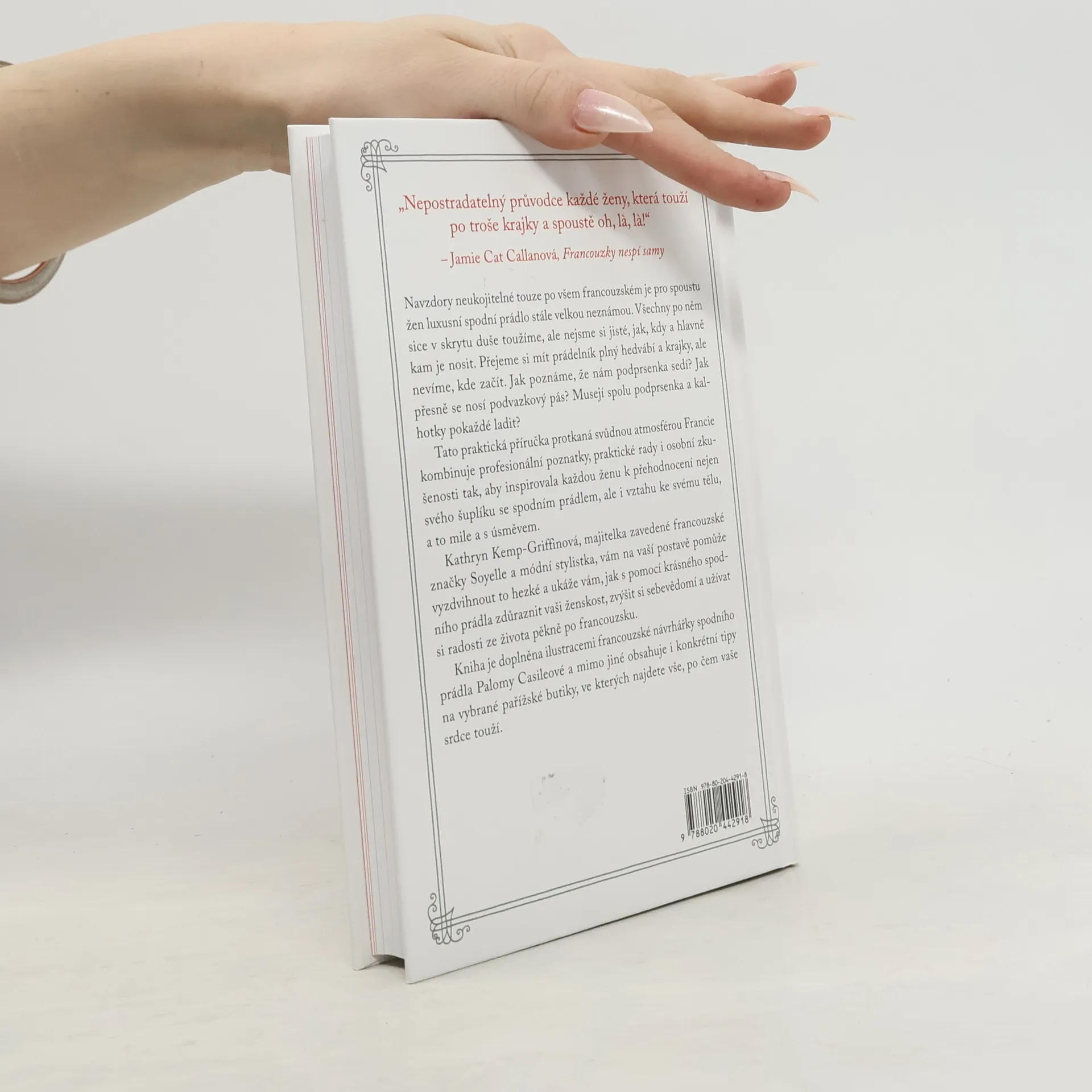 Navzdory nezlomné touze po všem francouzském je pro spoustu žen luxusní spodní prádlo stále velkou neznámou. Všechny po něm sice v skrytu duše toužíme, ale nejsme si jisté, jak, kdy a hlavně kam je nosit. Přejeme si mít prádelník plný hedvábí a krajky, ale nevíme, kde začít. Jak poznáme, že nám podprsenka sedí? Jak přesně se nosí podvazkový pás? Musejí spolu podprsenka a kalhotky pokaždé ladit? Tato praktická příručka protkaná svůdnou atmosférou Francie kombinuje profesionální poznatky, praktické rady i osobní zkušenosti tak, aby inspirovala každou ženu k přehodnocení nejen svého šuplíku se spodním prádlem, ale i vztahu ke svému tělu, a to mile a s úsměvem. Kathryn Kemp-Griffinová, majitelka zavedené francouzské značky Soyelle a módní stylistka, vám na vaší postavě pomůže vyzdvihnout to hezké a ukáže vám, jak s pomocí krásného spodního prádla zdůraznit vaši ženskost, zvýšit si sebevědomí a užívat si radosti ze života pěkně po francouzsku. Kniha je doplněna ilustracemi francouzské návrhářky spodního prádla Palomy Casile a mimo jiné obsahuje i konkrétní tipy na vybrané pařížské butiky, ve kterých najdete vše, po čem vaše srdce touží.