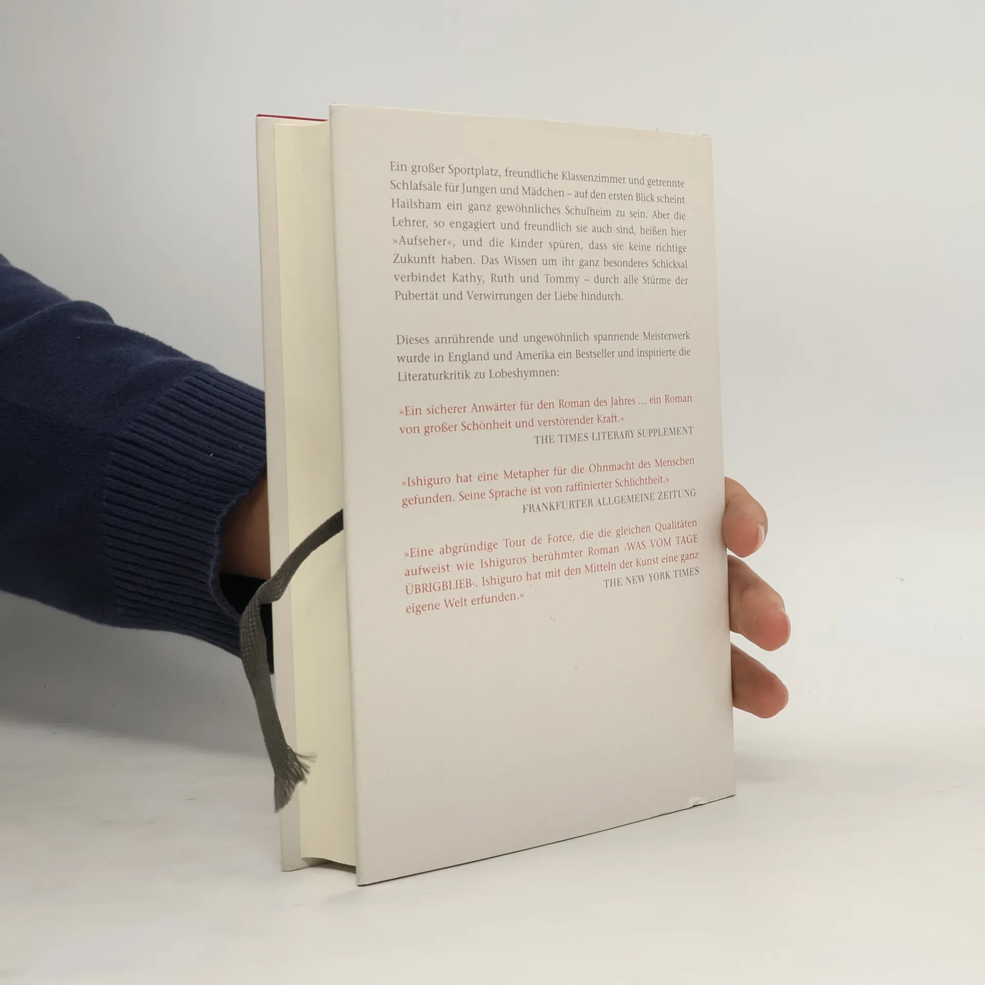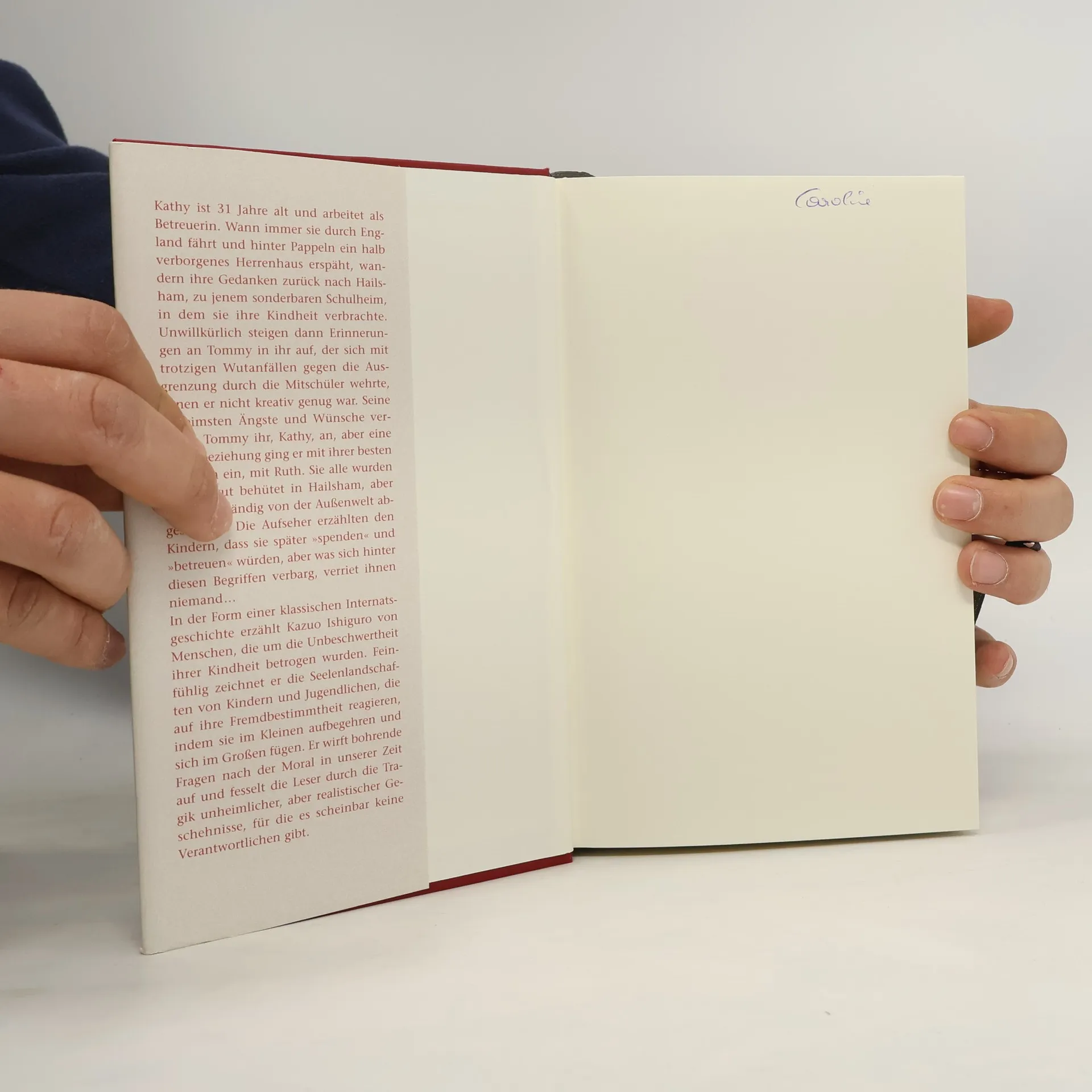 Ein Speisesaal, ein Sportplatz und getrennte Schlafsäle für Jungen und Mädchen – auf den ersten Blick wirkt Hailsham wie ein gewöhnliches Internat. Doch die Lehrer, freundlich und engagiert, werden als 'Wächter' bezeichnet und vermitteln den Kindern früh das Gefühl, ein besonderes Schicksal sei ihnen auferlegt. Diese Gewissheit verbindet Kathy, Ruth und Tommy durch die Stürme der Pubertät und die Verwirrungen der Liebe, bis für zwei von ihnen das Ende naht. Kathy, einunddreißig Jahre alt und als Betreuerin tätig, wird beim Anblick eines halb verborgenen Herrenhauses in England an Hailsham erinnert, wo sie ihre Kindheit verbrachte. Erinnerungen an Tommy, der sich gegen die Ausgrenzung durch seine Mitschüler wehrte, kommen in ihr hoch. Tommy vertraute Kathy seine Ängste und Wünsche an, doch eine Beziehung begann er zunächst mit ihrer besten Freundin Ruth. In Hailsham waren sie gut behütet, aber von der Außenwelt abgeschnitten. Die Lehrer sprachen von 'Spenden' und 'Betreuung', ohne die wahren Bedeutungen zu offenbaren. Die Schüler schufen Bilder und Gedichte, die von einer respektvollen Dame für eine Galerie gesammelt wurden, die sie nie zu Gesicht bekamen. Tommy vermutete, dass die Aufseher anhand dieser Werke entscheiden wollten, ob zwei Menschen zueinander passten, denn nur echte Liebespaare konnten einen Aufschub erhalten, bevor sie 'Spender' wurden.