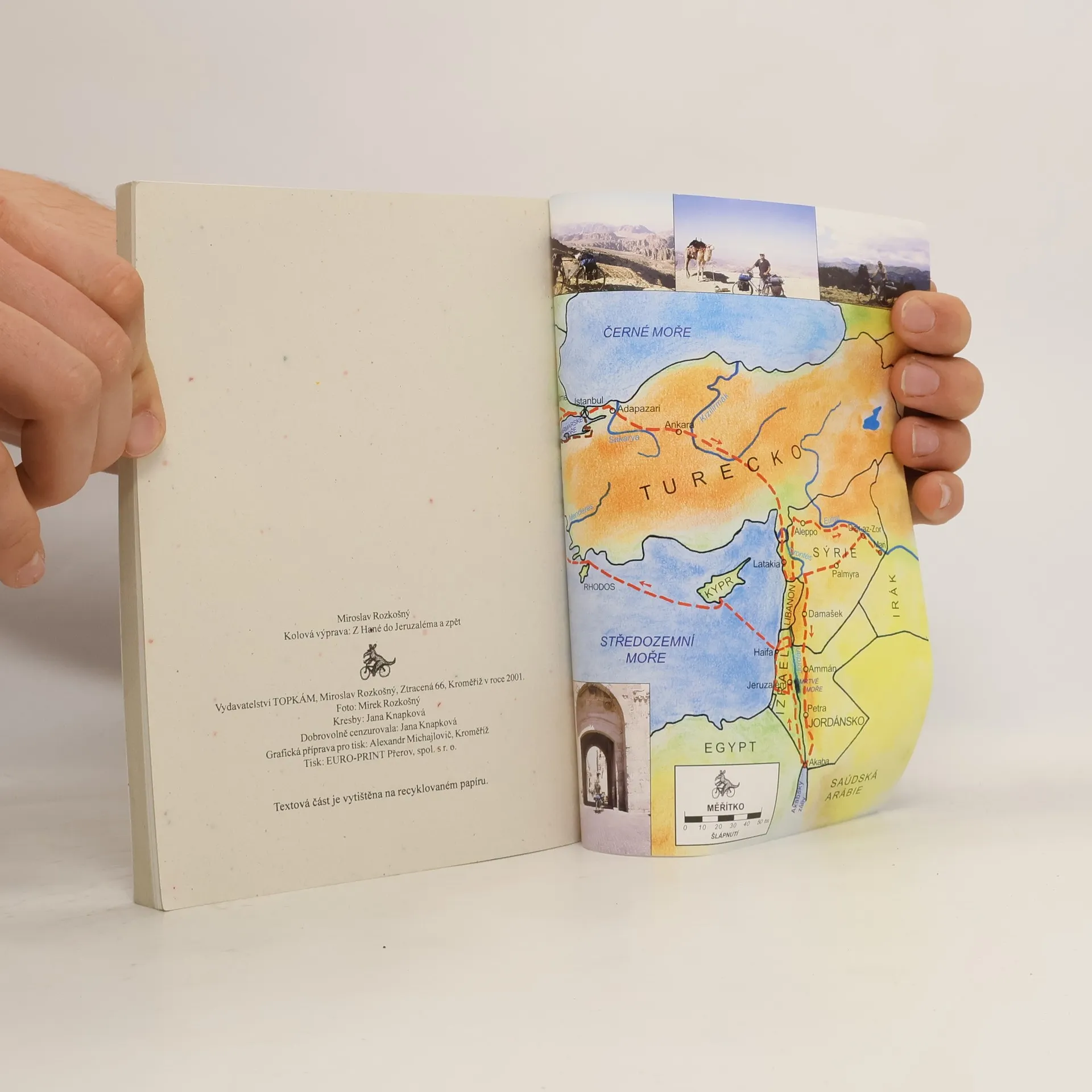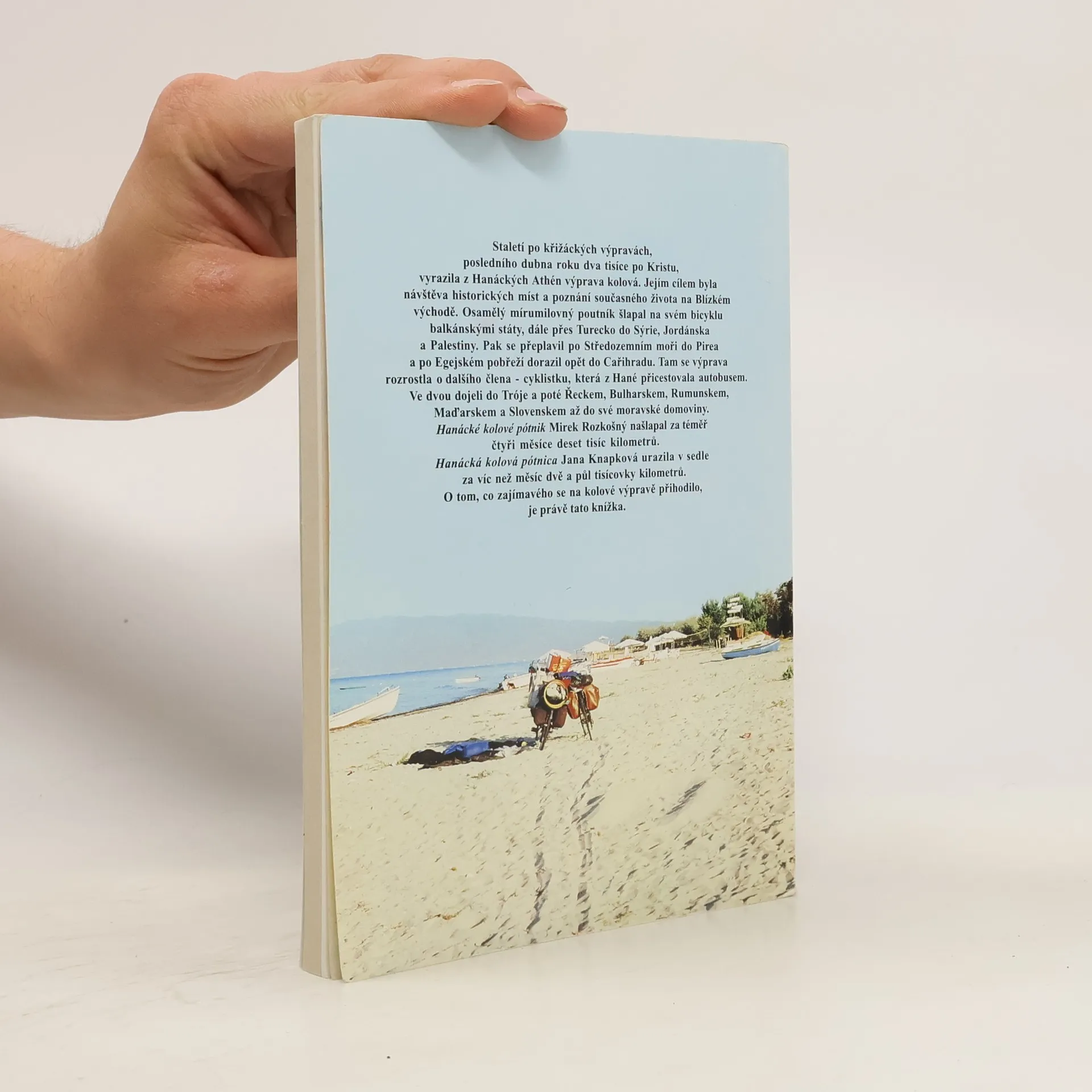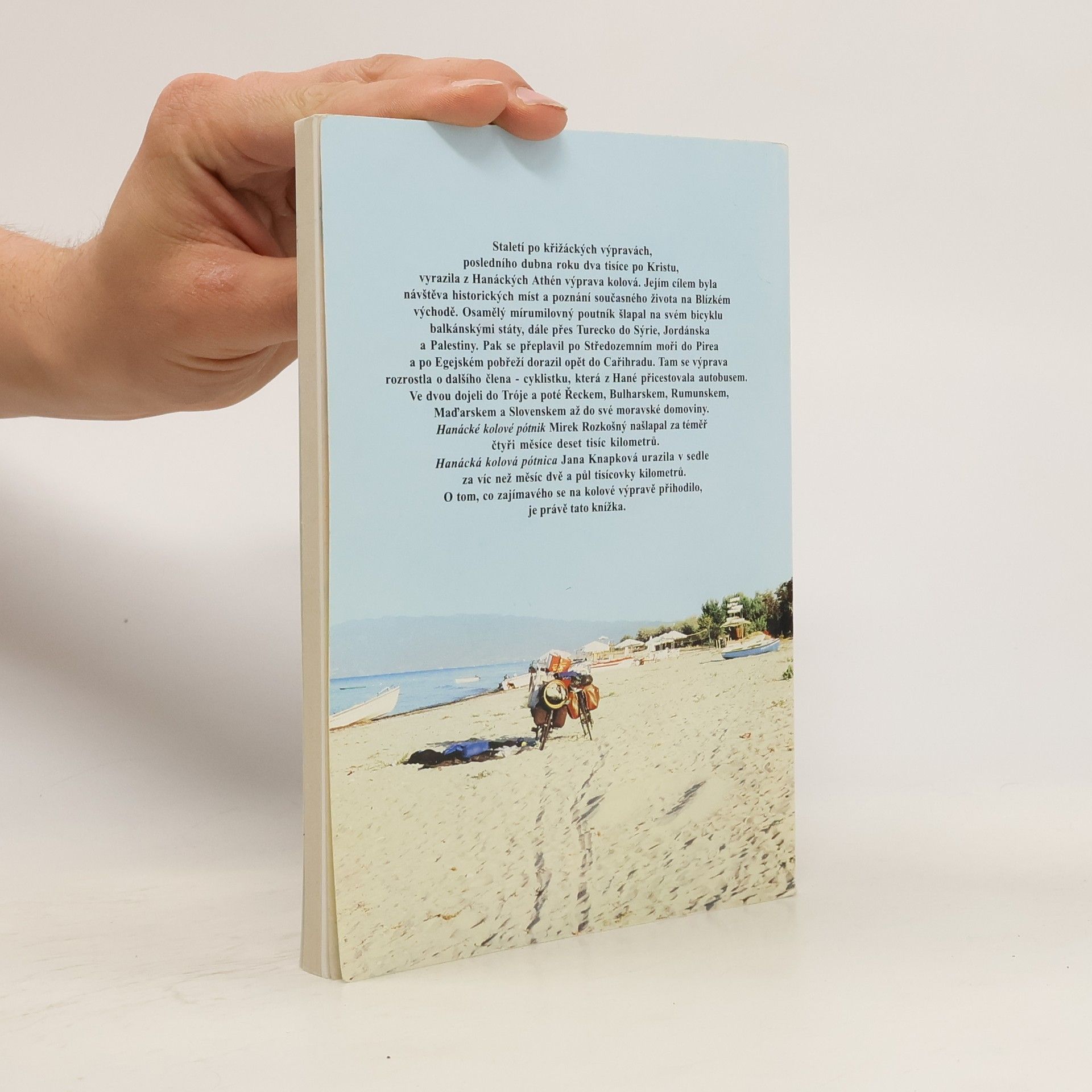 Staletí po křižáckých výpravách, posledního dubna roku dva tisíce po Kristu, vyrazila z Hanáckých Athén výprava kolová. Jejím cílem byla návštěva historických míst a poznání současného života na Blízkém východě. Osamělý mírumilovný poutník šlapal na svém byciklu balkánskými státy, dále přes Turecko do Sýrie, Jordánska a Palestiny. Pak se přeplavil po Středozemním moři do Pirea a po Egejském pobřeží dorazil zpět do Cařihradu. Tam se výprava rozrostla o dalšího člena - cyklistku, která z Hané přicestovala autobusem. Ve dvou dojeli do Tróje a poté Řeckem, Bulharskem, Rumunskem, Maďarskem a Slovenskem až do své moravské domoviny. Hanácké kolové pótnik Mirek Rozkošný našlapal za téměř čtyři měsíce deset tisíc kilometrů. Hanácká kolová pótnica Jana Knapková urazila v sedle za víc než měsíc dvě a půl tisícovky kilometrů. O tom, co zajímavého se na kolové výpravě přihodilo, je právě tato knížka s barevnou mnoha stránkovou fotografickou přílohou.