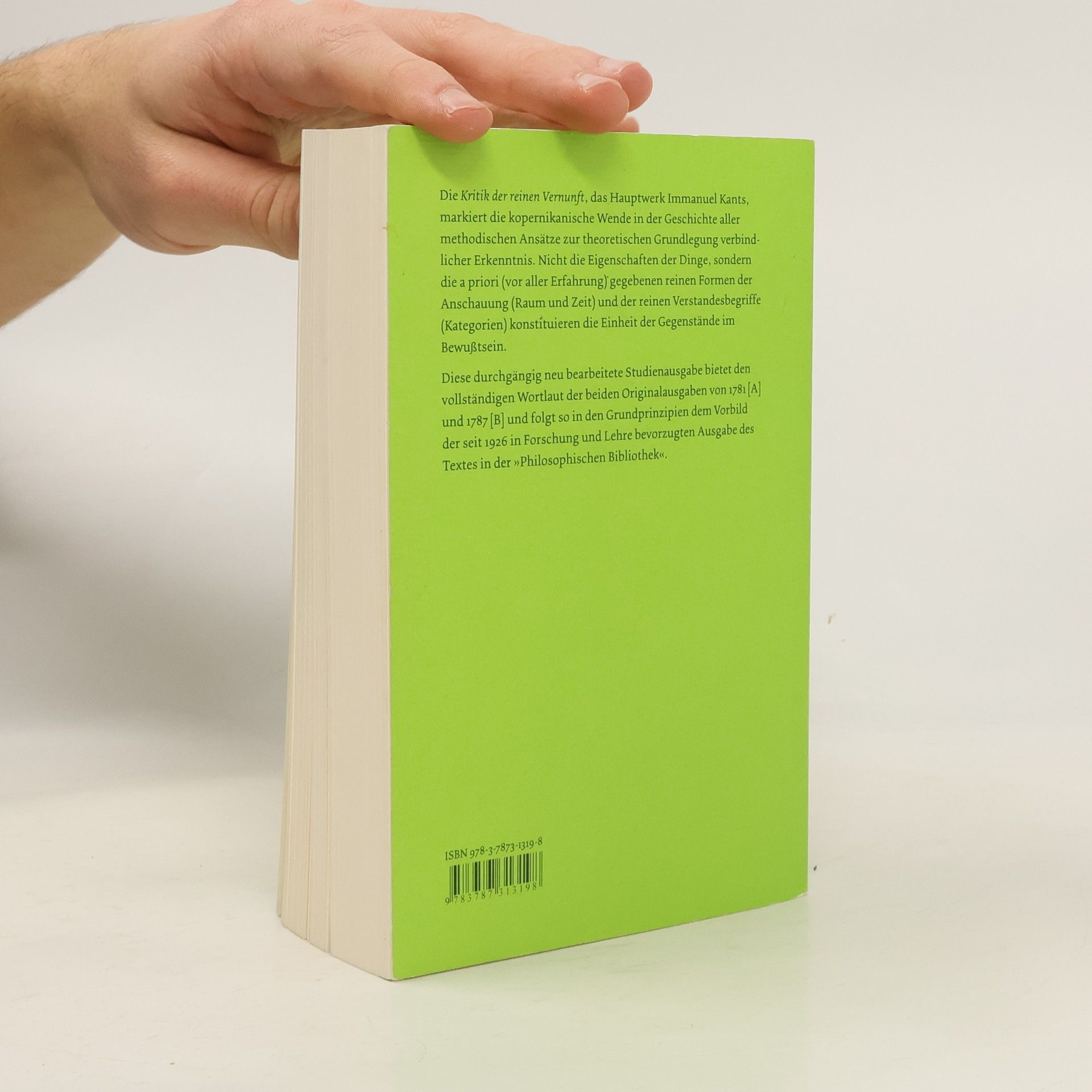 Die Ausgabe innerhalb der Philosophischen Bibliothek bietet den vollständigen Wortlaut der beiden Originalausgaben von 1781 und 1787. Der Kantische Text wurde unter Wahrung der Interpunktion und sprachlicher Eigenheiten sehr behutsam an die heutigen orthographischen Regeln angeglichen. Die semantisch bedeutenden Korrekturvorschläge späterer Herausgeber (nicht nur der Akademie-Ausgabe) sind, wo sie nicht in den Text Aufnahme gefunden haben, am Fuß der Seite verzeichnet. Alle wesentlichen Unterschiede zwischen den Originalausgaben sind durch Kursivdruck hervorgehoben, größere Abweichungen ganzer Textstücke – etwa in der Einleitung und im Kapitel über Phaenomena und Noumena – wurden synoptisch gegenübergestellt, so dass Art und Umfang der Umarbeitung unmittelbar abgelesen werden können. Die durchgängig neu bearbeitete Studienausgabe folgt in den Grundprinzipien der seit 1926 in Forschung und Lehre maßgeblichen Ausgabe von Raymund Schmidt, die hiermit abgelöst wird. Sie wird ergänzt durch eine umfangreiche Bibliographie sowie durch einen ausführlichen Personen- und Sachindex.
