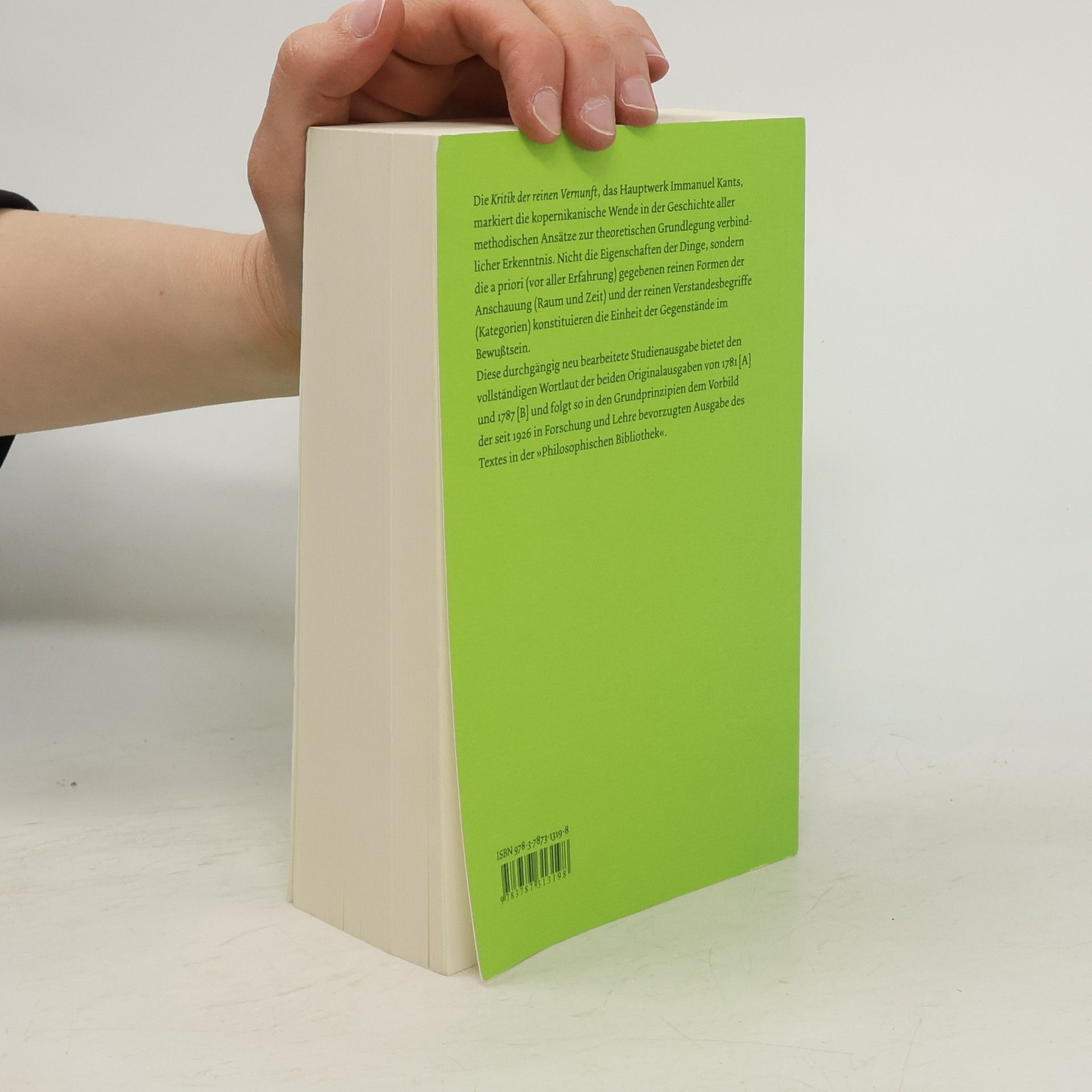 Die Ausgabe innerhalb der Philosophischen Bibliothek bietet den vollständigen Wortlaut der beiden Originalausgaben von 1781 und 1787. Der Kantische Text wurde unter Wahrung der Interpunktion und sprachlicher Eigenheiten sehr behutsam an die heutigen orthographischen Regeln angeglichen. Die semantisch bedeutenden Korrekturvorschläge späterer Herausgeber (nicht nur der Akademie-Ausgabe) sind, wo sie nicht in den Text Aufnahme gefunden haben, am Fuß der Seite verzeichnet. Alle wesentlichen Unterschiede zwischen den Originalausgaben sind durch Kursivdruck hervorgehoben, größere Abweichungen ganzer Textstücke – etwa in der Einleitung und im Kapitel über Phaenomena und Noumena – wurden synoptisch gegenübergestellt, so dass Art und Umfang der Umarbeitung unmittelbar abgelesen werden können. Die durchgängig neu bearbeitete Studienausgabe folgt in den Grundprinzipien der seit 1926 in Forschung und Lehre maßgeblichen Ausgabe von Raymund Schmidt, die hiermit abgelöst wird. Sie wird ergänzt durch eine umfangreiche Bibliographie sowie durch einen ausführlichen Personen- und Sachindex.