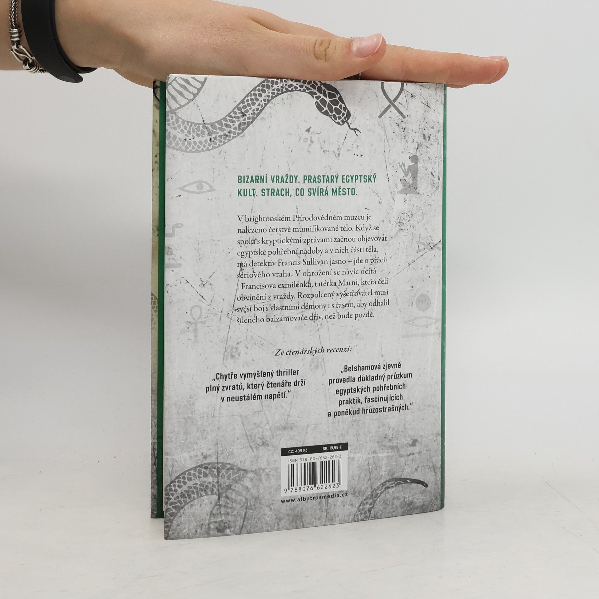 Bizarní vraždy. Prastarý kult. Strach, co svírá město. Knihám označeným zlatou pečetí Edice TOP věnujte zvýšenou pozornost! Předchází je pověst největších světových bestsellerů, které se dočkaly vřelého přijetí kritiky i čtenářů nebo získaly významná literární ocenění. TŘETÍ NAPÍNAVÝ PŘÍPAD INSPEKTORA FRANCISE SULLIVANA OD AUTORKY BESTSELLERU TATÉRKA. V brightonském Přírodovědném muzeu je nalezeno čerstvě mumifikované tělo. Když se spolu s kryptickými zprávami začnou objevovat egyptské pohřební nádoby a v nich části těla, má detektiv Francis Sullivan jasno – jde o práci sériového vraha. V ohrožení se navíc ocitá i Francisova exmilenka, tatérka Marni, která čelí obvinění z vraždy. Rozpolcený vyšetřovatel musí svést boj s vlastními démony i s časem, aby odhalil šíleného balzamovače dřív, než bude pozdě.
