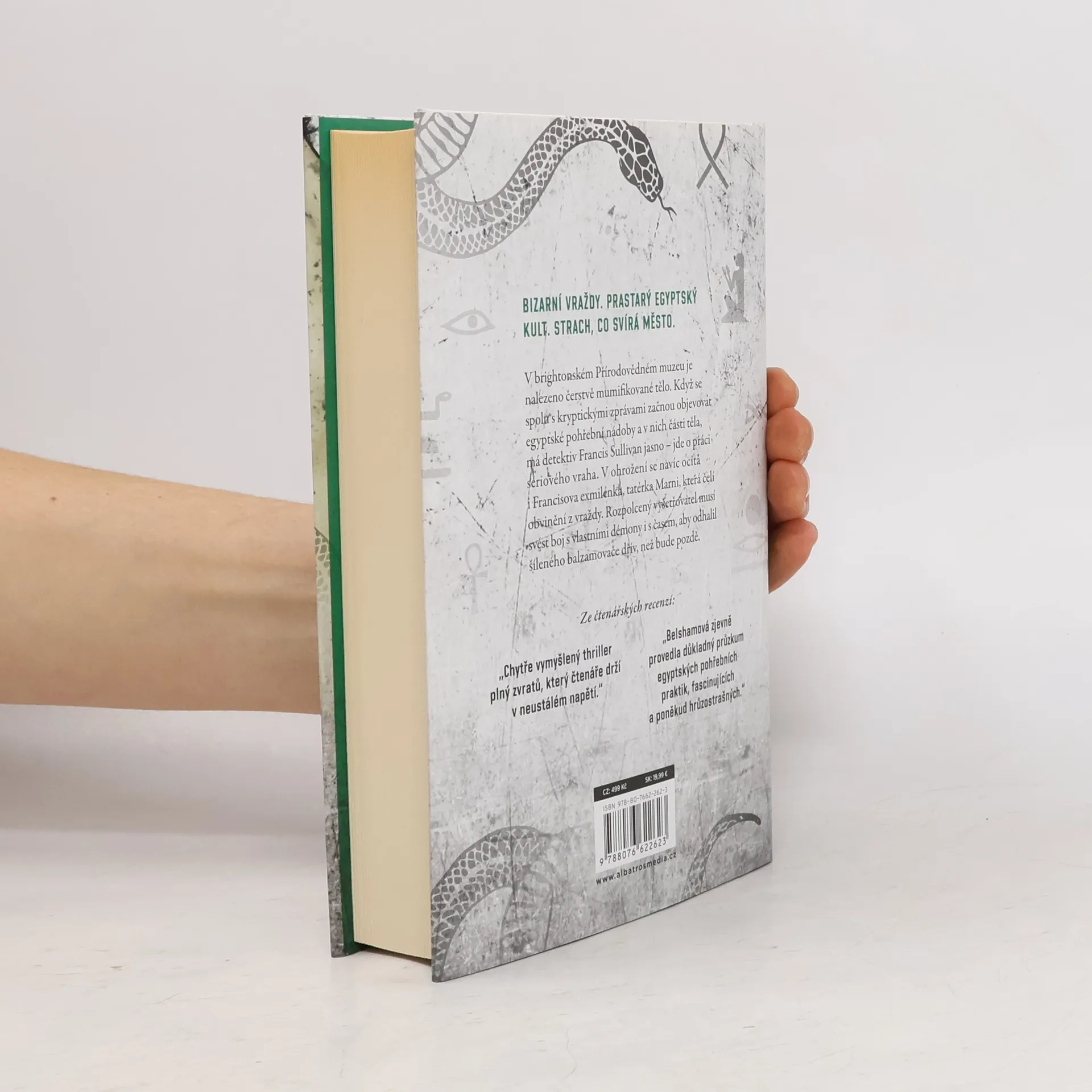 Bizarní vraždy. Prastarý kult. Strach, co svírá město. Knihám označeným zlatou pečetí Edice TOP věnujte zvýšenou pozornost! Předchází je pověst největších světových bestsellerů, které se dočkaly vřelého přijetí kritiky i čtenářů nebo získaly významná literární ocenění. TŘETÍ NAPÍNAVÝ PŘÍPAD INSPEKTORA FRANCISE SULLIVANA OD AUTORKY BESTSELLERU TATÉRKA. V brightonském Přírodovědném muzeu je nalezeno čerstvě mumifikované tělo. Když se spolu s kryptickými zprávami začnou objevovat egyptské pohřební nádoby a v nich části těla, má detektiv Francis Sullivan jasno – jde o práci sériového vraha. V ohrožení se navíc ocitá i Francisova exmilenka, tatérka Marni, která čelí obvinění z vraždy. Rozpolcený vyšetřovatel musí svést boj s vlastními démony i s časem, aby odhalil šíleného balzamovače dřív, než bude pozdě.