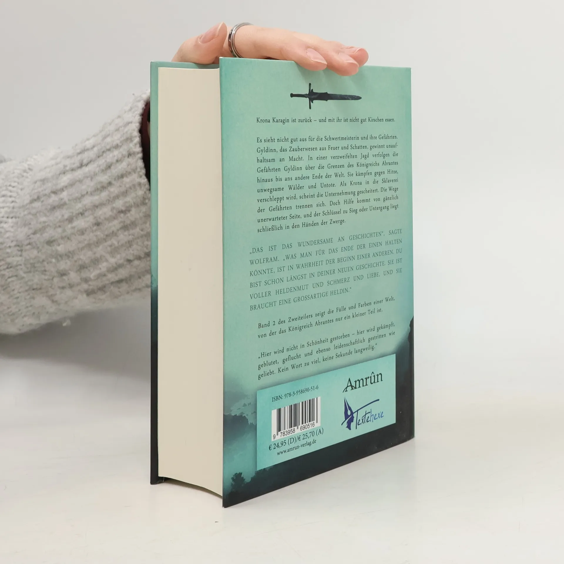 Krona Karagin ist zurück – und mit ihr ist nicht gut Kirschen essen. Es sieht nicht gut aus für die Schwertmeisterin und ihre Gefährten. Gyldinn, das Zauberwesen aus Feuer und Schatten, gewinnt unaufhaltsam an Macht. In einer verzweifelten Jagd verfolgen die Gefährten Gyldinn über die Grenzen des Königreichs Abrantes hinaus bis ans andere Ende der Welt. Sie kämpfen gegen Hitze, unwegsame Wälder und Untote. Als Krona in die Sklaverei verschleppt wird, scheint die Unternehmung gescheitert. Die Wege der Gefährten trennen sich. Doch Hilfe kommt von gänzlich unerwarteter Seite, und der Schlüssel zu Sieg oder Untergang liegt schließlich in den Händen der Zwerge. 'Das ist das Wundersame an Geschichten', sagte Wolfram. 'Was man für das Ende der einen halten könnte, ist in Wahrheit der Beginn einer anderen. Du bist schon längst in deiner neuen Geschichte. Sie ist voller Heldenmut und Schmerz und Liebe, und sie braucht eine großartige Heldin.' Band 2 der Feuerjäger-Reihe zeigt die Fülle und Farben einer Welt, von der das Königreich Abrantes nur ein kleiner Teil ist.