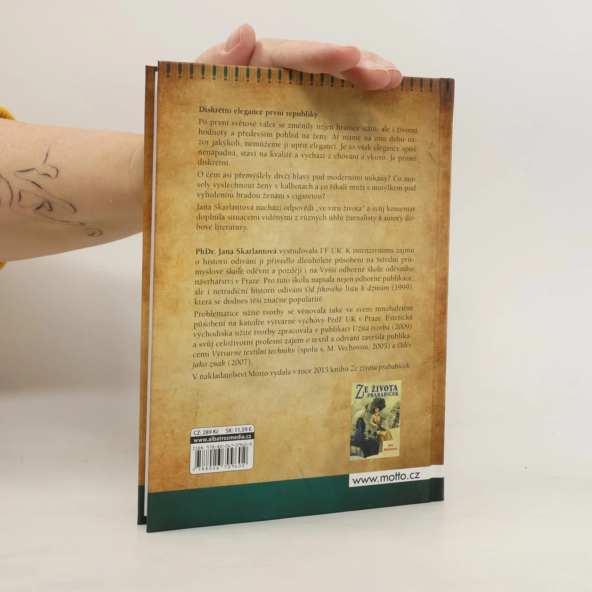 Po první světové válce se změnily nejen hranice států, ale i životní hodnoty a především pohled na ženy. Ať máme na onu dobu názor jakýkoli, nemůžeme jí upřít eleganci. Je to však elegance spíše nenápadná, staví na kvalitě a vychází z chování a vkusu. Je prostě diskrétní. O čem asi přemýšlely dívčí hlavy pod moderními mikády? Co musely vyslechnout ženy v kalhotách a co říkali muži s motýlkem pod vyholenou bradou ženám s cigaretou? Jana Skarlantová nachází odpovědi „ve víru života“ a svůj komentář doplnila situacemi viděnými z různých úhlů žurnalisty a autory dobové literatury.