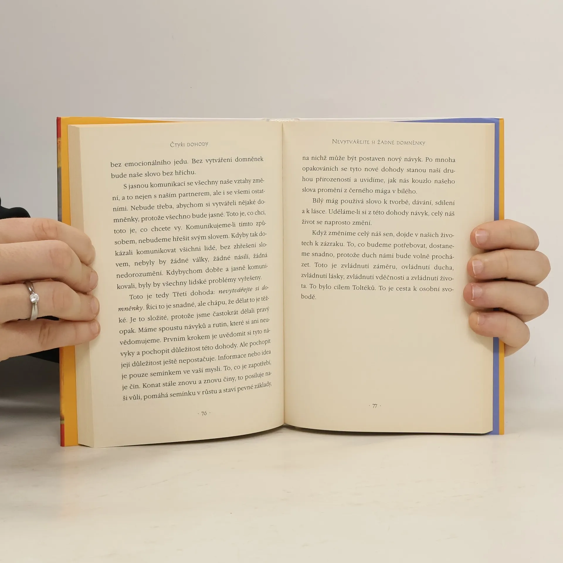 Praktický průvodce osobní svobodou. Ve Čtyřech dohodách odhaluje don Miguel Ruiz zdroj omezujících názorů, které nás připravují o radost a vedou k zbytečnému utrpení. Čtyři dohody, založené na staré toltécké moudrosti, nabízejí silný kód chování, který dokáže rychle proměnit náš život v nový prožitek svobody, opravdového štěstí a lásky.
