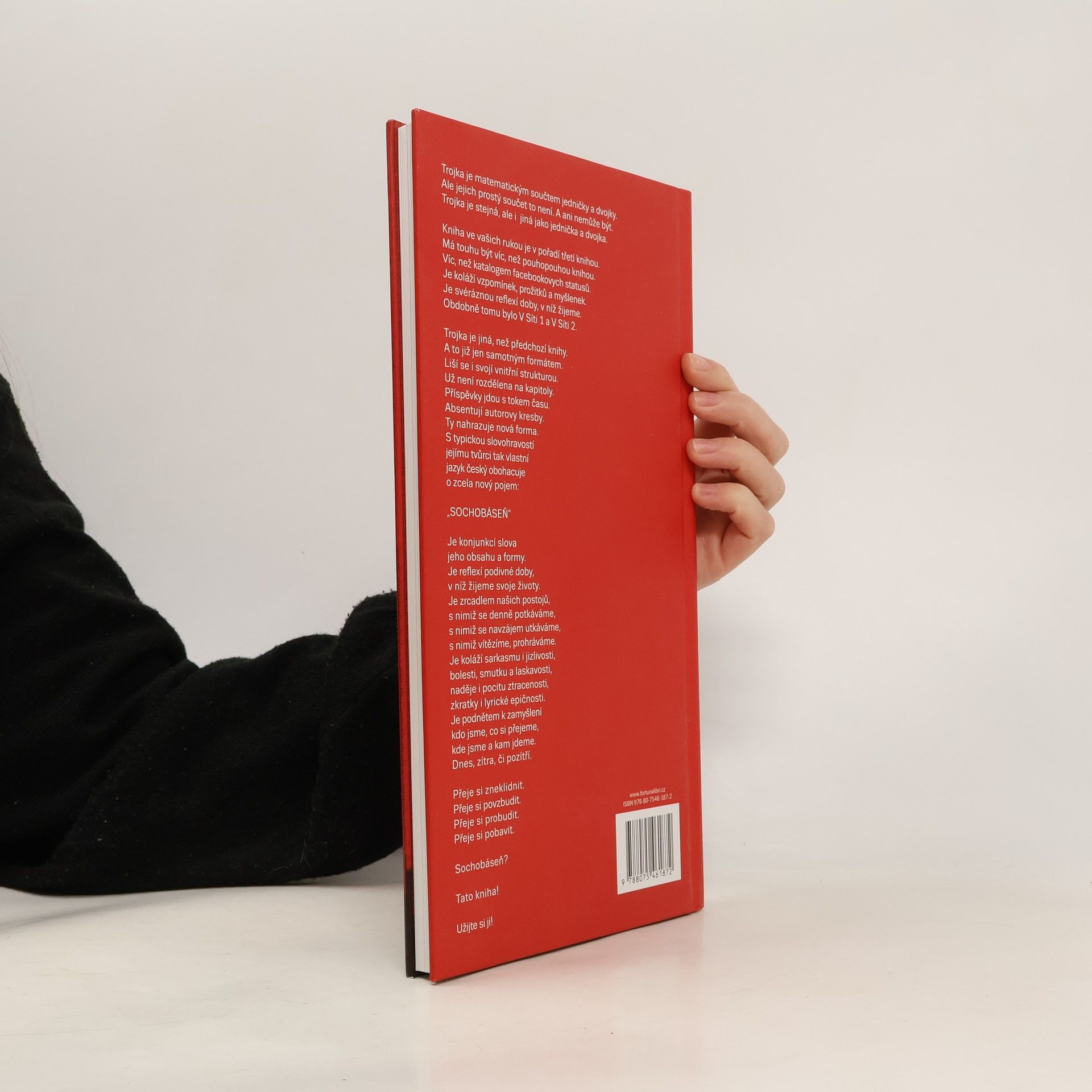 Trojka je matematickým součtem jedničky a dvojky. Ale jejich prostý součet to není. A ani nemůže být. Trojka je stejná, ale i jiná jako jednička a dvojka. Kniha ve vašich rukou je v pořadí třetí knihou. Má touhu být víc, než pouhopouhou knihou. Víc, než katalogem facebookovych statusů. Je koláží vzpomínek, prožitků a myšlenek. Je svéráznou reflexí doby, v níž žijeme. Obdobně tomu bylo V Síti 1 a V Síti 2. Trojka je jiná, než předchozí knihy. A to již jen samotným formátem. Liší se i svojí vnitřní strukturou. Už není rozdělena na kapitoly. Příspěvky jdou s tokem času. Absentují autorovy kresby. Ty nahrazuje nová forma. S typickou slovohravostí jejímu tvůrci tak vlastní jazyk český obohacuje o zcela nový pojem: „SOCHOBÁSEŇ“ Je konjunkcí slova jeho obsahu a formy. Je reflexí podivné doby, v níž žijeme svoje životy. Je zrcadlem našich postojů, s nimiž se denně potkáváme, s nimiž se navzájem utkáváme, s nimiž vítězíme, prohráváme. Je koláží sarkasmu i jizlivosti, bolesti, smutku a laskavosti, naděje i pocitu ztracenosti, zkratky i lyrické epičnosti. Je podnětem k zamyšlení kdo jsme, co si přejeme, kde jsme a kam jdeme. Dnes, zítra, či pozítří. Přeje si zneklidnit. Přeje si povzbudit. Přeje si probudit. Přeje si pobavit. Sochobáseň? Tato kniha! Užijte si ji!