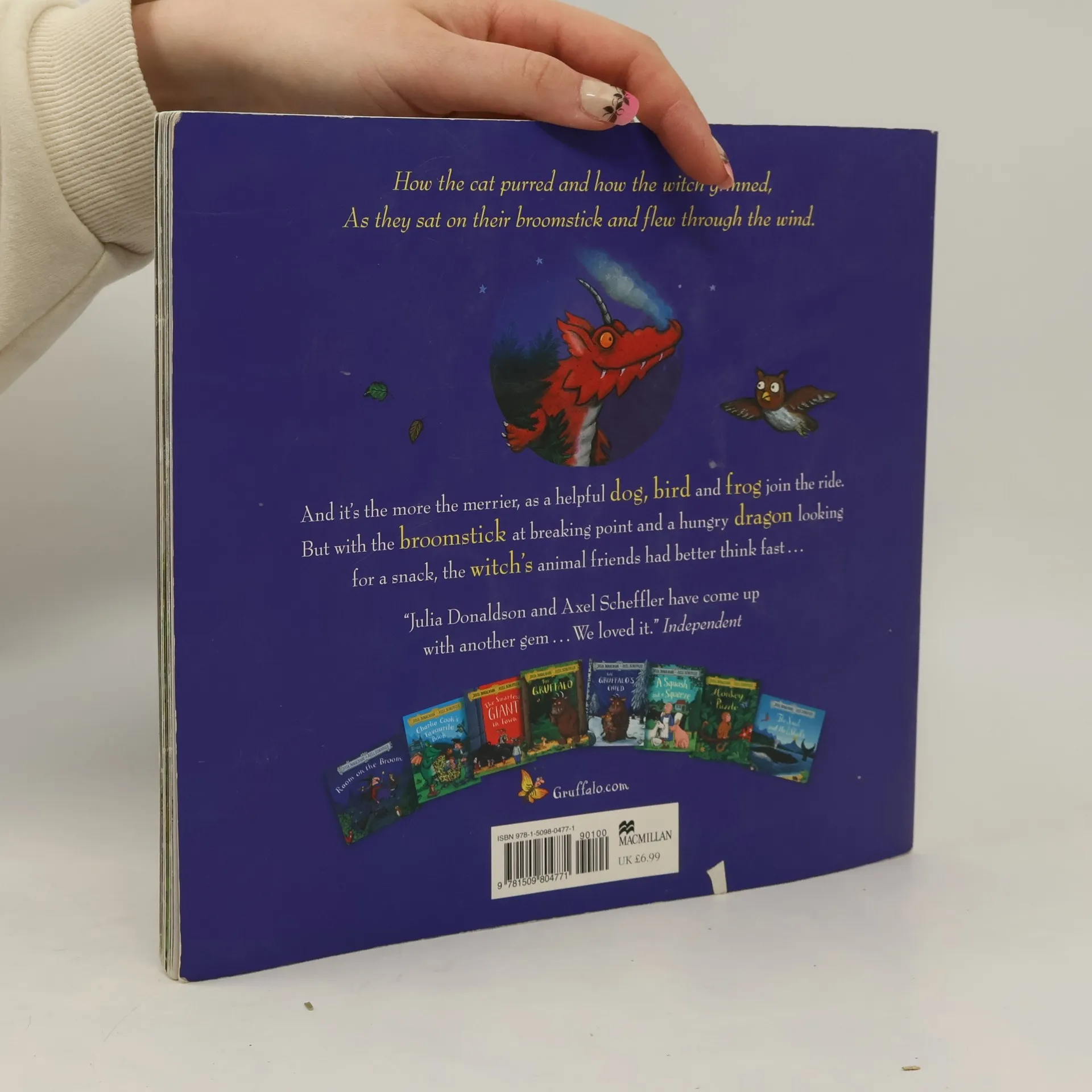 Join the witch and her animal friends for a broomstick adventure!"How the cat purred and how the witch grinned, As they sat on their broomstick and flew through the wind." The witch and her cat fly happily over forests, rivers and mountains on their broomstick until a stormy wind blows away the witch's hat, bow and wand. Luckily, they are retrieved by a dog, a bird and a frog, who are all keen for a ride on the broom. It's a case of the more, the merrier, but the broomstick isn't used to such a heavy load and it's not long before... SNAP! It breaks in two! And with a greedy dragon looking for a snack, the witch's animal pals better think fast. A very funny story of quick wits and friendship, The Room on the Broom is another smash hit from the unparalleled picture-book partnership of Julia Donaldson and Axel Scheffler, creators of The Gruffalo. This edition features the captivating classic story with a stunning, redesigned cover and beautiful finish, making it a must-have addition to the bookshelves of all Donaldson and Scheffler fans - big and small! Also available with redesigned covers are The Gruffalo, The Gruffalo's Child, The Snail and the Whale, The Smartest Giant in Town, Monkey Puzzle, Charlie Cook's Favourite Book, and A Squash and a Squeeze.