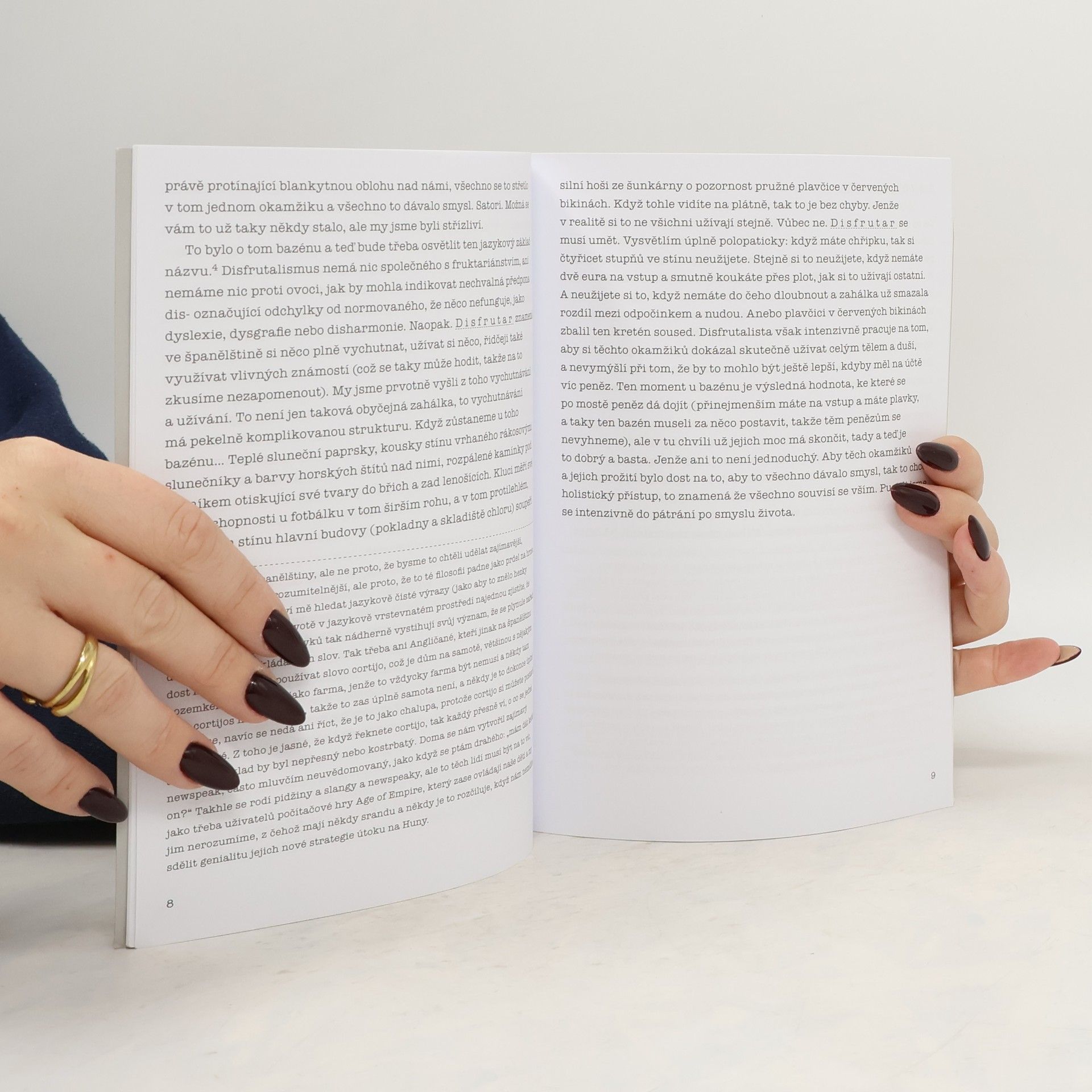Disfrutalismus je umění vychutnávání a užívání si života. Autorka popisuje svoji osobní zkušenost života na španělském venkově a jazykem lidového antropologa popisuje, jak nás dnešní doba od onoho užívání si cíleně odcizuje. Se závěrečným desaterem lze jen souhlasit a doufat, že se nám to někde podaří.