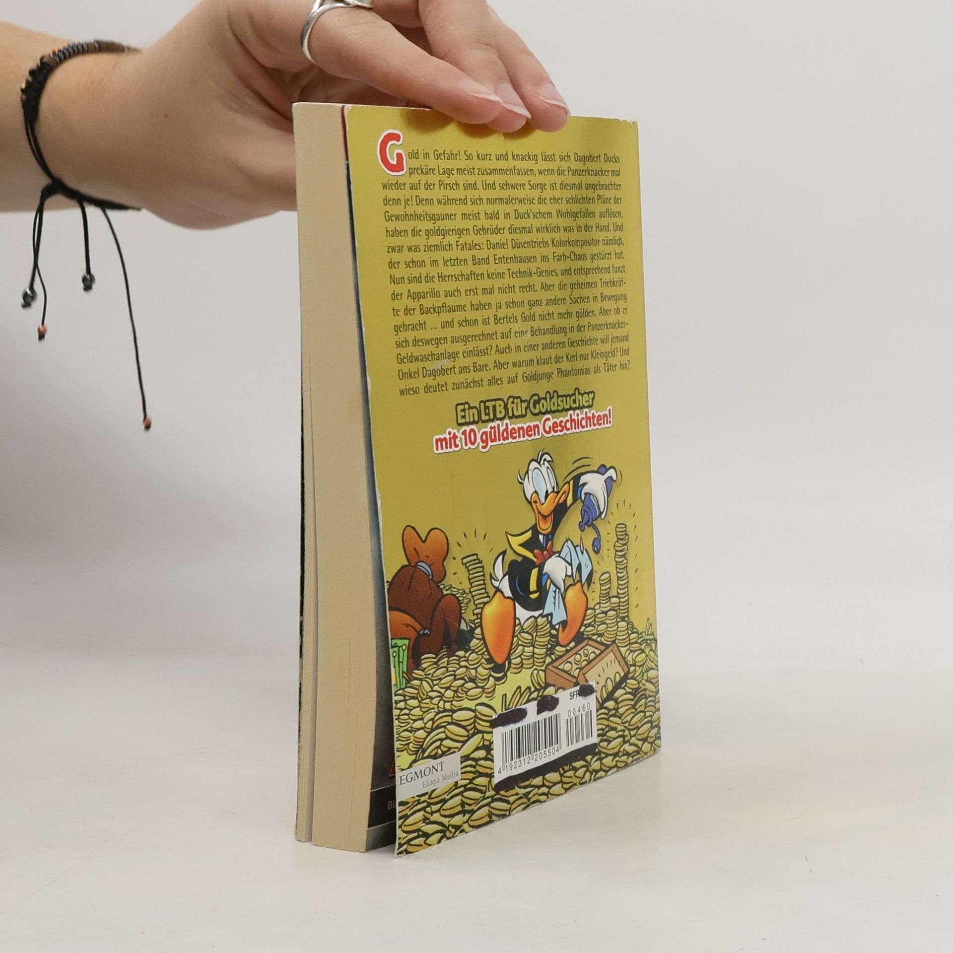 Gold in Gefahr! So kurz und knackig lässt sich Dagobert Ducks prekäre Lage meist zusammenfassen, wenn die Panzerknacker mal wieder auf der Pirsch sind. Und schwere Sorge ist diesmal angebrachter denn je! Denn während sich normalerweise die eher schlichten Pläne der Gewohnheitsgauner meist bald in Duck’schem Wohlgefallen auflösen,haben die goldgierigen Gebrüder diesmal wirklich was in der Hand. Und zwar was ziemlich Fatales: Daniel Düsentriebs Kolorkompositor nämlich, der schon im letzten Band Entenhausen ins Farb-Chaos gestürzt hat. Nun sind die Herrschaften keine Technik-Genies, und entsprechend funzt der Apparillo auch erst mal nicht recht. Aber die geheimen Triebkräfte der Backpflaume haben ja schon ganz andere Sachen in Bewegung gebracht … und schon ist Bertels Gold nicht mehr gülden. Aber ob er sich deswegen ausgerechnet auf eine Behandlung in der Panzerknacker-Geldwaschanlage einlässt? Auch in einer anderen Geschichte will jemandOnkel Dagobert ans Bare. Aber warum klaut der Kerl nur Kleingeld? Und wieso deutet zunächst alles auf Goldjunge Phantomias als Täter hin?