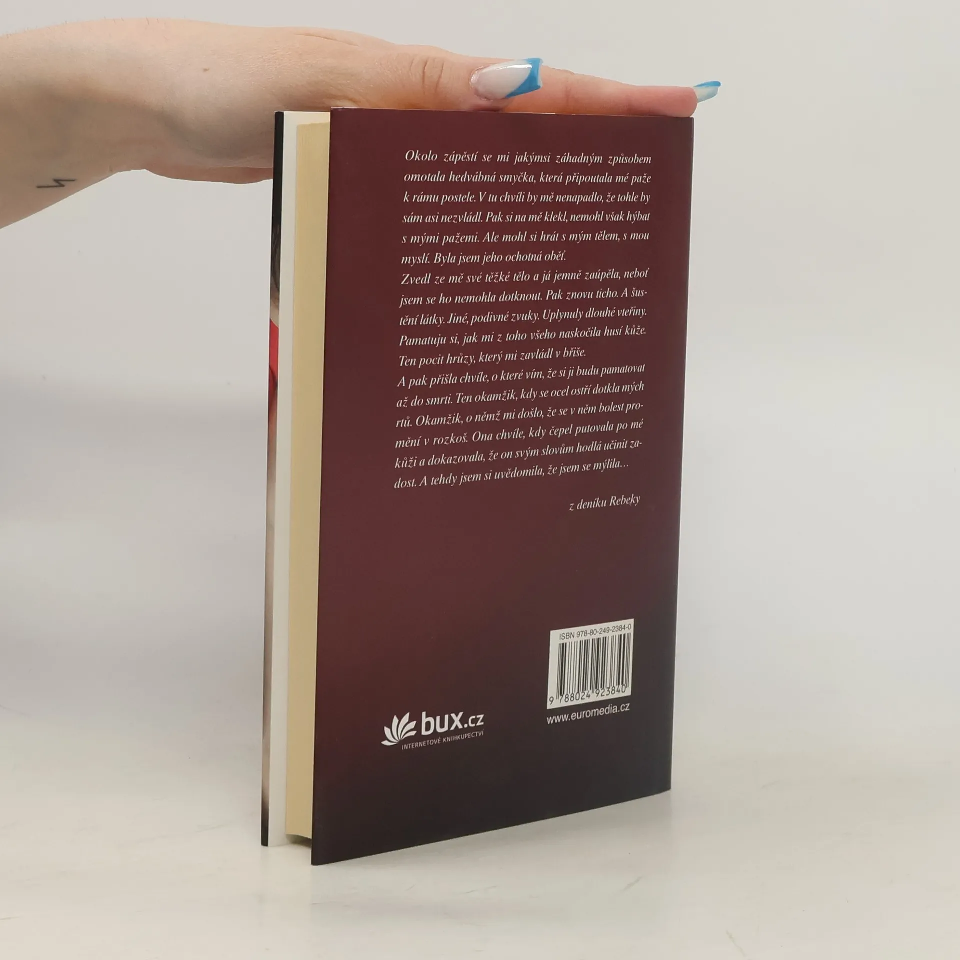 Mladé učitelce Sáře se náhodou dostane do rukou deník jakési Rebeccy, v němž objeví lechtivé dopisy, které si majitelka deníku vyměňovala s neznámým mužem. Sára neodolá pokušení a rozhodne se číst dále… Čím více se do deníku noří, tím více také propadá příběhu bouřlivé milostné aféry, plné divokého a drsného sexu, až už pomalu nedokáže myslet na nic jiného. Když ale deníkové záznamy zničehonic končí, Sára se rozhodne vypátrat, co se s Rebbecou stalo. Stopy jí zavedou do galerie moderního umění, kde se seznamuje s dvě přitažlivými muži. Který z nich byl milencem Rebeccy? Sára se ale sama ocitá ve víru odvážných, ale i nebezpečných vášnivých zážitků a čím dál více ochutnává ze zakázaného ovoce. Co se ale stane, pokud se jí nepodaří vymanit z role poslušné otrokyně? Vzrušující a provokativní příběh, ze kterého se vám rozbuší srdce.