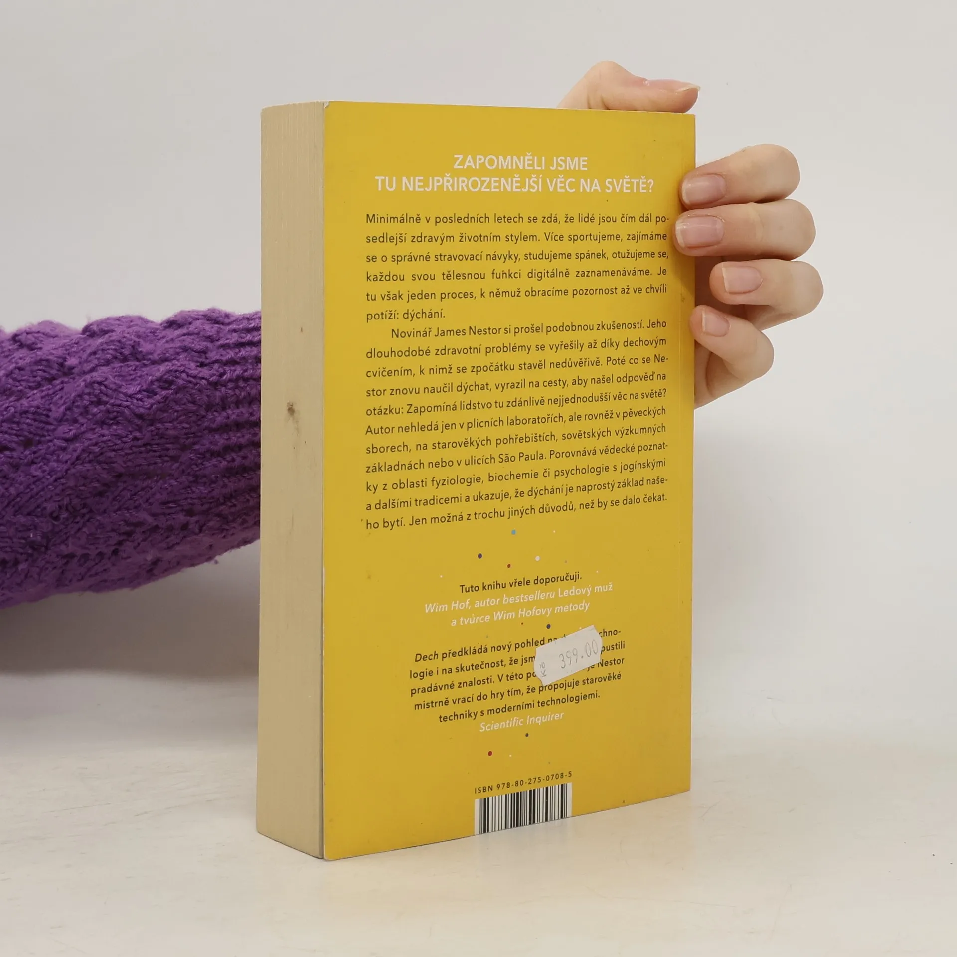 Nádech, výdech a znovu. Zapomněli jsme tu nejpřirozenější věc na světě? Minimálně v posledních letech se zdá, že lidé jsou čím dál posedlejší zdravým životním stylem. Více sportujeme, zajímáme se o správné stravovací návyky, studujeme spánek, otužujeme se, každou tělesnou funkci digitálně zaznamenáváme. Je tu však jeden proces, k němuž obracíme pozornost až ve chvíli potíží: dýchání. Novinář James Nestor si prošel podobnou zkušeností. Jeho dlouhodobé zdravotní problémy se vyřešily až díky dechovým cvičením, k nimž se zpočátku stavěl nedůvěřivě. Poté co se Nestor znovu naučil dýchat, vyrazil na cesty, aby našel odpověď na otázku: Zapomíná lidstvo tu zdánlivě nejjednodušší věc na světě? Autor nehledá jen v plicních laboratořích, ale rovněž u pěveckých sborů, na starověkých pohřebištích, sovětských výzkumných základnách nebo v ulicích Săo Paula. Porovnává vědecké poznatky z oblasti fyziologie, biochemie či psychologie s jogínskými a dalšími tradicemi a ukazuje, že dýchání je naprostý základ našeho bytí. Jen možná trochu jinak, než by se dalo čekat.