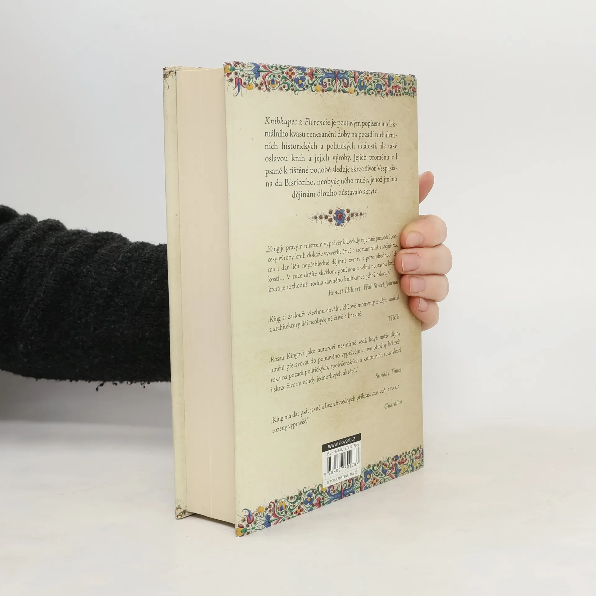 Knihy, jak je známe dnes, vznikly až v době renesance. Nahradily krasopisně psané iluminované pergameny, které se prodávaly v krámcích připomínajících papírnictví. Jak k této revoluci došlo, vypráví autor na příběhu slavného knihkupce Vespasiana da Bisticciho. K práci v knihkupectví v takzvané knihkupecké ulici se Vespasiano dostal už jako malý chlapec, když musel kvůli dluhům svého otce skončit se školou. V následujících letech se vypracoval na krále evropských knihkupců, který tvořil na objednávku knížat i samotného papeže jedinečné rukopisy. Kromě toho také objevoval a popularizoval zapomenuté antické texty. To vše také díky tomu, že obyvatelé tehdejší Itálie rádi četli. V renesanční Florencii to uměl každý sedmý člověk, dokonce i ženy a dívky, což bylo mnohonásobně víc než v jiných evropských městech. Autor podrobně a věrohodně popisuje Florencii 15. století, každodennost v knihkupecké ulici a samotném knihkupectví, ale také milovníky knih, filosofy, učence i jeptišky, které byly prvními sazečkami. To vše na pozadí historických a politických zvratů, které renesanci a vznik knihtisku doprovázely.