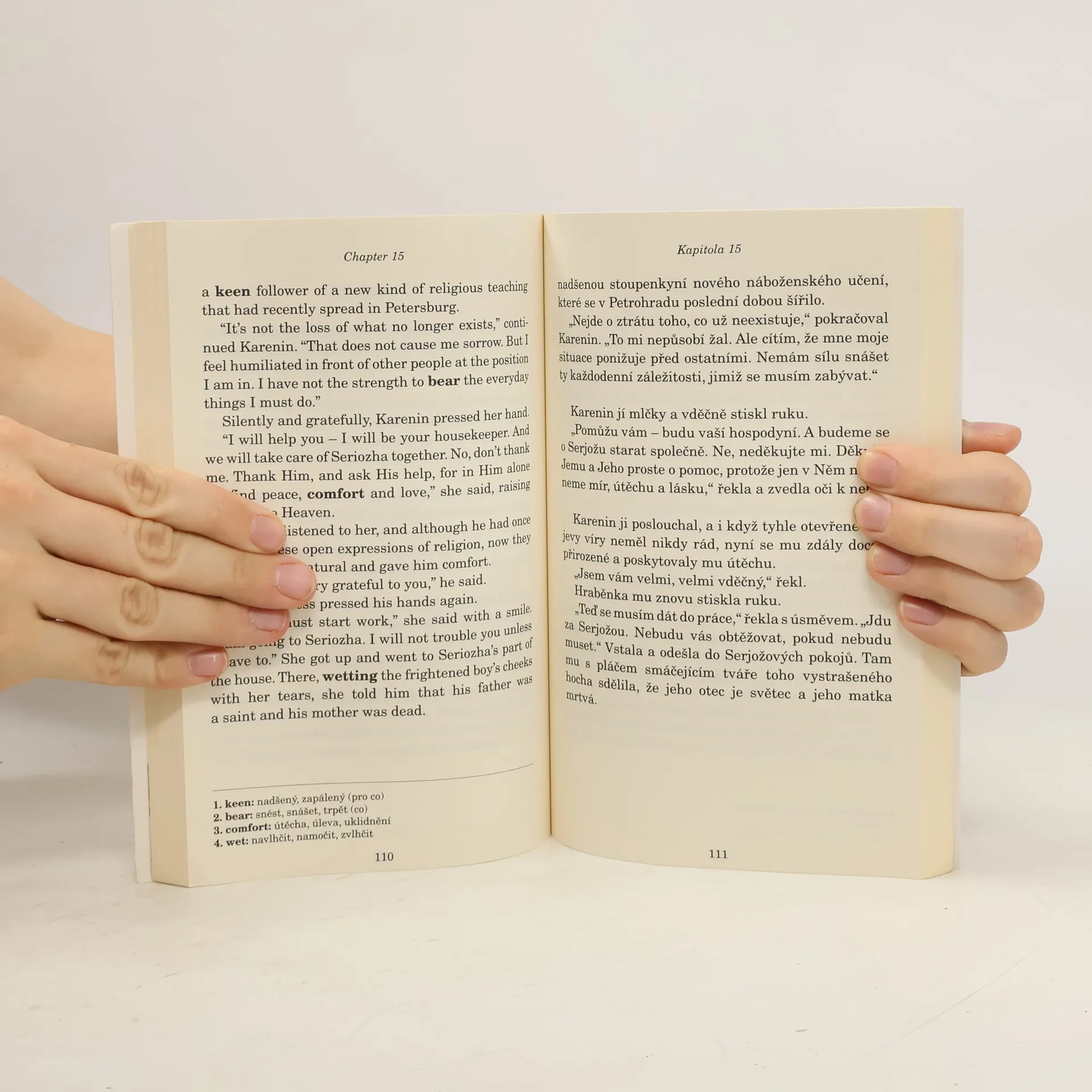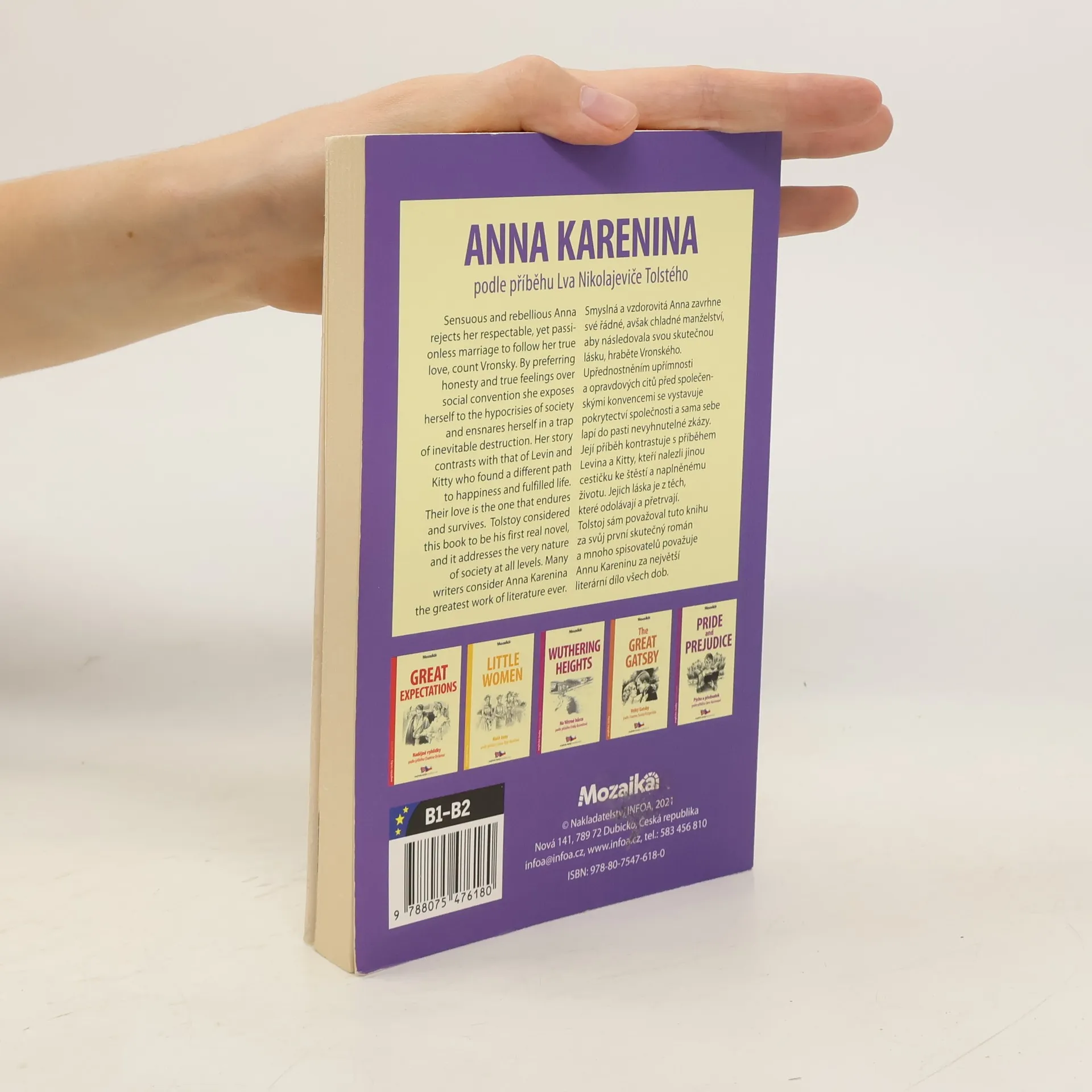 Smyslná a vzdorovitá Anna zavrhne své řádné, avšak chladné manželství, aby následovala svou skutečnou lásku, hraběte Vronského. Upřednostněním upřímnosti a opravdových citů před společenskými konvencemi se vystavuje pokrytectví společnosti a sama sebe lapí do pasti nevyhnutelné zkázy. Její příběh kontrastuje s příběhem Levina a Kitty, kteří nalezli jinou cestičku ke štěstí a naplněnému životu. Jejich láska je z těch, které odolávají a přetrvají. Tolstoj sám považoval tuto knihu za svůj první skutečný román a mnoho spisovatelů považuje Annu Kareninu za největší literární dílo všech dob. Anglicko-český zrcadlový text pro mírně pokročilé Sensual and defiant Anna rejects her proper but cold marriage to follow her true love, Count Vronsky. By prioritizing sincerity and true feelings over social conventions, he exposes himself to the hypocrisy of society and traps himself into the inevitable doom. Her story contrasts with the story of Levin and Kitty, who found another path to happiness and a full life. Their love is one that resists and persists. Tolstoy himself considered this book to be his first real novel, and many writers consider Anna Karenina to be the greatest literary work of all time. English-Czech mirror text for intermediate students