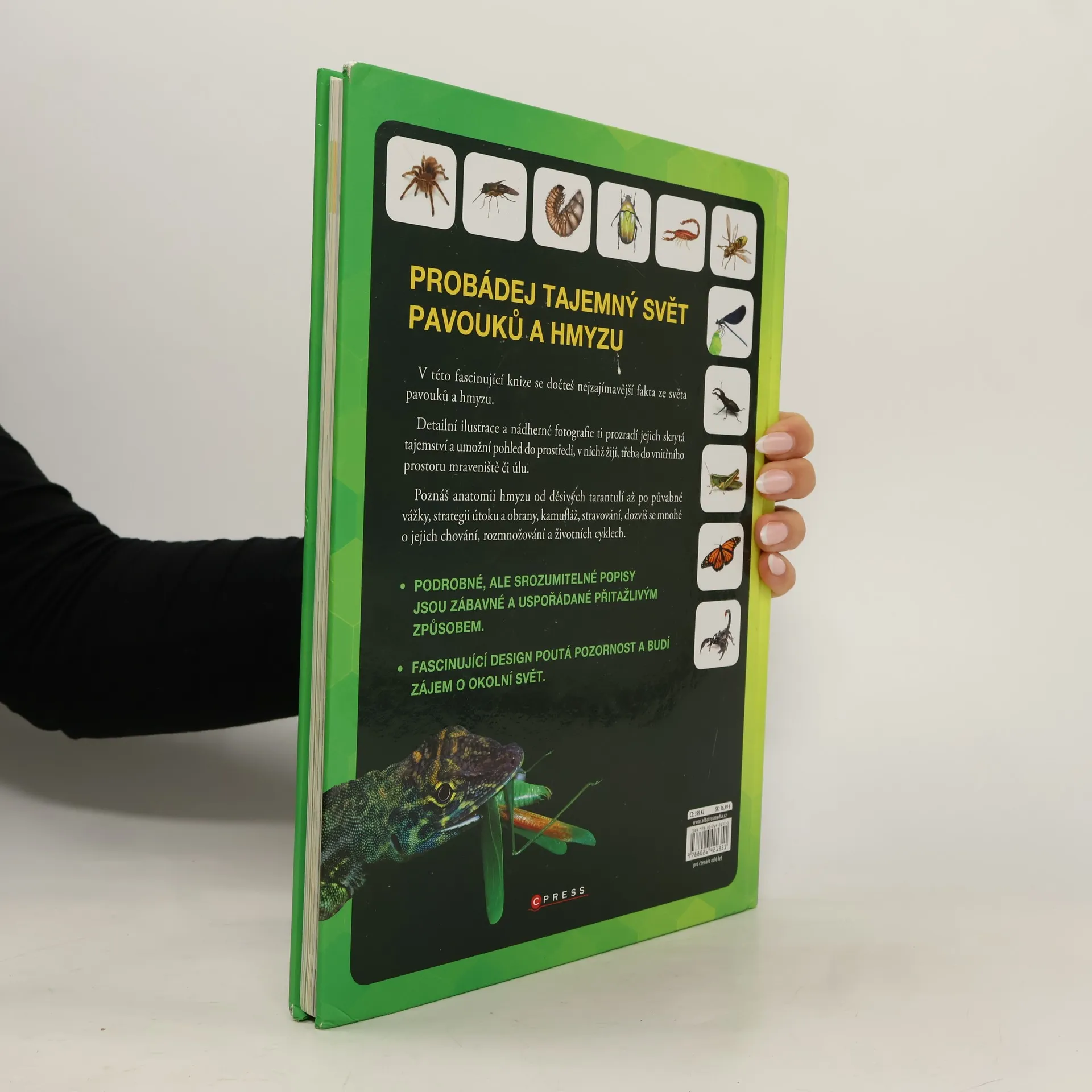 V této fascinující knize se dočteš nejzajímavější fakta ze světa pavouků a hmyzu. Detailní ilustrace a nádherné fotografie ti prozradí jejich skrytá tajemství a umožní pohled do prostředí, v nichž žijí, třeba do vnitřního prostoru mraveniště či úlu. Poznáš anatomii hmyzu od děsivých tarantulí až po půvabné vážky, seznámíš se se strategií jejich útoku a obrany, kamufláží i s jejich jídelníčkem a dozvíš se mnohé o jejich chování, rozmnožování a životních cyklech.
