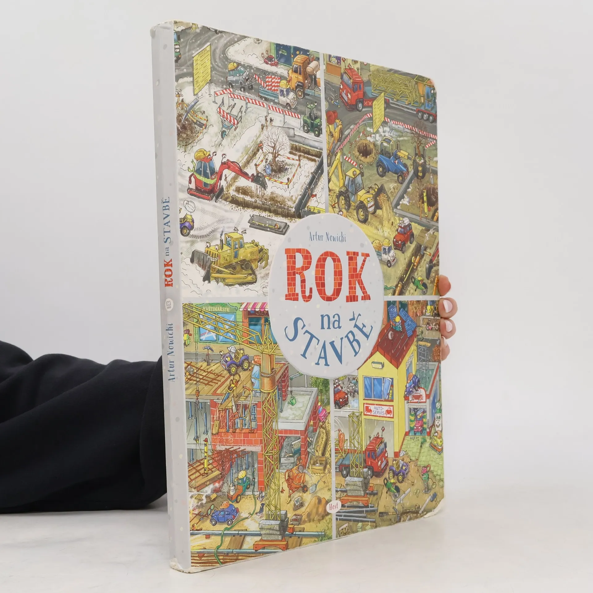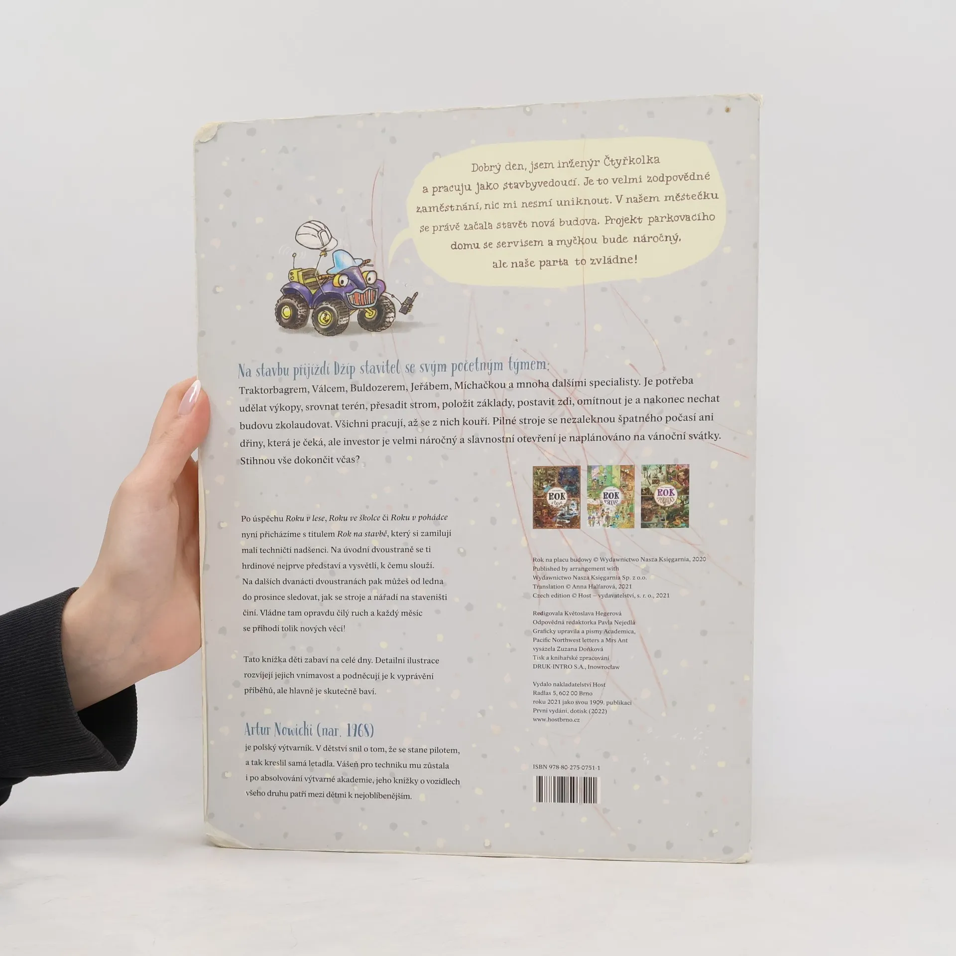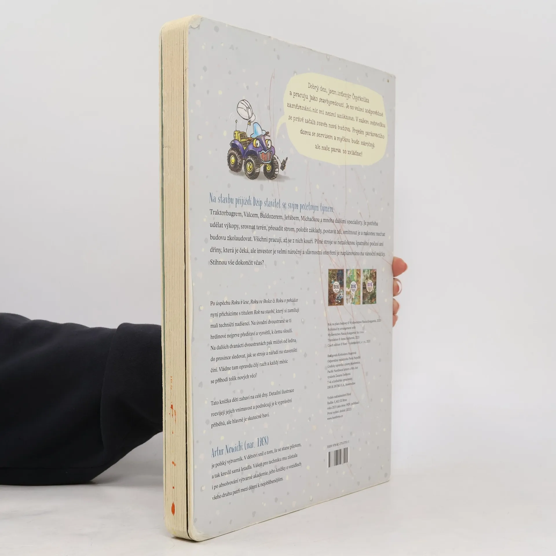 Konečně přírůstek do rodiny Roků, který uspokojí malé technické nadšence! S vášní pro vozidla se některé děti rodí. A zejména stavební stroje v nich vzbuzují úžas srovnatelný s fascinací jiného dětského kmene — pro dinosaury. Poznáte je snadno. Jejich první slovo není „máma“, ale „moto“. Hřiště je nebaví, zato na nedalekém staveništi dokážou dělat odborný stavební dozor klidně půl směny. Ve dvou letech vám vysvětlí rozdíl mezi bagrem pásovým a kolovým a na rozdíl od vás vědí, že žába neskáče jen po blátě, ale taky na stavbě a ve skutečnosti se jí říká vibrační pěch. Po úspěšném Roku v lese, Roku ve školce či Roku v pohádce přibude do této série další svazek — Rok na stavbě. Od ledna do prosince můžete sledovat čilý ruch na staveništi: od vyměřování přes terénní úpravy a výstavbu až po závěrečnou kolaudaci. Polidštěné stavební stroje a další užitečné nástroje mají osobitý charakter a jejich pracovní nasazení lze sledovat v rámci daného měsíce i napříč celým rokem. Přehledně je představí úvodní dvoustrana, která dětem (i vám! ) osvětlí mnohé technické procesy související se stavbou.