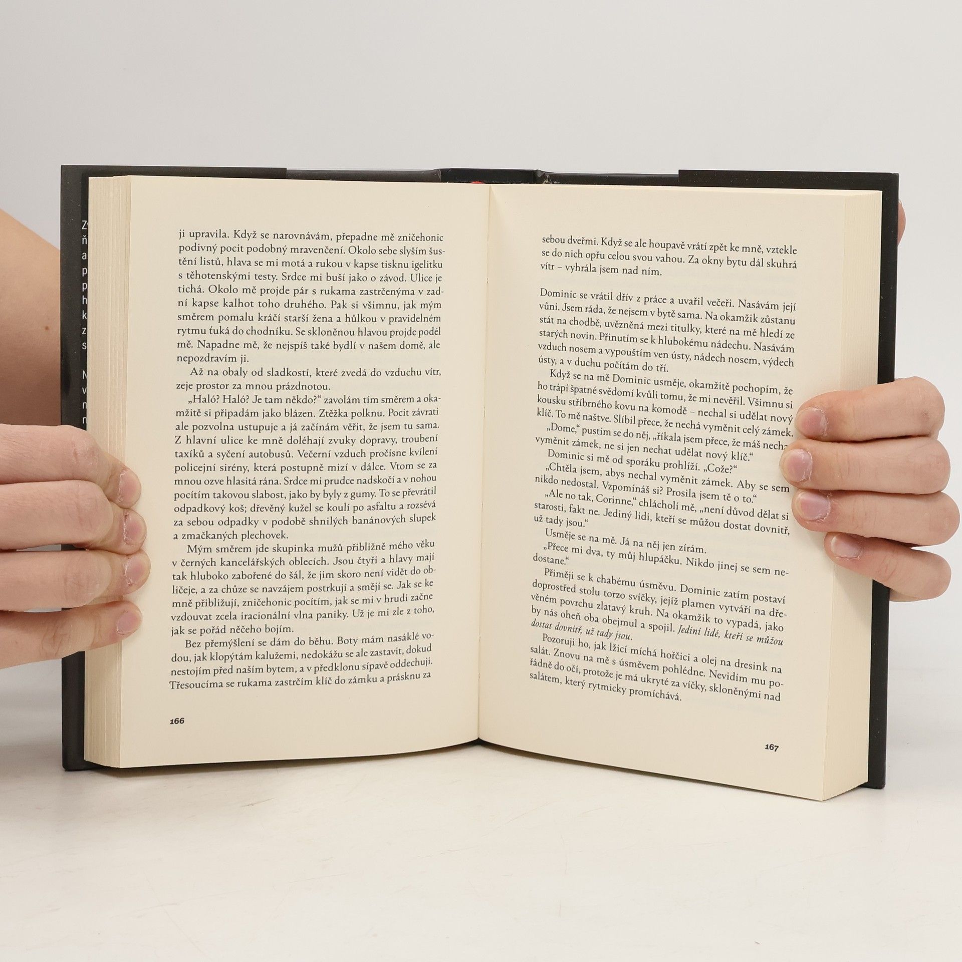 Nikdy nevíte, kdo se dívá… Zvenku možná vypadá Corinnin život jako dokonalá idylka, ale ve skutečnosti má po třech nevydařených pokusech o umělé oplodnění poslední šanci přivést na svět vlastní dítě. Když tedy jednoho dne najde před dveřmi svého bytu malý kousek domečku pro panenky, považuje to za znamení. Potom se však začnou objevovat další kousky a Corinne si začíná uvědomovat, že jí připadají až příliš povědomé. Někdo ví o jejím miniaturním houpacích koníkovi i o panence v červených sametových šatech. Někdo byl v jejím domě… Odkud znají cizí lidé tolik detailů z jejího života? Jak dlouho už ji sledují? A na co čekají…? Ponořte se do děje strhujícího psychologického thrilleru, který vás překvapí nečekaným rozuzlením.