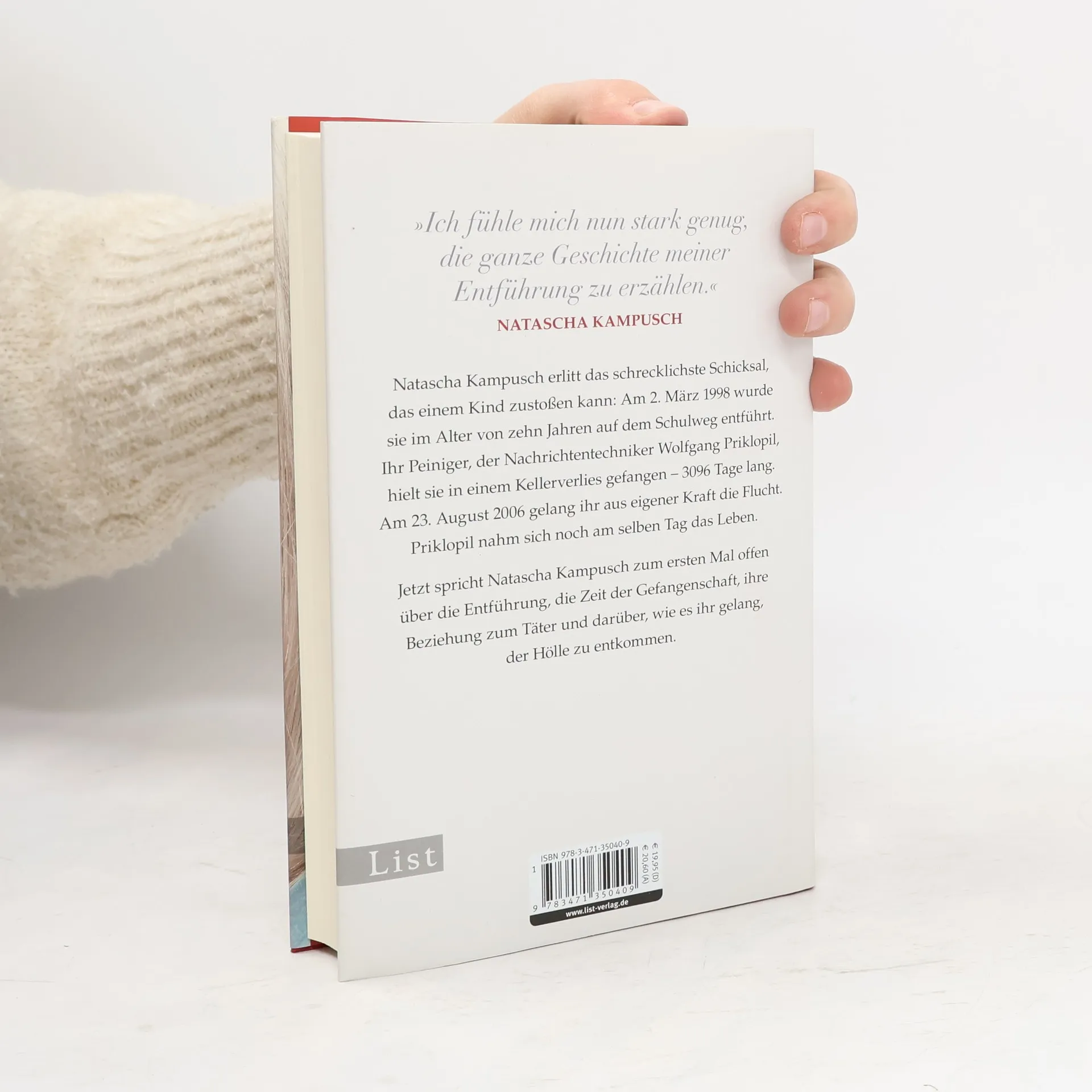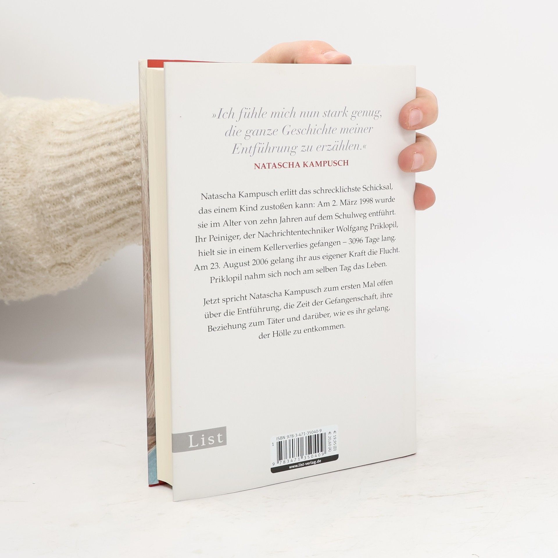 Natascha Kampusch erlitt das schrecklichste Schicksal, das einem Kind zustoßen kann: Am 2. März 1998 wurde sie im Alter von zehn Jahren auf dem Schulweg entführt. Ihr Peiniger, der Nachrichtentechniker Wolfgang Priklopil, hielt sie in einem Kellerverlies gefangen - 3096 Tage lang. Am 23. August 2006 gelang ihr aus eigener Kraft die Flucht. Priklopil nahm sich noch am selben Tag das Leben. Jetzt spricht Natascha Kampusch zum ersten Mal offen über die Entführung, die Zeit der Gefangenschaft, ihre Beziehung zum Täter und darüber, wie es ihr gelang, der Hölle zu entkommen.