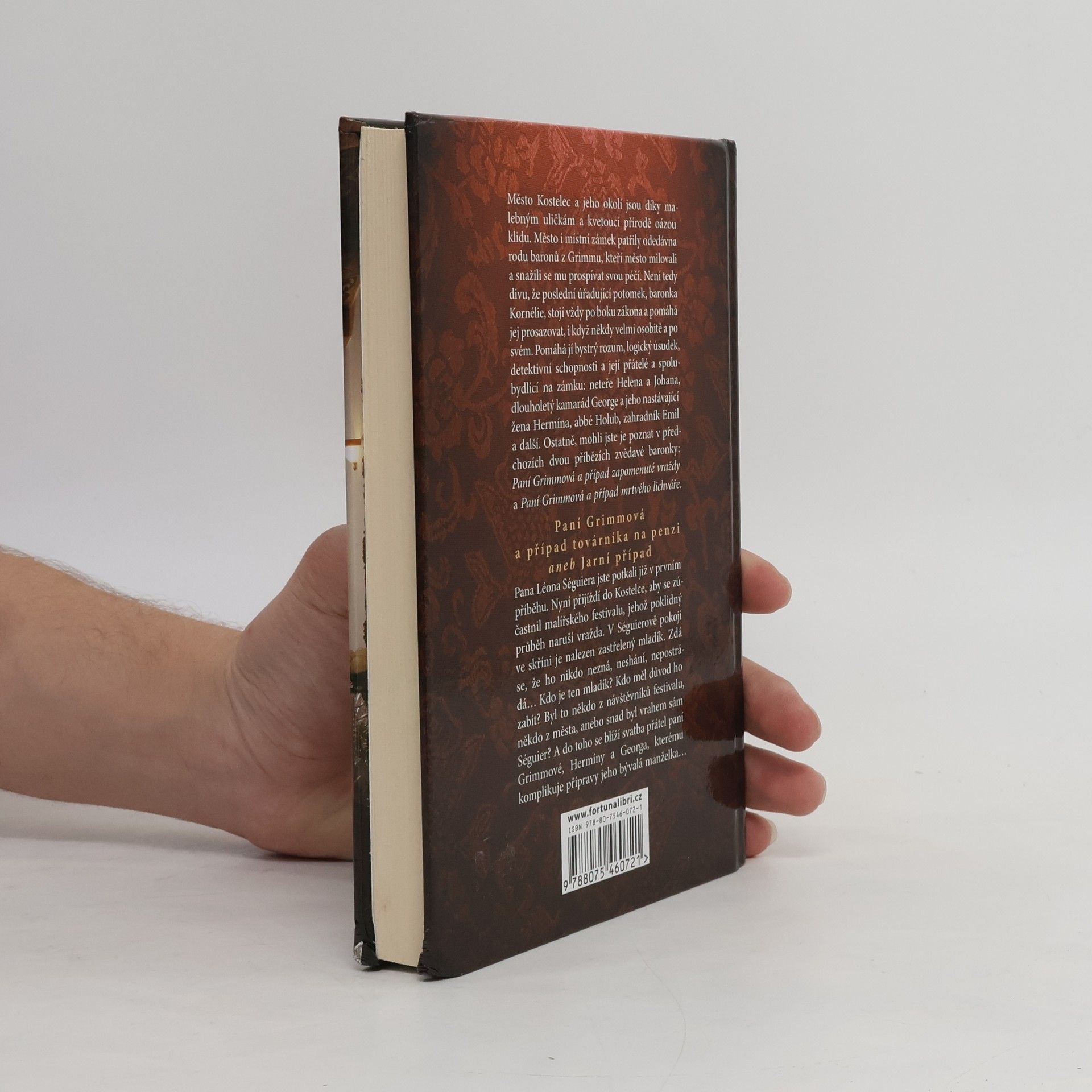 Třetí případ zvědavé baronky Grimmové, hrdinky české detektivní řady pro milovníky románů Agathy Christie. Město Kostelec a jeho okolí jsou díky malebným uličkám a kvetoucí přírodě oázou klidu. Město, i místní zámek patřily odedávna rodu baronů z Grimmu, kteří město milovali a snažili se mu prospívat svou péčí. Není tedy divu, že poslední úřadující potomek, baronka Kornélie, stojí vždy po boku zákona a pomáhá jej prosazovat, i když někdy velmi osobitě a po svém. Pomáhá jí bystrý rozum, logický úsudek, detektivní schopnosti a její přátelé a spolubydlící na zámku: neteře Helena a Johana, dlouholetý kamarád George a jeho nastávající žena Hermína, abbé Holub, zahradník Emil a další. Ostatně, mohli jste je poznat v předchozích dvou příbězích zvědavé baronky: Paní Grimmová a případ zapomenuté vraždy a Paní Grimmová a případ mrtvého lichváře. S panem Léonem Séguierem jste se mohli již setkat v první knize. Nyní přijíždí do Kostelce, aby se zúčastnil malířského festivalu, jehož poklidný průběh naruší vražda. V Séguierově pokoji ve skříni je nalezen zastřelený mladík. Zdá se, že ho nikdo nezná, neshání, nepostrádá… Kdo je ten mladík? Kdo měl důvod ho zabít? Byl to někdo z návštěvníků festivalu, někdo z města, anebo snad byl vrahem sám Séguier? A do toho všeho se blíží svatba přátel paní Grimmové, Hermíny a Georga, kterému komplikuje přípravy jeho bývalá manželka…