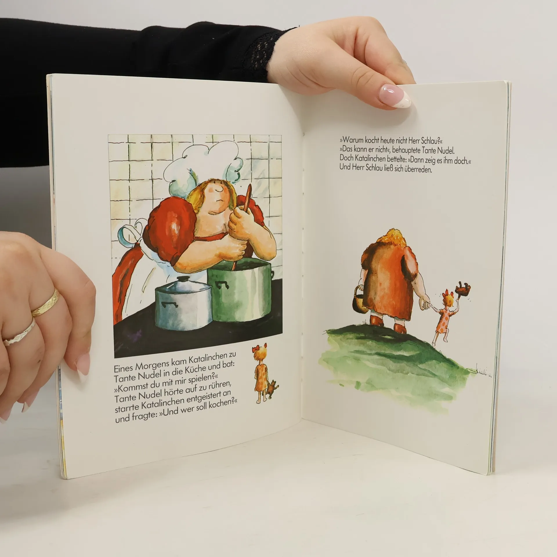 »Warum kocht heute nicht Herr Schlau? « »Das kann er nicht«, behauptete Tante Nudel. Doch Katalinchen bettelte: »Dann zeig es ihm doch.« Katalinchen verbringt ihre großen Ferien mit Tante Nudel, Onkel Ruhe und Herrn Schlau. Weil die aber meist entweder kochen oder für Ruhe und Ordnung sorgen oder lesen müssen, muss sich Katalinchen etwas einfallen lassen, damit sie schließlich doch mit ihr spielen, angeln und Boot fahren.