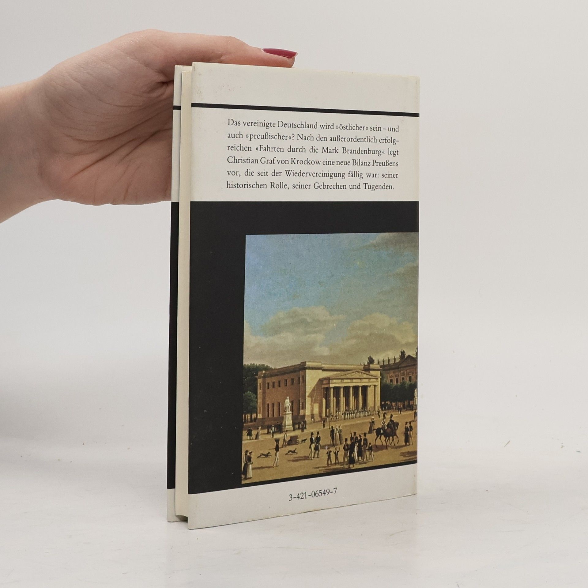 Deutsche Verlags-Anstalt [Published 1994]. Hard cover, 141 pp. Text in German. 4. Auflage. Contents Vorwort; Die Pflicht und das Gluck; Rede zur Heimkehr der Konige nach Potsdarr am 17. August 1991; Der preußische Adel;PreuBen vor seiner nadonalen Herausforderung;Wilhelm I. unid Wilhelm II.; Beamtentum und Bildung; PreuBen und seine Juden;PreuBen und seine Frauen; Traktat uber die Tugenden;Ein persönliches Nachwort; Bucher des Verfassers,die mit dem Thema zu tun haben. [From back of dust jacket] Das vereinigte Deutschland wird »ostlicher« sein-und auch »preuBischer«? Nach den auBerordentlich erfolgreichen »Fahrten durch die Mark Brandenburg« legt Christian Grafvon Krockow eine neue Bilanz PreuBens vor, die seit der Wiedervereinigung fallig seiner historischen Rolle, seiner Gebrechen und Tugenden.