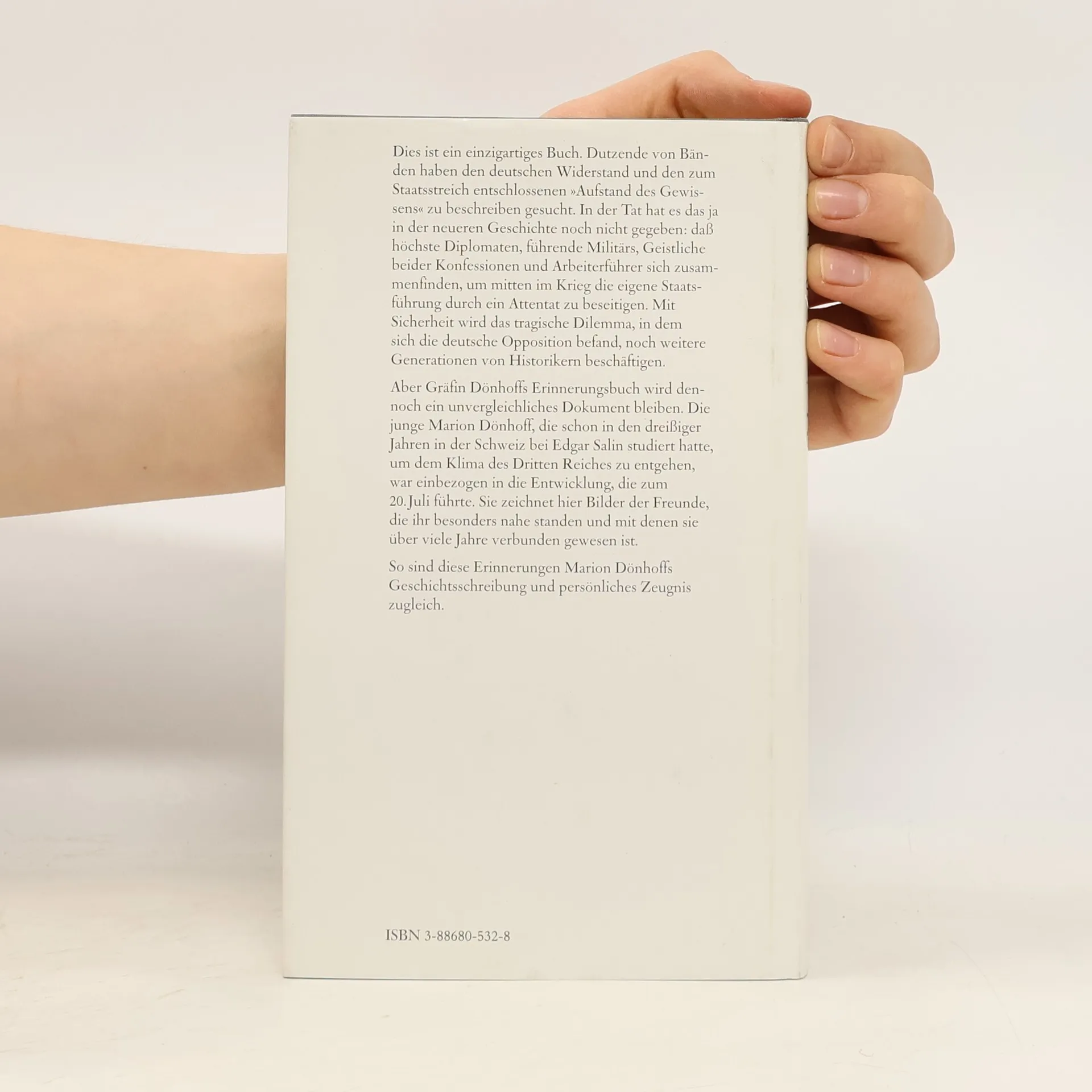 »Die Tatsache, daß ein so einzigartiger Aufstand des Gewissens nicht tiefer in das Bewußtsein der Deutschen eingegangen ist, bleibt immer noch unbegreiflich.«Marion Gräfin DönhoffViele ihrer engsten Freunde gehörten dem Widerstand gegen Hitler an; nach dem gescheiterten Attentat vom 20. Juli 1944 wurden die meisten hingerichtet. Marion Gräfin Dönhoff überlebte, weil ihr Name auf keiner Liste stand. Den toten Freunden setzt sie in diesem Buch ein eindrucksvolles Denkmal. Marion Gräfin Dönhoffs Erinnerungen an die Freunde vom 20. Juli 1944 sind Geschichtsschreibung und persönliches Zeugnis zugleich. Im Vordergrund ihres Buches stehen sieben Männer, die sich gegen Hitler auflehnten und mit denen Dönhoff durch Freundschaft oder Verwandtschaft verbunden war. Ihre Besitzung Friedrichstein war ein regelmäßiger Treffpunkt der Verschwörer, und mitunter hielt Dönhoff die Verbindung zwischen ihnen aufrecht, überbrachte Botschaften oder gewährte Zuflucht – dem Grafen Schulenburg, dem Gutsnachbarn Lehndorff, dem vertrauten Kreisauer Moltke oder auch Adam Trott zu Solz. Dönhoffs Erinnerungen ragen aus den zahlreichen Büchern über den militärischen Widerstand heraus, denn es ist ein aus dem eigenen Erleben geschriebenes Zeugnis, das nicht nur die Menschen zu fassen sucht, auch die Welt, der sie entstammten und die mit ihnen vergangen ist.