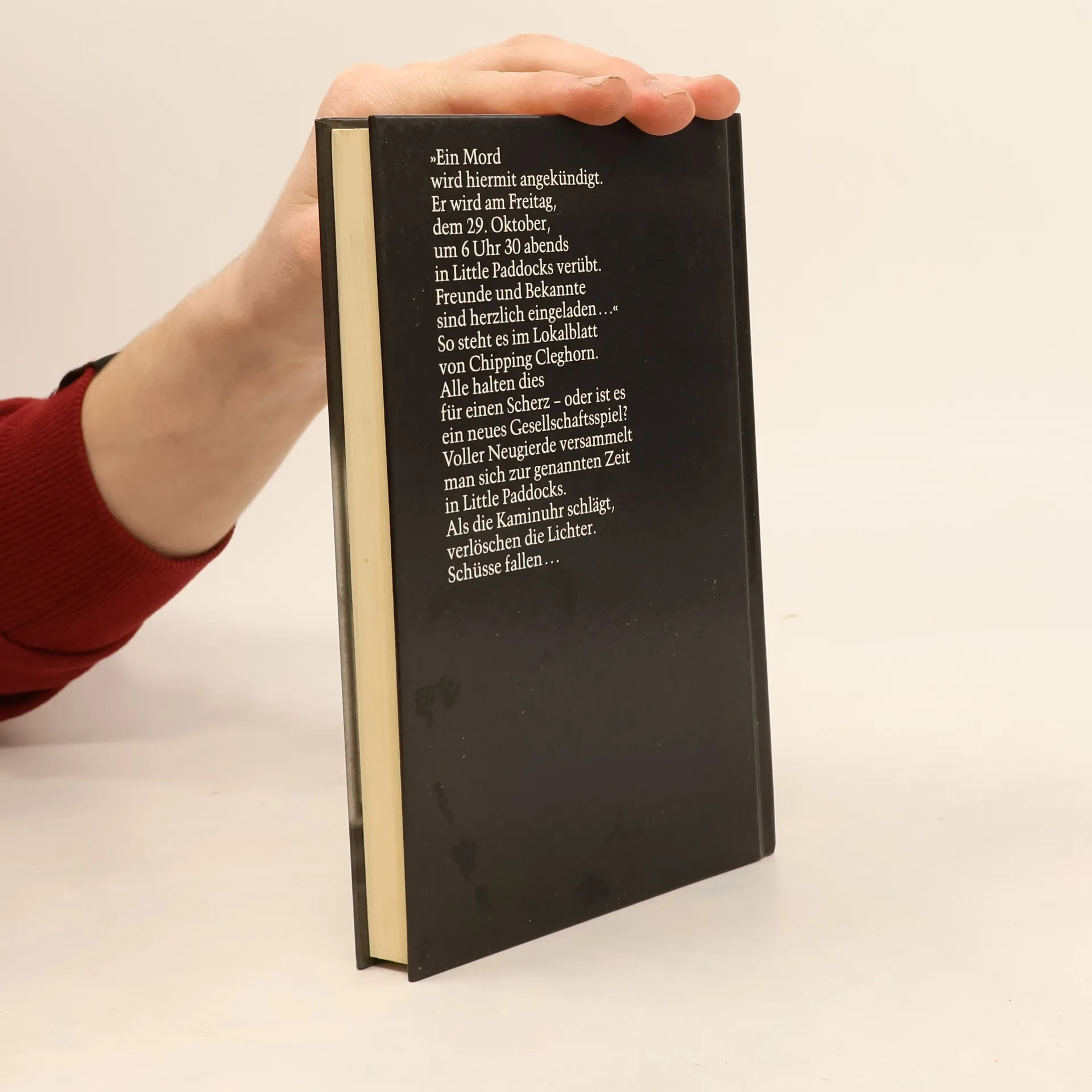 »Am Freitag, den 29. Oktober, wird in Little Paddocks um 18.30 Uhr ein Mord stattfinden. Freunde werden gebeten, diesen Hinweis als Einladung aufzufassen.« So steht es in einer Anzeige im Lokalblatt des Städtchens Chipping Cleghorn. Die Bewohner sind irritiert, aber auch neugierig. In Scharen strömen sie zum Gutshaus. Während ihnen Sherry gereicht wird, geht plötzlich das Licht aus, und ein Schuss fällt. Als das Licht wieder angeht, offenbart sich ein grausames Bild. Miss Marples Beobachtungsgabe ist gefragt, um dieses mörderische Spiel zu durchschauen.