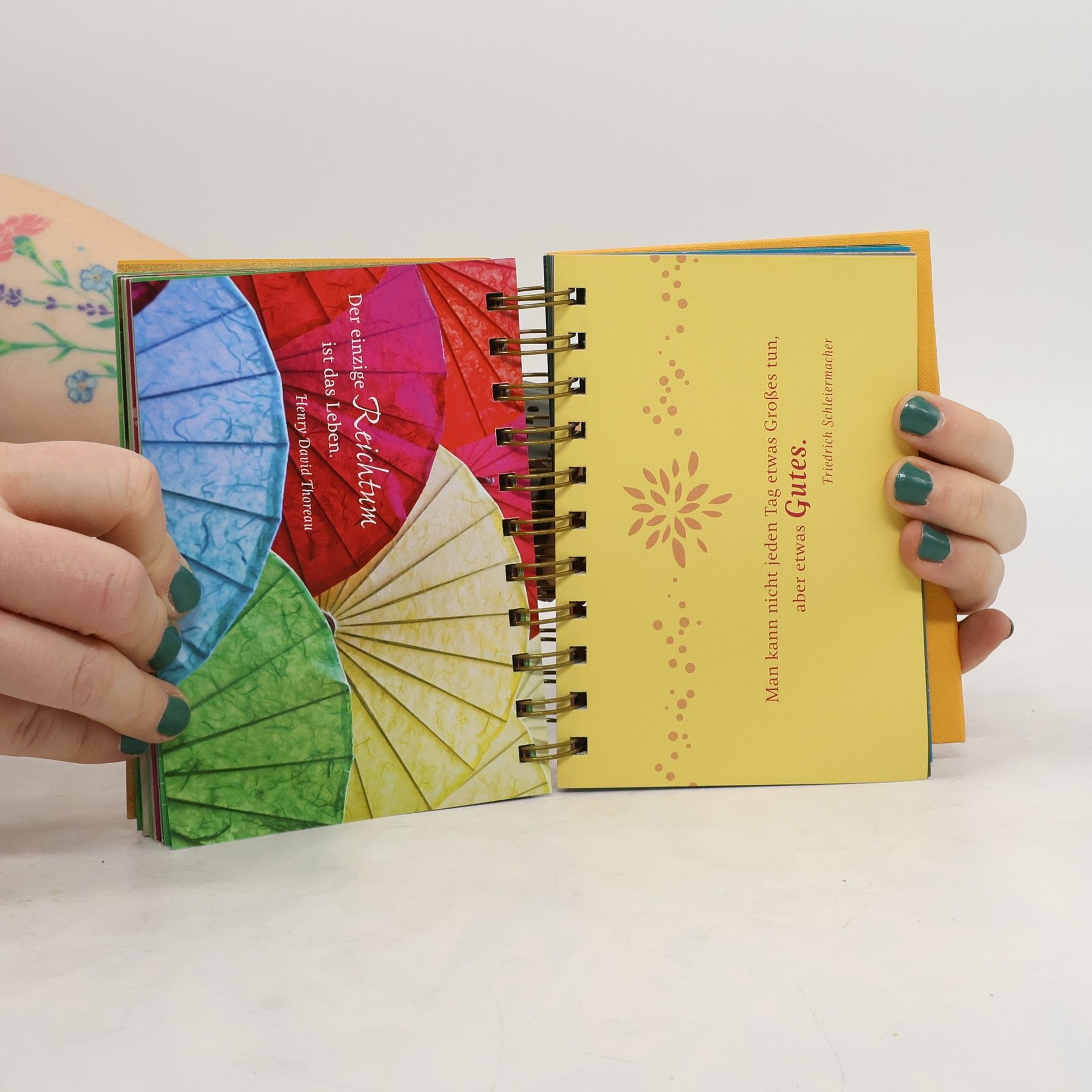 Die Erfolgsgeschichte geht weiter: Die '365 Tage'-Aufsteller von arsEdition haben inzwischen viele Nachahmer gefunden, jedoch ist keiner so überzeugend wie das Original. '365 Tage Sonne im Herzen' hält für jeden Tag des Jahres eine individuell gestaltete Seite bereit, die ein 'Tagesmotto' übermittelt. Die bunte Mischung von Sprüchen und Zitaten zum Thema Sonnenschein sowie das abwechslungsreiche Design sorgen schon beim Umblättern immer wieder aufs Neue für gute Laune. Ob auf dem Schreibtisch, Nachttisch oder im Regal - die ausgewählten Zitate und Fotografien in diesem Aufsteller sind ein Lichtblick für jeden Tag des Jahres. Das Original ist die beste Wahl - um sich selbst eine Freude zu machen oder als Geschenk für jeden Anlass.
