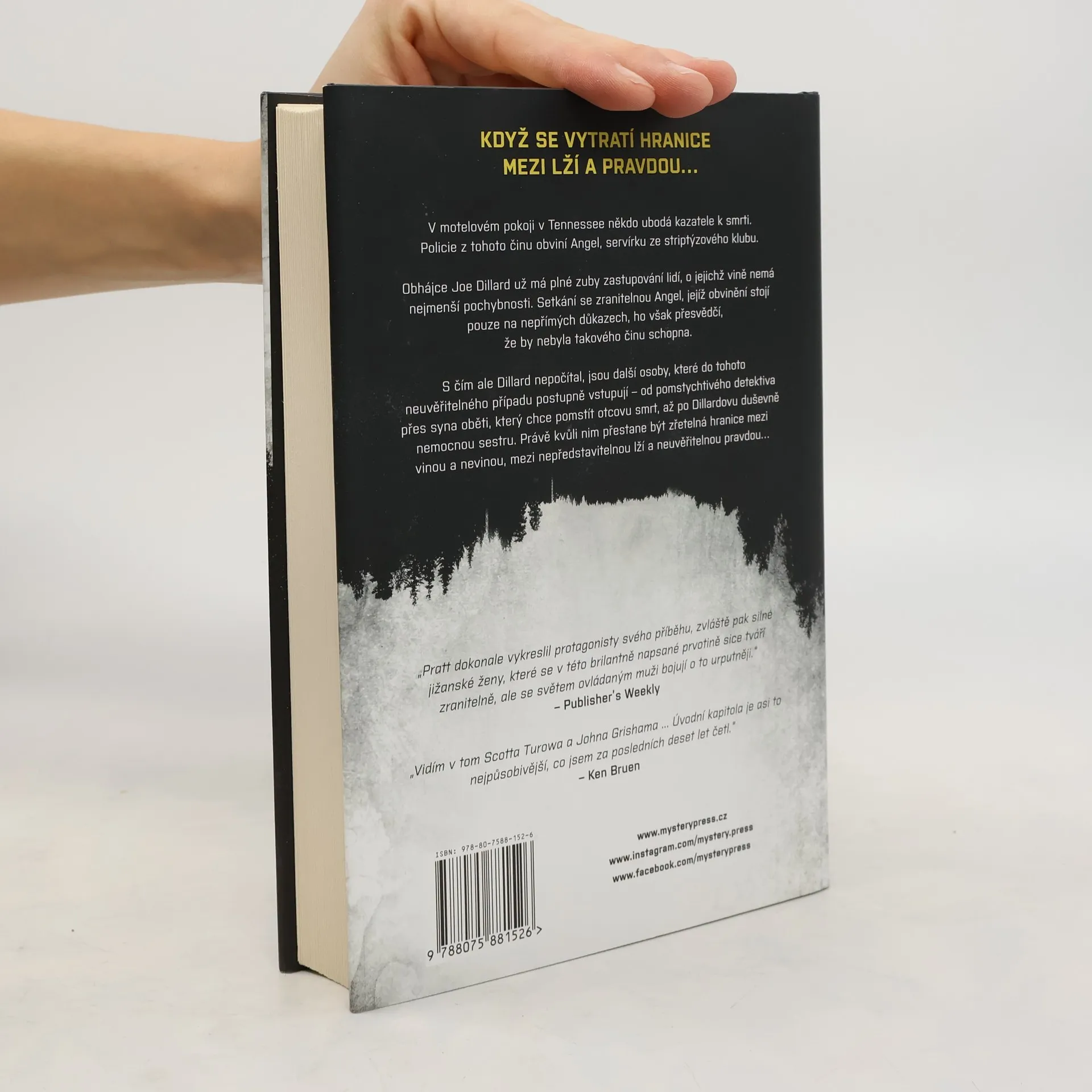 KDYŽ SE VYTRATÍ HRANICE MEZI LŽÍ A PRAVDOU… V motelovém pokoji v Tennessee někdo ubodá kazatele k smrti. Policie z tohoto činu obviní Angel, servírku ze striptýzového klubu. Obhájce Joe Dillard už má plné zuby zastupování lidí, o jejichž vině nemá nejmenší pochybnosti. Setkání se zranitelnou Angel, jejíž obvinění stojí pouze na nepřímých důkazech, ho však přesvědčí, že by nebyla takového činu schopna. S čím ale Dillard nepočítal, jsou další osoby, které do tohoto neuvěřitelného případu postupně vstupují – od pomstychtivého detektiva přes syna oběti, který chce pomstít otcovu smrt, až po Dillardovu duševně nemocnou sestru. Právě kvůli nim přestane být zřetelná hranice mezi vinou a nevinou, mezi nepředstavitelnou lží a neuvěřitelnou pravdou… _____ „Pratt dokonale vykreslil protagonisty svého příběhu, zvláště pak silné jižanské ženy, které se v této brilantně napsané prvotině sice tváří zranitelně, ale se světem ovládaným muži bojují o to urputněji.“ – Publisher’s Weekly „Vidím v tom Scotta Turowa a Johna Grishama ... Úvodní kapitola je asi to nejpůsobivější, co jsem za posledních deset let četl.“ – Ken Bruen