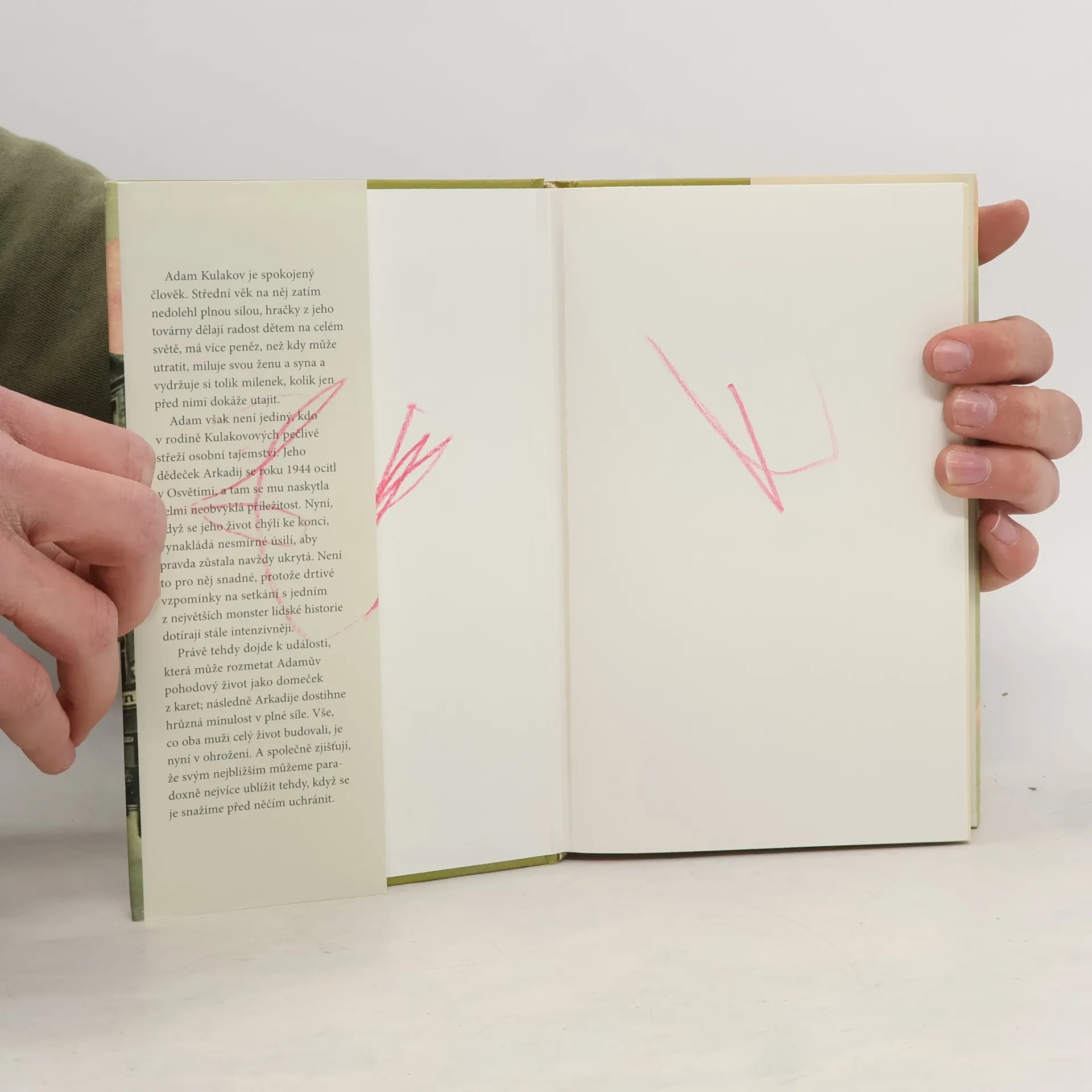 Adam Kulakov je spokojený člověk. Střední věk na něj zatím nedolehl plnou silou, hračky z jeho továrny dělají radost dětem na celém světě, má více peněz, než kdy může utratit, miluje svou ženu a syna a vydržuje si tolik milenek, kolik jen před nimi dokáže utajit. Adam však není jediný, kdo v rodině Kulakovových pečlivě střeží osobní tajemství. Jeho dědeček Arkadij se roku 1944 ocitl v Osvětimi, a tam se mu naskytla velmi neobvyklá příležitost. Nyní, když se jeho život chýlí ke konci, vynakládá nesmírné úsilí, aby pravda zůstala navždy ukrytá. Není to pro něj snadné, protože drtivé vzpomínky na setkání s jedním z největších monster lidské historie dotírají stále intenzivněji. Právě tehdy dojde k události, která může rozmetat Adamův pohodový život jako domeček z karet; následně Arkadije dostihne hrůzná minulost v plné síle. Vše, co oba muži celý život budovali, je nyní v ohrožení. A společně zjišťují, že svým nejbližším můžeme paradoxně nejvíce ublížit tehdy, když se je snažíme před něčím uchránit.