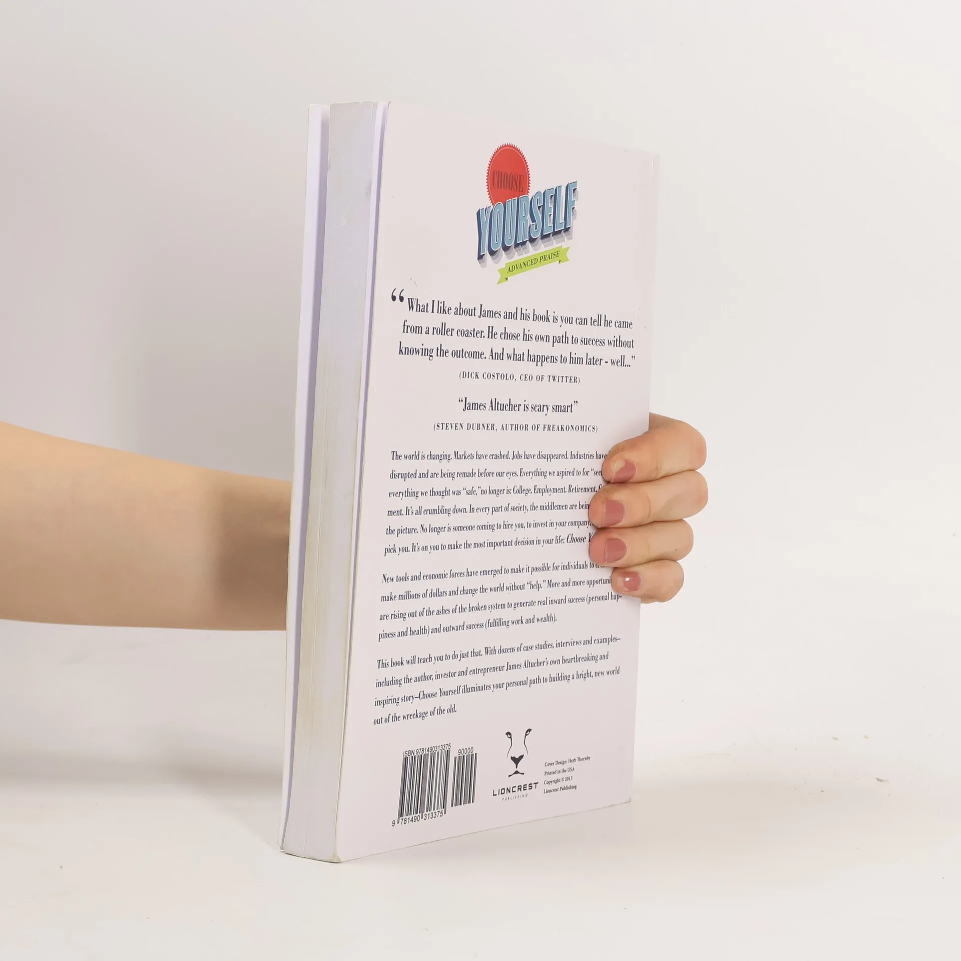 The world is changing. Markets have crashed. Jobs have disappeared. Industries have been disrupted and are being remade before our eyes. Everything we aspired to for “security,” everything we thought was “safe,” no longer is: College. Employment. Retirement. Government. It's all crumbling down. In every part of society, the middlemen are being pushed out of the picture. No longer is someone coming to hire you, to invest in your company, to sign you, to pick you. It's on you to make the most important decision in your life: Choose Yourself. New tools and economic forces have emerged to make it possible for individuals to create art, make millions of dollars and change the world without “help.” More and more opportunities are rising out of the ashes of the broken system to generate real inward success (personal happiness and health) and outward success (fulfilling work and wealth). This book will teach you to do just that. With dozens of case studies, interviews and examples–including the author, investor and entrepreneur James Altucher's own heartbreaking and inspiring story–Choose Yourself illuminates your personal path to building a bright, new world out of the wreckage of the old.